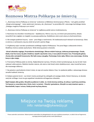 Rozmowa Mistrza Polikarpa ze śmiercią 1. „Rozmowę mistrza Polikarpa ze śmiercią” znaleziono w Bibliotece Seminaryjnej w Płocku – tam gdzie przekład „Skargi umierającego”. Autor pieśni jest nieznany, ale „Rozmowa” to przeróbka XIV- wiecznego łacioskiego tekstu „Dialogus magistra Polycarpi cum morte”. 2. „Rozmowa mistrza Polikarpa ze śmiercią” to najdłuższy polski wiersz średniowieczny. 3. Rozmowa ma charakter moralistyczno – dydaktyczny. Wiersz uczy nas, że śmierd jest powszechna, dotyka wszystkich bez względu na majątek czy pozycję społeczną. Dodatkowo wiersz jest satyrą na duchowieostwo. 4. We wstępie podmiot liryczny - autor - prosi Boga o natchnienie. W średniowiecznych tekstach to konwencja. Słota w wierszu o zachowaniu się przy stole też prosił o pomoc Boga. 5. W głównej części narrator przedstawia wielkiego mędrca Polikarpusa. Ten prosi Boga o zobaczenie śmierci. Modlitwy mistrza zostały wysłuchane. Widzi dziwną postad w kościele. Uźrzał człowieka nagiego, Przyrodzenia niewieściego, Obraza wielmi kryta go, Łoktuszą przepasanego. Chuda, blada, kryt lice Łszczy się jako miednica; Upadł ci jej koniec nosa, Z oczu płynie krwawa rosa. Przewiązała głowę chustą Jako samojedź krzywousta; Nie było warg u jej gęby, Poziewając kryta zęby; Miece oczy zawracając, Groźną kosę w ręku mając. 6. Przerażony Polikarp pada na ziemię. Najbardziej boi się kosy. W koocu śmierd przekonuje go, by się nie bał i każe zadawad sobie pytania. Niektóre bardzo naiwne, ale wiersz miał służył celom dydaktycznym, więc musiał byd jasny dla masowego odbiorcy. 7. Na pytanie o pochodzenie śmierd mówi, że żyje od czasów Adama i Ewy i to zjedzenie jabłka z zakazanego drzewa zaraziło ludzkośd śmiercią. 8. Kolejne pytanie brzmi - czy śmierd można przekupid by odstąpiła od swojego dzieła. Śmierd tłumaczy, że dostała swój dar od Boga i musi mu go wypełniad niezależnie od bogactwa człowieka. Bądź książęta albo grabie, Wszytki ja pobierze k sobie. Ja z krola koronę semknę, Za włosy j i pod kosę wemknę; Też bywam w cesarskiej sieni, Zimie, lecie i w jesieni. Filozofy i gwiazdarze, Wszytki na swej stawiam sparze — Rzemieślniki, kupce i oracze, Każdy przed mą kosą skacze; Prawa autorskie zastrzeżone. Wykorzystanie materiałów do jakiegokolwiek celu poza użytkiem prywatnym, w całości lub we fragmencie, wymaga pisemnej zgody portalu www.lykwiedzy.pl Przypomina, że to ona zabrała Annasza, Kajfasza, Judasza, a nawet Jezusa. Tyle, że tylko Jezus zwyciężył jej moc. Alem kosy naruszyła, Gdym Krystusa umorzyła, Bo w niem była Boska siła. Ten jeden mą kosę zwyciężył, Iż trzeciego dnia ożył; Z tegom się żywotem biedziła, Potem jużem wszytkę moc straciła. 9. Polikarp pyta śmied z kim będzie się przyjaźnid gdy zgładzi wszystkich ludzi. Śmierd bardzo zdenerwowało to pytanie. Chciała nawet uciąd głowę Polikarpowi. Dziwi się, że mistrz niczego nie rozumie. Ona kocha ludzki grzech. W grzechu się ludzkiem kocham, A tego nigdy nie przeniecham. Duchownego i wieckiego, Zbawię żywota każdego, A każdego morzę, łupię, O to nigdy nie pokupię: Kanonicy i proboszcze Będą w mojej szkole jeszcze, I plebani s miąszą szyją. 10. Kolejne pytanie dotyczy lekarzy. Po co są - skoro ich zioła nie ratują przed śmiercią. Polikarp pyta też, czy można przed śmiercią gdzieś się ukryd. Śmierd odpowiada. Chcesz-li tego skosztowad, Dam ci się w żelezie skowad I też w ziemi zakopad – Ale cię pewno potrzepię, Jedno sobie kosę sklepię. Uwijaj się, jako umiesz, Aza mej mocy ujdziesz. Jużem ci naostrzyła kosę, A darmo jej nie podnoszę, Ciebie ją podgolid muszę. 11. Przestraszony Polikarp błaga o litośd. Śmierd jest zdziwiona dlaczego mistrz nie chce oddad życia skoro i tak go to czeka. Poza tym dobrzy ludzie nie powinni się bad. Bo dobremu mało pbici, Acz umrze, nic nie straci: Pozbędzie świecskicj żałości, Pojdzie w niebieskie radości. 12. Autor tekstu sporo miejsca poświęca klerowi, który również grzeszy i również padnie ofiarą kosy. Śmierd demaskuje zepsucie mnichów. Prawa autorskie zastrzeżone. Wykorzystanie materiałów do jakiegokolwiek celu poza użytkiem prywatnym, w całości lub we fragmencie, wymaga pisemnej zgody portalu www.lykwiedzy.pl