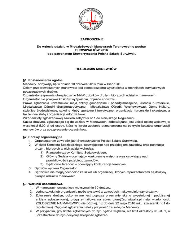 ZAPROSZENIE Do wzięcia udziału w Młodzieżowych Manewrach Terenowych o puchar SURWIWALIÓW 2016 pod patronatem Stowarzyszenia Polska Szkoła Surwiwalu REGULAMIN MANEWRÓW §1. Postanowienia ogólne Manewry odbywają się w dniach 10 czerwca 2016 roku w Biedrusku. Celem przeprowadzanych manewrów jest ocena poziomu wyszkolenia w technikach survivalowych poszczególnych drużyn. Organizator zapewnia ubezpieczenie NNW członków drużyn, biorących udział w manewrach. Organizator nie pokrywa kosztów wyżywienia, dojazdu i powrotu. Prawo zgłaszania uczestników mają szkoły gimnazjalne i ponadgimnazjalne, Ośrodki Kuratorskie, Młodzieżowe Ośrodki Socjoterapeutyczne i Młodzieżowe Ośrodki Wychowawcze, Domy Kultury, świetlice środowiskowe, szkolne kluby sportowe i turystyczne, organizacje harcerskie i skautowe, a także inne kluby i organizacje młodzieżowe. Wzór ankiety zgłoszeniowej zawiera załącznik nr 1 do niniejszego Regulaminu. Każda drużyna, zgłaszająca się do udziału w Manewrach, zobowiązana jest uiścić opłatę wpisową w wysokości 5,00 zł od osoby, która to kwota zostanie przeznaczona na pokrycie kosztów organizacji manewrów oraz ubezpieczenie uczestników. §2. Sprawy organizacyjne 1. Organizatorem zawodów jest Stowarzyszenie Polska Szkoła Surwiwalu. 2. W skład Komitetu Sędziowskiego, czuwającego nad przebiegiem zawodów oraz punktacją drużyn, biorących w nich udział wchodzą: 1) Przewodniczący Komitetu Sędziowskiego, 2) Główny Sędzia – oceniający konkurencję wstępną oraz czuwający nad prawidłowością przebiegu zawodów, 3) Sędziowie terenowi – oceniający konkurencje terenowe. 3. Sędziów wybiera Organizator. 4. Sędziowie nie mogą pochodzić ze szkół lub organizacji, których reprezentantami są drużyny, biorące udział w manewrach. §3. Warunki uczestnictwa. 1. W manewrach uczestniczy maksymalnie 30 drużyn,. 2. Jedna szkoła lub organizacja może wystawić w zawodach maksymalnie trzy drużyny. 3. Zgłoszenie drużyn, dokonywane jest poprzez przesłanie skanu wypełnionej i podpisanej ankiety zgłoszeniowej, drogą e-mailową na adres [email protected] (tytuł wiadomości: ZGŁOSZENIE NA MANEWRY) nie później, niż do dnia 22 maja 2016 roku. (załącznik nr 1 do regulaminu). Oryginał zgłoszenia należy przywieźć ze sobą na Manewry. 4. W przypadku, gdy liczba zgłoszonych drużyn będzie większa, niż limit określony w ust. 1, o uczestnictwie drużyn decyduje kolejność zgłoszeń. 5. Jeśli liczba zgłoszonych sekcji w dniu 22.05.2016 będzie mniejsza od 30, szkoły i organizacje, które zgłosiły swoje sekcje do udziału w zawodach, mogą zgłosić kolejne, jednak nie później, niż do 30.05.2016 r. lub do osiągnięcia liczby zgłoszeń na poziomie 30 drużyn. 6. Organizator powiadamia zakwalifikowane drużyny o terminie i sposobie uiszczenia opłaty wpisowej. Nieuiszczenie opłaty wpisowej w terminie skutkuje skreśleniem danej drużyny z listy uczestników. §4. Drużyna. 1. Każda drużyna, biorąca udział w manewrach składa się z trzech do pięciu uczestników, reprezentujących zgłaszającą ich szkołę lub organizację. 2. Uczestnicy wybierają spośród siebie kapitana drużyny, który: 1) kieruje drużyną podczas manewrów, 2) odpowiada za znajomość przez uczestników programu i regulaminu manewrów, 3) odpowiada za przestrzeganie zasad i warunków bezpieczeństwa w czasie odbywania manewrów. §5. Zasady oceniania. 1. Konkurencja wstępna jest punktowana w zakresie 0 – 10 punktów. 2. W przedziale 0 – 10 punktów są punktowane: 1) konkurencje terenowe, 2) zadania z rozpoznawania. 3. Dodatkowe 10 punktów można uzyskać w klasyfikacji ogólnej czasu realizacji konkurencji terenowych przez wszystkie drużyny, biorące udział w manewrach. Podstawą klasyfikacyjną jest czas pomiędzy startem danej drużyny, a zaliczeniem zadania z rozpoznania. 4. Miejsca w klasyfikacji, o której mowa w ust. 3, są punktowane zgodnie ze schematem: 1) miejsce pierwsze, z najkrótszym czasem realizacji zadań terenowych – 10 punktów, 2) miejsce drugie – 9 punktów, 3) każde kolejne miejsce otrzymuje o jeden punkt mniej, niż miejsce je poprzedzające, 4) miejsce 11 i dalsze otrzymują zero punktów. 5. W manewrach można uzyskać maksymalnie 120 punktów. 6. Konkurencją wstępną jest pisemny test wiedzy z zakresu edukacji dla bezpieczeństwa i terenoznawstwa. Test jest wypełniany drużynowo - za każdą poprawną odpowiedź udzieloną w teście, drużyna otrzymuje jeden punkt. 7. Konkurencjami terenowymi są: 1) wykorzystanie w praktyce wiedzy przeciwpożarowej w symulowanej akcji, 2) udzielanie pierwszej pomocy w symulowanej akcji, 3) wiązanie węzłów (co najmniej 5 węzłów z 10 podanych), 4) rozpalanie ognia różnymi sposobami (co najmniej 3 sposoby), 5) pokonywanie przeszkody wodnej, 6) zmierzenie wysokości wskazanego drzewa/budynku, 7) strzelanie z 5,6mm kbks lub 4,5mm karabin pneumatyczny do metalowych tarcz sylwetkowych, 8) strzelanie z łuku bez celownika (po grocie) do tarczy z odległości 15 m. 9) zmierzenie szerokości rzeki lub innej przeszkody wodnej, 10) miotanie z procy tradycyjnej (oceniamy kierunkowość). §6. Przebieg Manewrów. 1. Rejestracja drużyn na Manewry rozpoczyna się o godzinie 8:30. Kapitan drużyny, przed godziną startu zgłasza drużynę w sekretariacie manewrów i losuje numer startowy, który jest jednocześnie numerem stanowiska, przy którym drużyna, realizuje konkurencję wstępną (test). 2. Bezpośrednio po losowaniu, Prezes Komitetu Sędziowskiego zapoznaje uczestników z zasadami uczestnictwa w Manewrach oraz zagadnieniami dotyczącymi zadania z rozpoznawania. 3. Konkurencja wstępna rozpoczyna się o godzinie 9:30. Kapitanowie drużyn, otrzymują od Głównego Sędziego arkusze testowe, po czym udają się do wyznaczonego punktu i 4. 5. 6. 7. 8. przystępują wraz ze swoją drużyną do rozwiązywania testu. Czas na rozwiązanie testu wynosi