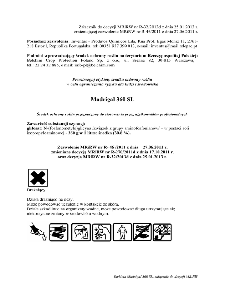 Załącznik do decyzji MRiRW nr R-32/2013d z dnia 25.01.2013 r. zmieniającej zezwolenie MRiRW nr R-46/2011 z dnia 27.06.2011 r. Posiadacz zezwolenia: Inventus - Produtos Quimicos Lda, Rua Prof. Egas Moniz 11, 2765218 Estoril, Republika Portugalska, tel: 00351 937 399 013, e-mail: [email protected] Podmiot wprowadzający środek ochrony roślin na terytorium Rzeczypospolitej Polskiej: Belchim Crop Protection Poland Sp. z o.o., ul. Sienna 82, 00-815 Warszawa, tel.: 22 24 32 885, e mail: [email protected] Przestrzegaj etykiety środka ochrony roślin w celu ograniczenia ryzyka dla ludzi i środowiska Madrigal 360 SL Środek ochrony roślin przeznaczony do stosowania przez użytkowników profesjonalnych Zawartość substancji czynnej: glifosat: N-(fosfonometylo)glicyna /związek z grupy aminofosfonianów/ – w postaci soli izopropyloaminowej - 360 g w 1 litrze środka (30,8 %). Zezwolenie MRiRW nr R- 46 /2011 z dnia 27.06.2011 r. zmienione decyzją MRiRW nr R-270/2011d z dnia 17.10.2011 r. oraz decyzją MRiRW nr R-32/2013d z dnia 25.01.2013 r. Drażniący Działa drażniąco na oczy. Może powodować uczulenie w kontakcie ze skórą. Działa szkodliwie na organizmy wodne, może powodować długo utrzymujące się niekorzystne zmiany w środowisku wodnym. Etykieta Madrigal 360 SL, załącznik do decyzji MRiRW I OPIS DZIAŁANIA Madrigal 360 SL jest środkiem chwastobójczym w formie koncentratu do sporządzania roztworu wodnego, stosowany nalistnie, przeznaczony do zwalczania perzu oraz innych chwastów jednoliściennych i dwuliściennych (jednorocznych i wieloletnich) na polach uprawnych. Środek przeznaczony jest do stosowania przy użyciu opryskiwaczy polowych i ręcznych. II DZIAŁANIE NA CHWASTY Madrigal 360 SL jest dolistnym herbicydem o działaniu systemicznym. Pobierany jest przez zielone części roślin (liście, zielone pędy i niezdrewniałą korę), a następnie przemieszcza się po całej roślinie i dociera do jej części podziemnych (korzenie, rozłogi itp.) powodując ich zamieranie. Pierwsze objawy działania środka (żółknięcie i więdnięcie) są widoczne po upływie 7-10 dni od zabiegu. Całkowite zamieranie roślin następuje po około 3 tygodniach. Wysoka temperatura i wilgotność powietrza oraz silne nasłonecznienie przyspieszają działanie środka. Środek jest rozkładany przez mikroorganizmy glebowe. Chwasty wrażliwe: perz właściwy, maruna bezwonna Chwasty średniowrażliwe: bylica pospolita, ostrożeń polny III ZASTOSOWANIE ŚRODKA 1. przed zbiorem pszenicy ozimej w celu zwalczenia perzu oraz innych chwastów a także ułatwienia zbioru. Pszenica ozima Środek stosować w fazie dojrzałości woskowej ziarna, gdy wilgotność ziarna wynosi 20-30 %, to jest na 10-14 dni przed przewidywanym zbiorem. W momencie wykonywania zabiegu chwasty powinny być zielone i znajdować się w fazie intensywnego rozwoju. Maksymalna dawka dla jednorazowego zastosowania: 4,0 l/ha Zalecana dawka dla jednorazowego zastosowania: 3,0-4,0 l/ha Zalecana ilość wody: 200-300 l wody. UWAGI W okresie występowania wysokich temperatur w ciągu dnia zabieg wykonać rano lub późnym popołudniem. Zbiór kombajnowy wykonywać pod kątem prostym lub w kierunku przeciwnym do przejazdu opryskiwacza. Nie stosować środka w pszenicy ozimej z wsiewkami oraz w pszenicy ozimej przeznaczonej na materiał siewny. Słomę pszenicy ozimej nie używać jako podłoża ani podściółki ogrodniczej; można ją używać jako paszy lub podściółki dla zwierząt. 2. Po zbiorze roślin uprawnych, przed rozpoczęciem upraw pożniwnych w celu zwalczania perzu właściwego i innych chwastów. Pola uprawne Środek stosować od połowy sierpnia do późnej jesieni na zielone intensywnie rosnące chwasty. Po zbiorze rośliny uprawnej a przed zastosowaniem środka nie wykonywać żadnych zabiegów uprawowych. W momencie zabiegu rośliny perzu powinny mieć wysokość 10-25 cm i wytworzyć co najmniej 3-4, w pełni wykształcone, liście. Etykieta Madrigal 360 SL, załącznik do decyzji MRiRW Jednoroczne chwasty jednoliścienne powinny mieć co najmniej 5 cm wysokości, a chwasty dwuliścienne powinny w pełni wykształcić dwa liście właściwe. Maksymalna dawka dla jednorazowego zastosowania: 4,0 l/ha Zalecana dawka dla jednorazowego zastosowania: 3,0-4,0 l/ha Zalecana ilość wody: 200-300 l wody 3. PRECIWWSKZANIA Środka nie stosować: − przed wschodami chwastów, − na liście, pędy oraz nie zdrewniałą korę drzew i krzewów ze względu na możliwość − uszkodzenia roślin. − na rośliny mokre, − przed spodziewanym deszczem (opad występujący przed upływem 6 godzin po − opryskiwaniu może obniżyć skuteczność zabiegu). − podczas wiatru stwarzającego możliwość zwiewania cieczy użytkowej Nie dopuścić do znoszenia cieczy użytkowej na sąsiednie rośliny uprawne i tereny sąsiadujące z terenem opryskiwanym. 4. NASTĘPSTWO ROŚLIN Na polu, na którym stosowano Madrigal 360 SL można uprawiać wszystkie rośliny. Zabiegi uprawowe, siew lub sadzenie można rozpocząć, gdy na zwalczanych chwastach wystąpiły objawy działania środka (żółknięcie i więdnięcie), jednak nie wcześniej niż po 5-7 dniach. 5. OKRES OD OSTATNIEGO ZASTOSOWANIA ŚRODKA NA ROŚLINY DO DNIA W KTÓRYM MOŻNA SIAĆ LUB SADZIĆ ROŚLINY UPRAWIANE NASTĘPCZO 5-7 dni IV SPORZĄDZANIE CIECZY UŻYTKOWEJ Przed przystąpieniem do sporządzenia cieczy użytkowej dokładnie ustalić potrzebną jej ilość. Odmierzoną ilość środka wlać do zbiornika opryskiwacza napełnionego częściowo wodą (z włączonym mieszadłem). Opróżnione opakowanie przepłukać trzykrotnie wodą, a popłuczyny wlać do zbiornika opryskiwacza z cieczą użytkową. Następnie zbiornik opryskiwacza uzupełnić wodą do potrzebnej ilości. Po wlaniu środka do zbiornika opryskiwacza nie wyposażonego w mieszadło hydrauliczne ciecz w zbiorniku mechanicznie wymieszać. W przypadku przerw w opryskiwaniu, przed ponownym przystąpie