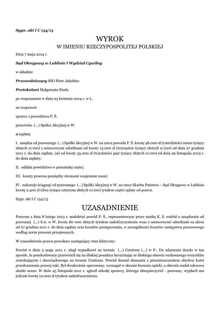 Sygn. akt I C 154/13 WYROK W IMIENIU RZECZYPOSPOLITEJ POLSKIEJ Dnia 7 maja 2014 r. Sąd Okręgowy w Lublinie I Wydział Cywilny w składzie: Przewodniczący SSO Piotr Jakubiec Protokolant Małgorzata Siuda po rozpoznaniu w dniu 23 kwietnia 2014 r. w L. na rozprawie sprawy z powództwa P. Ś. przeciwko (...) Spółce Akcyjnej w W. o zapłatę I. zasądza od pozwanego (...) Spółki Akcyjnej w W. na rzecz powoda P. Ś. kwotę 48.000 zł (czterdzieści osiem tysięcy złotych 0/100) z ustawowymi odsetkami od kwoty 13.000 zł (trzynaście tysięcy złotych 0/100) od dnia 27 grudnia 2011 r. do dnia zapłaty, zaś od kwoty 35.000 zł (trzydzieści pięć tysięcy złotych 0/100) od dnia 29 listopada 2013 r. do dnia zapłaty; II. oddala powództwo w pozostałej części; III. koszty procesu pomiędzy stronami wzajemnie znosi; IV. nakazuje ściągnąć od pozwanego (...) Spółki Akcyjnej w W. na rzecz Skarbu Państwa – Sąd Okręgowy w Lublinie kwotę 2.400 zł (dwa tysiące czterysta złotych 0/100) tytułem części opłaty od pozwu. Sygn. akt I C 154/13 UZASADNIENIE Pozwem z dnia 8 lutego 2013 r. małoletni powód P. Ś., reprezentowany przez matkę K. Ś. wniósł o zasądzenie od pozwanej (...) S.A. w W. kwoty 80 000 złotych tytułem zadośćuczynienia wraz z ustawowymi odsetkami za okres od 27 grudnia 2011 r. do dnia zapłaty oraz kosztów postępowania, w szczególności kosztów zastępstwa procesowego według norm prawem przepisanych. W uzasadnieniu pozwu powołano następujący stan faktyczny: Powód w dniu 5 maja 2011 r. uległ wypadkowi na terenie (...) Centrum (...) w P.. Do zdarzenia doszło w ten sposób, że poszkodowany przewrócił się na śliskiej posadzce korzystając ze śliskiego obuwia wydawanego wszystkim zwiedzającym i obowiązkowego na terenie Centrum. Powód doznał złamania z przemieszczeniem obydwu kości przedramienia prawej ręki. Był dwukrotnie operowany, wymagał w okresie leczenia opieki, a obecnie nadal odczuwa skutki urazu. W dniu 25 listopada 2011 r. zgłosił szkodę sprawcy, którego ubezpieczyciel - pozwany, wypłacił mu jedynie kwotę 10.000 zł tytułem zadośćuczynienia. W odpowiedzi na pozew pozwana (...) S.A. wniosła o oddalenie powództwa w całości wraz z zasądzeniem od powoda kosztów postępowania wraz z kosztami zastępstwa procesowego i opłatą od pełnomocnictwa według norm prawem przewidzianych. Ponadto pozwana przyznała, iż ubezpieczała sprawdzę wypadku, w którym szkodę odniósł powód oraz wypłaciła mu stosowne zadośćuczynienie. Pozwany przyznał, że w dniu 28 listopada 2011 r. powód zgłosił szkodę i zażądał kwoty 25.000 zł tytułem zadośćuczynienia. Pozwany w dniu 27 grudnia 2011 r. wypłacił na rzecz poszkodowanego kwotę 10.000 zł tytułem zadośćuczynienia. Następnie w dniu 17 lutego 2012 r. dopłacił z tego samego tytułu kwotę 2.000 zł. W ocenie pozwanego kwota 12.000 zł jest odpowiednia do rozmiaru krzywdy powoda. Ponadto pozwany stał na stanowisku, iż przyznana kwota zadośćuczynienia ma charakter całościowy i obejmuje wszystkie cierpienia fizyczne i psychiczne poszkodowanego, jak również te, które mogą pojawić się w przyszłości. Suma ta w pełni odpowiada skutkom przedmiotowego wypadku, przedstawia ekonomicznie odczuwalną wartość i utrzymana jest w granicach stosownych do aktualnych warunków życiowych społeczeństwa. Przy ustalaniu wysokości świadczenia wzięto pod uwagę wszelkie okoliczności wypadku, a także takie czynniki jak płeć, wiek, stopień trwałej utraty zdrowia oraz trwałe i dające się przewidzieć skutki rozstroju zdrowia w przyszłości, długotrwałość i uciążliwość leczenia. Sąd Okręgowy ustalił następujący stan faktyczny: P. Ś. w dniu 5 maja 2011 r. uległ wypadkowi na terenie (...) Centrum (...) w P.. Do zdarzenia doszło w ten sposób, że poszkodowany przewrócił się na śliskiej posadzce korzystając ze śliskiego obuwia wydawanego wszystkim zwiedzającym i obowiązkowego na terenie Centrum. (okoliczność bezsporna) Poszkodowany był hospitalizowany w Szpitalu (...) w K., gdzie podjęto próbę repozycji złamania. Doznał złamania z przemieszczeniem obydwu kości przedramienia prawej ręki. Wobec braku możliwości pełnej repozycji poszkodowanego zakwalifikowanego do leczenia operacyjnego. W dniu 7 maja 2011 r. w (...) Szpitalu (...) w L. przeprowadzono zabieg repozycji kości przedramienia ze stabilizacją śródszpikową kości promieniowej i łokciowej prętami TEN. Do domu chłopiec został wypisany w dniu 9 maja 2011 r. z zaleceniem elewacji, chłodzenia, ćwiczenia palców stawu łokciowego i mięśni obręczy barkowej. W dniu 22 maja 2011 r. P. Ś. był leczony na (...) w R. z powodu powikłania - odczynu zapalnego kaletki łokciowej spowodowanego podrażnieniem drutem. W dniu 24 maja 2011 r. usunięto szwy z rany pooperacyjnej. W dniu 1 lutego 2012 r. P. Ś. został ponownie przyjęty do (...) Szpitala (...) w L., gdzie w dniu następnym przeprowadzono zabieg operacyjnego usunięcia prętów stabilizujących zrośnięte złamanie. Pacjenta wypisano w dniu 3 lutego 2012 r. (okoliczności bezsporne, dokumentacja medyczna k. 9-32; Do szkoły P. Ś. wrócił 8 czerwca 2011 r. Długa absencja miała wpływ na jego końcowe oceny, nie był w stanie nadrobić zaległości w nauce. Przed urazem był zdrowy, bardzo sprawny fizycznie, należał do szkolnej drużyny piłkarskiej, z którą reprezentował szkołę w zawodach sportowych. Po wypadku jego sprawność fizyczna się obniżyła, nie należy już do drużyny piłkarskiej. (okoliczność bezsporna, zeznania świadka E. G. – protokół z dnia 29 października 2013 r. 00:15;24, zaświadczenie k. 33) Jako następstwo urazu u P. Ś. pozostały liczne blizny skórne i niewielkie zaburzenia funkcji przedramienia w postaci okresowych dolegliwości bólowych i upośledzenia zgięcia grzbietowego nadgarstka prawego. Poszkodowany odczuwa okresowe dolegliwości podczas zmian p