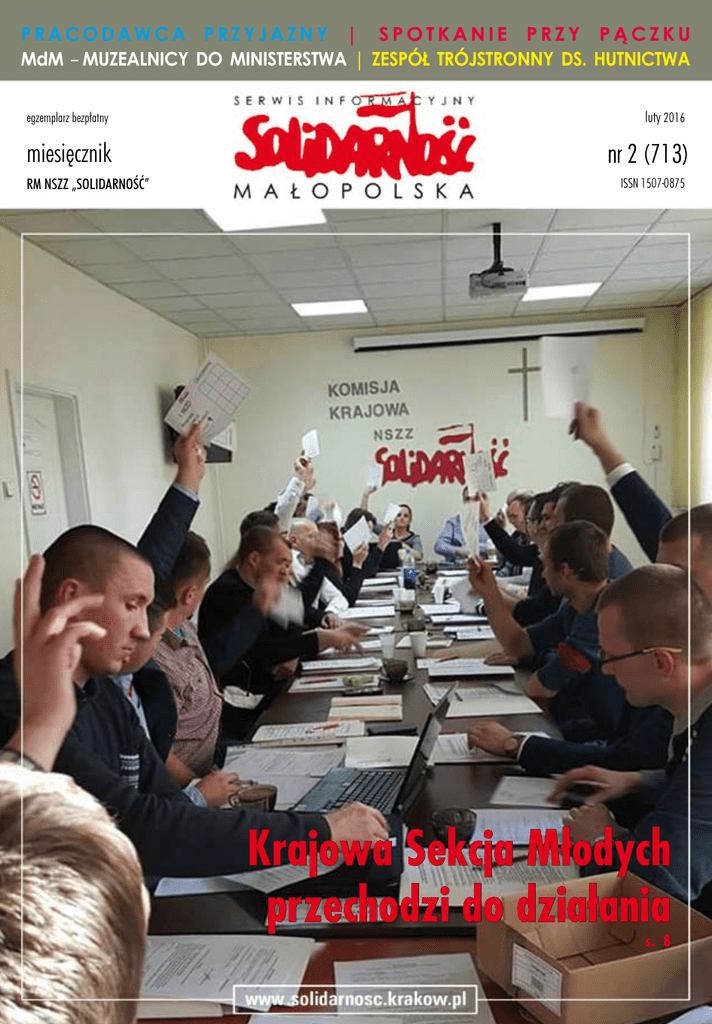 PRACODAWCA PRZYJAZNY | SPOTKANIE PRZY PĄCZKU MdM – MUZEALNICY DO MINISTERSTWA | ZESPÓŁ TRÓJSTRONNY DS. HUTNICTWA egzemplarz bezpłatny miesięcznik RM NSZZ „SOLIDARNOŚĆ” luty 2016 nr 2 (713) ISSN 1507-0875 Krajowa Sekcja Młodych przechodzi do działania s. 8 Spis treści: Plan szkoleń na I półrocze 2016 r. Szkolenia wyjazdowe Willa Salamandra, Krynica, ul. Ludowa 26 30,31 marca-1 kwietnia – Mobbing w miejscu pracy 13-15 kwietnia – Zwolnienia grupowe + sposoby rozwiązywania umów o pracę 11-13 maja – Negocjacje 18-20 maja – Ogólnozwiązkowe Cena szkolenia: 125 pln netto (153,75 pln brutto) Szkolenia stacjonarne Kraków, pl. Szczepański 5, sala 406 18 marca – ZFŚS 29-30 marca – Ogólnozwiązkowe 5-6 kwietnia – Mobbing 7-8 kwietnia – Dyskryminacja 8-9-10 maja – Bycie liderem związkowym – to zobowiązuje! 6-7 czerwca – Profesjonalizm organizacji zakładowej 15-16 czerwca – Negocjacje Szkolenia są bezpłatne. Szkolenie sip Willa Salamandra, Krynica, ul. Ludowa 26 1-3 czerwca Cena szkolenia: 800 pln netto (984 pln brutto). Szkolenie sip Kraków, pl. Szczepański 5, sala 406 25-27 kwietnia Cena szkolenia: 350 pln netto (430,50 pln brutto). Zgłoszenia są przyjmowane w Dziale Szkoleń, pl. Szczepański 5, pok. 403, 404, tel./fax 12 423-12-98, 12 421-60-54 w. 26, email: [email protected]. Zgłoszenia są przyjmowane na podstawie wypełnionego i podpisanego formularza. Ilość miejsc ograniczona - decyduje kolejność zgłoszenia. Więcej na stronie www. solidarnosc.krakow.pl w zakładce Szkolenia. S E R W I S I N F O R M A C Y J N Y Wydawca: Region Małopolski NSZZ „Solidarność”. Redaguje zespół: Joanna Furtak, Adam Gliksman (red. nacz.). Odpowiedzialny ze strony Prezydium: Henryk Łabędź. Projekt graficzny: Fabryka Reklamy, tel. (+48 12) 294 81 80. Skład: Joanna Furtak. Druk: Ekodruk s.c. Nakład 1500. Foto okładka: www.facebook.com/Sekcja Młodych NSZZ „Solidarność” Region Wielkopolska Adres redakcji: Pl. Szczepański 5, 31-011 Kraków, tel./fax: (12) 423 12 98, e-mail: [email protected], ISSN 1507-0875. Uwaga! Redakcja zastrzega sobie prawo wprowadzania zmian w materiałach niezamówionych oraz nie gwarantuje zamieszczenia tekstów autorskich przekazanych w formie nieczytelnej. Numer zamknięto 17 lutego 2016 r. Po następny numer zapraszamy 29 marca 2016 r. Zapraszamy na stronę internetową: www.solidarnosc.krakow.pl 2 SERWIS Aktualności Adam Zyzman Pracodawca przyjazny ......................3 Joanna Brach Spotkanie przy pączku ...................5 Waldek Cieśla Dębica ..........................................6 www.facebook.com/polska-uk.com Polacy o zw. zawodowych w Anglii .......7 Branże A. Murawska, M. Mechaliński, A. Rybicki, B. Spigarska MdM - Muzealnicy do Ministerstwa .....12 Andrzej Gębara Zespół Trójstronny ds. Hutnictwa ........13 Z księgarni Adam Gliksman Kobieca „Solidarność” ....................15 z prac kk ..........................................8 przegląd prasy .....................................10 pomagajmy! .........................................14 Karty rabatowe dla ludzi „S” Stowarzyszenie Sieć Solidarności dołączyło do programu „Biznestank” stacji paliw ORLEN oraz BLISKA. Dzięki karcie zniżkowej podczas tankowania paliw na stacjach Orlen i Bliska (oprócz gazu) zaoszczędzimy 8 groszy na stacjach „Orlen” i 5 groszy na stacjach „Bliska” na każdym litrze paliwa. Koszt karty to jednorazowy wydatek 10 zł. Oszczędzajmy. Jeśli ta akcja się powiedzie, to mamy zamiar wystąpić do innych firm o udzielenie nam opustów i rabatów. Informacje na temat programu można otrzymać w Dziale Informacji i Promocji, pl. Szczepański 5, pok. 404, tel. 12 423-12-98, e-mail: joanna@ solidarnosc.krakow.pl. INFORMACYJNY Nr 2 (713) Aktualności pracodawca przyjazny Celem ogólnopolskiego konkursu jest promowanie pracodawców, którzy wyróżniają się w stosowaniu dobrych praktyk w zakresie przestrzegania przepisów prawa pracy, w szczególności poprzez stabilność zatrudnienia, przestrzeganie zasad bezpieczeństwa i higieny pracy oraz prawa do zrzeszania się w związki zawodowe. Kandydatów zgłaszają podstawowe jednostki organizacyjne „Solidarności”. Wyróżnione firmy szanują prawa pracowników oraz prowadzą u siebie dialog społeczny. Certyfikatem można się posługiwać przez okres trzech lat. Wśród laureatów konkursu w tym roku znalazł się m.in. Instytut Odlewnictwa w Krakowie, dlatego na spotkaniu z kierownictwem tej placówki zapytałem: Co trzeba robić i jak traktować pracowników, by uzyskać taki certyfikat? – Myślę, że recepta jest bardzo prosta: trzeba szanować ludzi – mówi prof. dr hab. inż. Jerzy Sobczak, dyrektor Instytutu Odlewnictwa w Krakowie. – I to nie tylko spektakularnie, gdy trzeba coś osiągnąć, ale w codziennych kontaktach. Wszak w pracy spędzamy większość swojego życia, dlatego uważam, że jeśli nie mogę pracownikowi płacić za pracę tyle, na ile zasługuje i tyle, ile bym chciał, a bardzo bym chciał, tylko nie zawsze mogę, to przynajmniej powinienem zapewnić mu przyjazną atmosferę. Jak widzę, że rodzi się jakiekolwiek zarzewie konfliktu, to uważam, że luty 2016 lepiej go od razu rozładować, niż czekać, aż przemieni się to w poważny problem i spór. Ja po prostu starałem się dotąd wszystkie decyzje podejmować, radząc się moich kolegów i znajdować płaszczyznę porozumienia. – Z punktu widzenia związku zawodowego trzeba przyznać, że w kontaktach z kierownictwem Instytutu stawiamy przede wszystkim na dialog i jest to postawa obu stron – mówi Waldemar Uhl, przewodniczący Komisji Zakładowej NSZZ „Solidarność” w Instytucie Odlewnictwa. – Pracując w Instytucie już 40 lat nauczyłem się przede wszystkim rozmawiać. Mamy problem, to przychodzimy z nim do dyrektora i rozmawiamy. Pan dyrektor robi to samo, dzięki czemu trzeba przyznać, że nie było żadnego konfliktu m