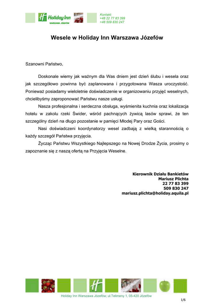 Kontakt: +48 22 77 83 399 +48 509 830 247 Wesele w Holiday Inn Warszawa Józefów Szanowni Państwo, Doskonale wiemy jak waŜnym dla Was dniem jest dzień ślubu i wesela oraz jak szczegółowo powinna być zaplanowana i przygotowana Wasza uroczystość. PoniewaŜ posiadamy wieloletnie doświadczenie w organizowaniu przyjęć weselnych, chcielibyśmy zaproponować Państwu nasze usługi. Nasza profesjonalna i serdeczna obsługa, wyśmienita kuchnia oraz lokalizacja hotelu w zakolu rzeki Świder, wśród pachnących Ŝywicą lasów sprawi, Ŝe ten szczególny dzień na długo pozostanie w pamięci Młodej Pary oraz Gości. Nasi doświadczeni koordynatorzy wesel zadbają z wielką starannością o kaŜdy szczegół Państwa przyjęcia. śycząc Państwu Wszystkiego Najlepszego na Nowej Drodze śycia, prosimy o zapoznanie się z naszą ofertą na Przyjęcia Weselne. Kierownik Działu Bankietów Mariusz Plichta 22 77 83 399 509 830 247 [email protected] Holiday Inn Warszawa Józefów; ul.Telimeny 1, 05-420 Józefów 1/6 Kontakt: +48 22 77 83 399 +48 509 830 247 PAKIET WESELNY ZŁOTY 215 PLN za osobę (podane ceny są cenami brutto) Powitanie Pary Młodej chlebem weselnym i solą Wino musujące na powitanie dla wszystkich gości Tartinki podczas powitalnego drinka (2 sztuki na osobę) Sala z podstawowym wystrojem adekwatna do liczby gości Dekoracja kwiatowa na stołach Winietki oraz menu na stołach Wybrane menu weselne (bufet ciepły uzupełniany przez 4h, bufet zimny uzupełniany przez cały czas trwania wesela) – szczegóły w załączniku Test panel wybranego menu serwowanego Tort – smaki do wyboru: (śmietanowy, marakuja, wiśnia, czekolada, truskawka, cytryna, ananas, tiramisu, bananowy, orzechowy) Apartament na noc poślubną dla Młodej Pary 2 pokoje standardowe dla rodziców Pary Młodej Śniadanie lub Brunch dla Młodej Pary Prezent od hotelu: Kolacja w Restauracji Luna Sol w pierwszą rocznicę Ślubu Promocyjna cena na pokoje dla Gości Weselnych Specjalna oferta na organizację poprawin w formie niedzielnego Bruchu 10% zniŜki na organizację chrzcin, imienin, urodzin 10% zniŜki na organizację przyjęć weselnych w niedzielę Usługi dodatkowo płatne: Pakiety napoi Oświetlenie Sali Stół wiejski Pieczony prosiak Stacja z kucharzem (z makaronem lub pieczona szynka) Fontanna czekoladowa z owocami Parking od 50 PLN/os. od 1500 PLN od 45 PLN/os. 1600 PLN/sztuka 20 PLN/os. 20 PLN/os. 16 PLN/samochód Na Państwa Ŝyczenie oferujemy: Oprawę muzyczną Filmowca Fotografa Limuzynę Zaproszenia Do kaŜdego pakietu naleŜy doliczyć dodatek za obsługę w wysokości 7% wartości końcowego rachunku. Czas trwania przyjęcia weselnego do 10 godzin Holiday Inn Warszawa Józefów; ul.Telimeny 1, 05-420 Józefów 2/6 Kontakt: +48 22 77 83 399 +48 509 830 247 MENU WESELNE – PAKIET ZŁOTY Prosimy wybrać 1 zupę, która będzie serwowana na początku przyjęcia weselnego. zupa cebulowa z tymiankiem zupa pomidorowa z musem z sera pleśniowego Ŝurek z kiełbasą i jajkiem zupa warzywna minestrone bulion drobiowy z makaronem zupa krem z kalafiora z grzankami czosnkowymi zupa krem z brokuł z grzankami czosnkowymi zupa rybna z owocami morza i kolendrą zupa porowo-ziemniaczana z oliwą truflową i szczypiorkiem zupa krem ze szparagów z grzankami czosnkowymi zupa krem z kukurydzy z kwaśna śmietaną Prosimy wybrać 1 danie główne, które będzie serwowane po zupie. pieczona pierś z kurczaka faszerowana szpinakiem i risotta z puree ziemniaczanym i gotowanymi warzywami grillowane kotleciki wieprzowe z zapiekanka ziemniaczaną i warzywami połówka kaczki z sosem Ŝurawinowym kapusta i ziemniakami pieczony filet z łososia z sosem winnym ziemniakami i warzywami gotowana sola z sosem szczypiorkowym, ryŜem i warzywami Prosimy wybrać 1 danie, które będzie serwowane po północy. bigos staropolski ze śliwką barszcz z pasztecikiem strogonoff wołowy strogonoff z indyka zupa gulaszowa flaki wołowe z majerankiem BUFET DO WŁASNEGO WYBORU Z poniŜszych propozycji mogą Państwo stworzyć zestaw potraw wybranych według własnych upodobań. Propozycja kierowana jest do przyjęć weselnych od 50 osób. Bufet zimny i deserowy jest uzupełniany przez cały czas trwania wesela. Bufet ciepły jest uzupełniany przez 4 godziny; dodatkowa godzina uzupełniania kosztuje dodatkowo 15% ceny zestawu. W cenę kaŜdego menu wliczone jest: pieczywo, masło, chrzan, Ŝurawina oraz marynaty (grzybki, dynia marynowana). Zakąski zimne – Prosimy wybrać 4 pozycje łosoś marynowany w soli, białym pieprzu i koprze z sosem musztardowym pieczony roastbeef z musem chrzanowym wybór mięs pieczonych (roastbeef, schab karkowy, schab środkowy) wybór wędlin polskich (kaszanka, salceson, kiełbasa) tatar z łososia z kaparami i czerwoną cebulą wędzony łosoś z cytryną i koprem wybór ryb wędzonych (łosoś, pstrąg, makrela) Holiday Inn Warszawa Józefów; ul.Telimeny 1, 05-420 Józefów 3/6 Kontakt: +48 22 77 83 399 +48 509 830 247 terina z łososia z zielonym pieprzem i koniakiem carpaccio z łososia z koprem terrina z kurczaka z pistacjami terrina z kurczaka z suszoną morelą śledzie w śmietanie z cebula i jabłkiem śledzie po kaszubsku wybór pasztetów carpaccio z polędwicy wołowej z parmezanem i rukolą Sałatki – Prosimy wybrać 4 pozycje sałatka grecka z serem feta i oregano sałatka nicejska z tuńczykiem i sosem musztardowym pomidory z mozarellą i sosem pesto ze świeŜej bazylii sałatka Ceasar z kurczakiem sałatka Ceasar z pieczonym indykiem sałatka ze szpinaku z serem pleśniowym i pomarańczami sałatka z rukoli z pomidorami cherry i dresingiem cytrynowym sałatka ze szpinaku z kurczakiem i dresingiem imbirowym sałatka z pomidorów z czerwoną cebulą i kolendrą sałatka makaronowa z salami i oliwkami sałatka Waldorff z selera z orzechami i rodzynkami sałatka szwajcarska z szynką, Ŝółtym serem i ogórkami sałatka z kurczaka z brzoskwinia sałatka z Ŝółtego sera z an