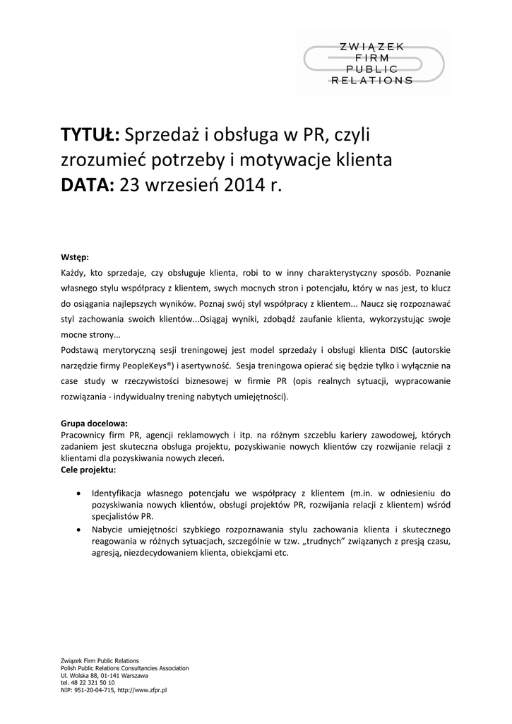 TYTUŁ: Sprzedaż i obsługa w PR, czyli zrozumieć potrzeby i motywacje klienta DATA: 23 wrzesień 2014 r. Wstęp: Każdy, kto sprzedaje, czy obsługuje klienta, robi to w inny charakterystyczny sposób. Poznanie własnego stylu współpracy z klientem, swych mocnych stron i potencjału, który w nas jest, to klucz do osiągania najlepszych wyników. Poznaj swój styl współpracy z klientem... Naucz się rozpoznawać styl zachowania swoich klientów...Osiągaj wyniki, zdobądź zaufanie klienta, wykorzystując swoje mocne strony... Podstawą merytoryczną sesji treningowej jest model sprzedaży i obsługi klienta DISC (autorskie narzędzie firmy PeopleKeys®) i asertywność. Sesja treningowa opierać się będzie tylko i wyłącznie na case study w rzeczywistości biznesowej w firmie PR (opis realnych sytuacji, wypracowanie rozwiązania - indywidualny trening nabytych umiejętności). Grupa docelowa: Pracownicy firm PR, agencji reklamowych i itp. na różnym szczeblu kariery zawodowej, których zadaniem jest skuteczna obsługa projektu, pozyskiwanie nowych klientów czy rozwijanie relacji z klientami dla pozyskiwania nowych zleceń. Cele projektu: Identyfikacja własnego potencjału we współpracy z klientem (m.in. w odniesieniu do pozyskiwania nowych klientów, obsługi projektów PR, rozwijania relacji z klientem) wśród specjalistów PR. Nabycie umiejętności szybkiego rozpoznawania stylu zachowania klienta i skutecznego reagowania w różnych sytuacjach, szczególnie w tzw. „trudnych” związanych z presją czasu, agresją, niezdecydowaniem klienta, obiekcjami etc. Związek Firm Public Relations Polish Public Relations Consultancies Association Ul. Wolska 88, 01-141 Warszawa tel. 48 22 321 50 10 NIP: 951-20-04-715, http://www.zfpr.pl Program: 1. Etap: Poznaj swój styl sprzedaży/obsługi klienta Każdy z Uczestników wypełnia assessment, otrzymując wcześniej informację (przygotowaną przez trenera) o celach projektu, korzyściach z wypełnienia kwestionariusza – jakie informacje będzie zawierać raport z assessmentu, a po wypełnieniu assessmentu zostaje do nich wysłany raport (PDF) z informacją o: twoim stylu sprzedaży i obsługi klienta mocnych stronach w komunikacji i obszarach do rozwoju tym, co cię motywuje do pracy wskazówki do komunikacji z klientem (zgodnie z Twoim stylem sprzedaży czy obsługi klienta) 2. Etap: „Od motywacji do wyników”: Sesja treningowa rozwoju kompetencji, Sesja treningowa, czas trwania: 1 dzień, 9 godzin (7 godz. pracy w zespole, 2 godz. na sesje indywidualne) Poznać i zrozumieć własny styl sprzedaży i komunikowania się z klientem Nauczyć się, jak szybko i skutecznie poznać motywacje, styl osobowości klienta i odpowiednio na nie reagować „Bezboleśnie" radzić sobie w trudnych sytuacjach z klientem Skutecznie wpływać, motywować, przekonywać i sprzedawać więcej produktów i usług (tu: zamknięcie sprzedaży) Analiza stylu obsługi klienta: mocne strony i obszary do rozwoju – na podstawie assessmentu Action Plan na kolejne 3 miesiące Zastosowane narzędzie: Sales & Customer Service Style Report to informacje o: twoim stylu sprzedaży i obsługi klienta mocnych stronach w komunikacji i obszarach do rozwoju tym, co cię motywuje do pracy wskazówki do komunikacji z klientem (zgodnie z Twoim stylem sprzedaży czy obsługi klienta) Trener: Anita Chmara - certyfikowany coach i trener biznesu, Certified Behavioral Consultant (Model DISC) Zajmuje się rozwojem osobistym i zawodowym ludzi w organizacjach, a także całych organizacji. Pracuje na rzecz doskonalenia umiejętności obsługi klienta, sprzedażowych, budowania relacji z klientem, wdrażanie wartości organizacji, rozwijania umiejętności kierowniczych, budowanie zespołów, negocjacji w stylu win-win, wystąpień publicznych etc. Współpracę z firmami szkoleniowymi rozpoczęła w roku 2000, najpierw jako trener (do 2010), później ekspert i dyrektor ds. standardów (2010-2012). Oprócz aktywnej sprzedaży, pracy nad standardami, tworzyła lub współtworzyła projekty rozwojowe (Skillboost, Mapa Rozwoju). W latach 2008-2009 roku Związek Firm Public Relations Polish Public Relations Consultancies Association Ul. Czerska 8/10, 00-732 Warszawa tel. 48 22 630-83-64, 630 83 65. faks (48 22) 625 42 84 NIP: 951-20-04-715, http://www.zfpr.pl 2 współpracowała z Markiem Kamińskim nad połączeniem umiejętności samodzielnego przekraczania granic z rozwojem biznesu w projektach szkoleniowych. Obecnie zajmuję się sprzedażą, obsługą klienta, umiejętnościami menedżerskimi oraz budowaniem relacji w zespołach w EFFECTIVENESS Sp. z o.o., wykorzystując narzędzia treningowe i coachingowe oparte o metodologię DISC. Z wykształcenia psycholog zarządzania i teatrolog, absolwentka Uniwersytetu Jagiellońskiego i Wyższej Szkoły Bankowej. Jako master Programowania Neurolingwistycznego (NLP) i certyfikowany coach International Coach Community (ICC) specjalizuje się w aktywnych technikach wewnętrznej zmiany. Prowadzi szkolenia, wykorzystując zróżnicowane narzędzia, jednak szczególny nacisk kładzie na metodę warsztatową. Przygotowuje i nadzoruje całe projekty szkoleniowe, ściśle współpracując z działami HR i sprzedażą. Termin szkolenia: 23 września 2014 r. Związek Firm Public Relations ul. Czerska 8/10 (budynek Agory) FORMULARZ ZGŁOSZENIOWY Koszt udziału w szkoleniu: 1000 zł netto + 23% VAT za osobę W razie dodatkowych pytań zapraszam do kontaktu: Sylwia Grabek [email protected] tel: 22 55 53 332, 531 84 84 71 Związek Firm Public Relations Polish Public Relations Consultancies Association Ul. Czerska 8/10, 00-732 Warszawa tel. 48 22 630-83-64, 630 83 65. faks (48 22) 625 42 84 NIP: 951-20-04-715, http://www.zfpr.pl 3