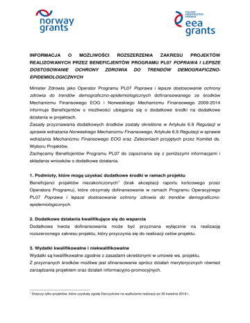 INFORMACJA O MOŻLIWOŚCI ROZSZERZENIA ZAKRESU PROJEKTÓW REALIZOWANYCH PRZEZ BENEFICJENTÓW PROGRAMU PL07 POPRAWA I LEPSZE DOSTOSOWANIE OCHRONY ZDROWIA DO TRENDÓW DEMOGRAFICZNO- EPIDEMIOLOGICZNYCH Minister Zdrowia jako Operator Programu PL07 Poprawa i lepsze dostosowanie ochrony zdrowia do trendów demograficzno-epidemiologicznych dofinansowanego ze środków Mechanizmu Finansowego EOG i Norweskiego Mechanizmu Finansowego 2009-2014 informuje Beneficjentów o możliwości ubiegania się o dodatkowe środki na dodatkowe działania w projektach. Zasady przyznawania dodatkowych środków zostały określone w Artykule 6.9 Regulacji w sprawie wdrażania Norweskiego Mechanizmu Finansowego, Artykule 6.9 Regulacji w sprawie wdrażania Mechanizmu Finansowego EOG oraz Zaleceniach przyjętych przez Komitet ds. Wyboru Projektów. Zachęcamy Beneficjentów Programu PL07 do zapoznania się z poniższymi informacjami i składania wniosków o dodatkowe działania. 1. Podmioty, które mogą uzyskać dodatkowe środki w ramach projektu Beneficjenci projektów niezakończonych1 (brak akceptacji raportu końcowego przez Operatora Programu), które otrzymały dofinansowanie w ramach Programu Operacyjnego PL07 Poprawa i lepsze dostosowanie ochrony zdrowia do trendów demograficznoepidemiologicznych. 2. Dodatkowe działania kwalifikujące się do wsparcia Dodatkowa kwota dofinansowania może być przyznana wyłącznie na realizację rozszerzonego zakresu projektu, który przyczynia się do realizacji celów projektu. 3. Wydatki kwalifikowalne i niekwalifikowalne Wydatki są kwalifikowalne zgodnie z zasadami określonymi w umowie ws. projektu. Z przyznanych środków możliwe jest sfinansowanie oprócz działań merytorycznych również zarządzania projektem oraz działań informacyjno-promocyjnych. 1 Dotyczy tylko projektów, które uzyskały zgodę Darczyńców na wydłużenie realizacji po 30 kwietnia 2016 r. Środki przyznane przez Operatora Programu będą doliczone do wartości projektu realizowanego przez Beneficjenta i w związku z tym nie mogą wpłynąć na przekroczenie limitów wskazanych w umowie ws. projektu. 4. Dostępna kwota na dodatkowe działania w projektach Dostępna kwota dofinansowania wynosi obecnie 4 409 000 zł i może ulegać zmianom. Aktualne informacje na temat kwoty będą publikowane na stronie internetowej Operatora Programu. 5. Maksymalna kwota dofinansowania i poziom dofinansowania rozszerzonego projektu Wartość dofinansowania dla projektu wraz z dodatkową alokacją nie może przekroczyć maksymalnego pułapu wskazanego w ogłoszeniu o naborze - 24 847 200 PLN, tj. 6 000 000 euro. Maksymalna wartość dofinansowania w ramach dodatkowych środków może wynieść 1 000 000 PLN. 6. Okres kwalifikowalności Początek okresu kwalifikowalności wydatków związanych z dodatkowym zakresem: W przypadku zaakceptowania wniosku beneficjenta o rozszerzenie zakresu realizacji projektu, wydatki związane z dodatkowym zakresem kwalifikowane są od dnia wydania Decyzji Ministra Zdrowia w naborze 1/07/13 w ramach programu PL07. Koniec okresu kwalifikowalności projektu: końcowa data realizacji projektu określona w umowie ws. projektu, nie później niż 30 kwietnia 2017 r. 7. Zasady przyznawania dodatkowych środków 7.1. Przyznanie dodatkowych środków Programu na rzecz realizacji konkretnego projektu może nastąpić pod następującymi warunkami: 1) Dodatkowy zakres przyczynia się do realizacji celu projektu otrzymującego dodatkowe środki i projekt otrzymał co najmniej 24 pkt z części kryteriów zdrowie. W przypadku uzyskania 0 punktów za co najmniej jedno kryterium z zakresu zdrowie, projekt jest odrzucany. Kryteria z zakresu zdrowie: • Grupa docelowa • Spójność działań z celami projektu • Oddziaływanie działań Wykonalność czasowa działań w kontekście założonych celów • Kryteria z zakresu finanse: • Mierzalność wskaźników • Racjonalność i niezbędność wydatków w działaniu • Wydatki kwalifikowalne 2) Wprowadzenie zmiany nie powoduje niezgodności projektu z kryteriami wyboru projektów oraz innymi dokumentami w systemie realizacji MF EOG/NMF 20092014. 3) Wnioskowana zmiana przyczyni się do zwiększenia rezultatów projektu w postaci zwiększenia wskaźników. 4) Rozszerzenie zakresu projektu nie spowoduje zagrożenia dla efektywnej realizacji projektu w ramach MF EOG/NMF 2009-2014. Dodatkowym warunkiem wyrażenia zgody na rozszerzenie zakresu projektu może być przeprowadzenie eksperckiej oceny efektywności proponowanego wydatku. 7.2 Dodatkowe środki przyznawane są na rzecz projektów, które spełniają warunki wskazane w punkcie 7.1 w kolejności wpływu zgłoszeń (decyduje data wpływu kompletnego wniosku2). W przypadku wpływu wniosków w tym samym terminie, dodatkowe środki w pierwszej kolejności przyznawane są projektom, które otrzymały największą liczbę punktów podczas oceny nowego zakresu pod względem następujących kryteriów selekcji: Grupa docelowa oraz Spójność działań z celami projektu. Jeśli powyższe nie pozwoli na wyłonienie projektu do dofinansowania, w przypadku wniosków, które wpłyną w tym samym terminie oraz otrzymają taką samą liczbę punktów, dodatkowe środki będą przyznane proporcjonalnie do wartości kwot wnioskowanych na realizację dodatkowego zakresu, z zastrzeżeniem, że rezultaty działań dodatkowych zostaną zachowane zgodnie ze złożonym i ocenionym wnioskiem. Przyznanie dofinansowania uzależnione jest od dostępności alokacji. W przypadku, gdy dla pozytywnie zweryfikowanego wniosku zabraknie środków, beneficjentowi oferowana jest dostępna aktualnie kwota dofinansowania, która może wzrosnąć w przypadku 2 Za wniosek kompletny należy rozumieć dokumentację względem której Operator Programu zakończył ocenę i nie zgłasza uwag, ani potrzeby wyjaśnień. W przypadku gdy beneficjent przedłoży niekompletną dokumentację, data wpływu liczona jest od dnia p