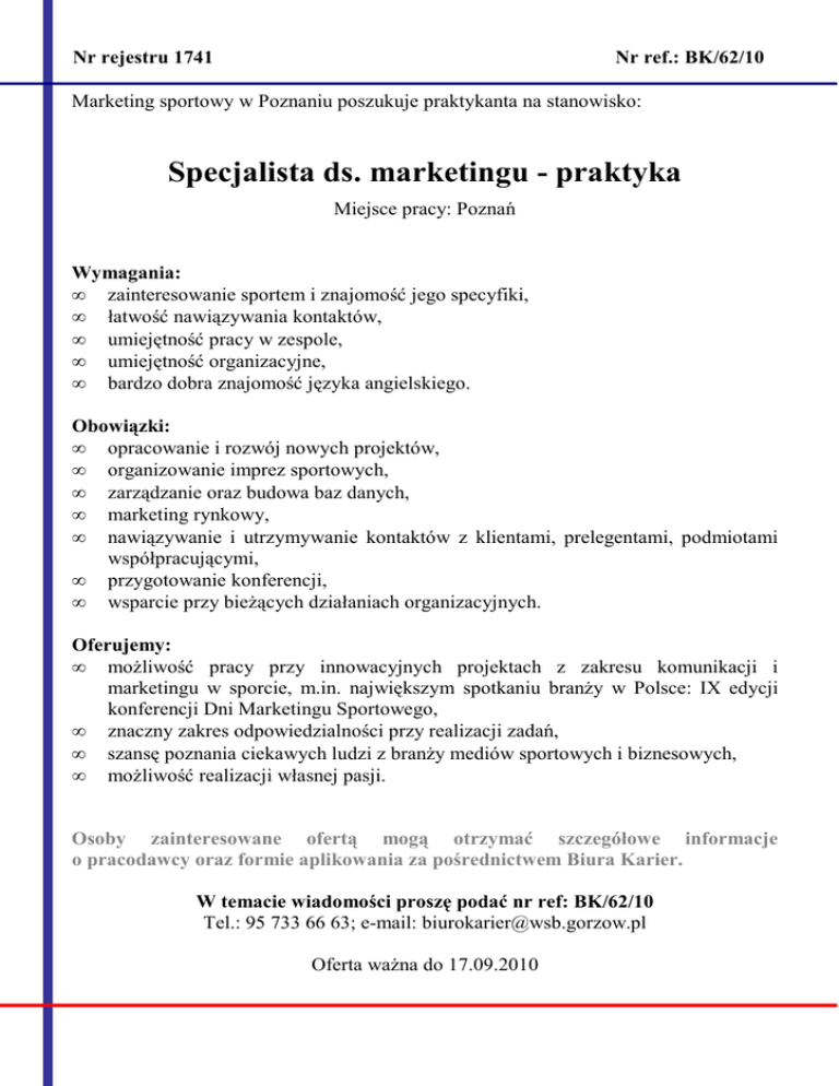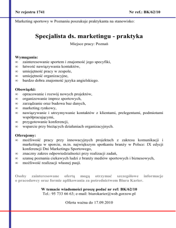 Nr rejestru 1741 Nr ref.: BK/62/10 Marketing sportowy w Poznaniu poszukuje praktykanta na stanowisko: Specjalista ds. marketingu - praktyka Miejsce pracy: Poznań Wymagania: • zainteresowanie sportem i znajomość jego specyfiki, • łatwość nawiązywania kontaktów, • umiejętność pracy w zespole, • umiejętność organizacyjne, • bardzo dobra znajomość języka angielskiego. Obowiązki: • opracowanie i rozwój nowych projektów, • organizowanie imprez sportowych, • zarządzanie oraz budowa baz danych, • marketing rynkowy, • nawiązywanie i utrzymywanie kontaktów z klientami, prelegentami, podmiotami współpracującymi, • przygotowanie konferencji, • wsparcie przy bieŜących działaniach organizacyjnych. Oferujemy: • moŜliwość pracy przy innowacyjnych projektach z zakresu komunikacji i marketingu w sporcie, m.in. największym spotkaniu branŜy w Polsce: IX edycji konferencji Dni Marketingu Sportowego, • znaczny zakres odpowiedzialności przy realizacji zadań, • szansę poznania ciekawych ludzi z branŜy mediów sportowych i biznesowych, • moŜliwość realizacji własnej pasji. Osoby zainteresowane ofertą mogą otrzymać szczegółowe informacje o pracodawcy oraz formie aplikowania za pośrednictwem Biura Karier. W temacie wiadomości proszę podać nr ref: BK/62/10 Tel.: 95 733 66 63; e-mail: [email protected] Oferta waŜna do 17.09.2010