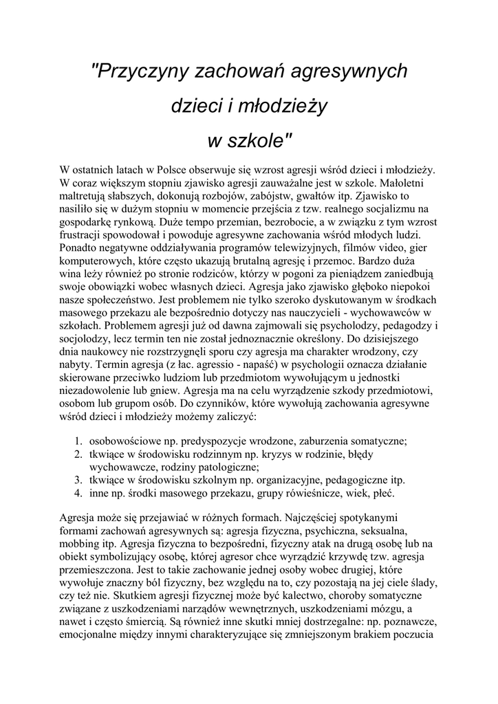 "Przyczyny zachowań agresywnych dzieci i młodzieży w szkole" W ostatnich latach w Polsce obserwuje się wzrost agresji wśród dzieci i młodzieży. W coraz większym stopniu zjawisko agresji zauważalne jest w szkole. Małoletni maltretują słabszych, dokonują rozbojów, zabójstw, gwałtów itp. Zjawisko to nasiliło się w dużym stopniu w momencie przejścia z tzw. realnego socjalizmu na gospodarkę rynkową. Duże tempo przemian, bezrobocie, a w związku z tym wzrost frustracji spowodował i powoduje agresywne zachowania wśród młodych ludzi. Ponadto negatywne oddziaływania programów telewizyjnych, filmów video, gier komputerowych, które często ukazują brutalną agresję i przemoc. Bardzo duża wina leży również po stronie rodziców, którzy w pogoni za pieniądzem zaniedbują swoje obowiązki wobec własnych dzieci. Agresja jako zjawisko głęboko niepokoi nasze społeczeństwo. Jest problemem nie tylko szeroko dyskutowanym w środkach masowego przekazu ale bezpośrednio dotyczy nas nauczycieli - wychowawców w szkołach. Problemem agresji już od dawna zajmowali się psycholodzy, pedagodzy i socjolodzy, lecz termin ten nie został jednoznacznie określony. Do dzisiejszego dnia naukowcy nie rozstrzygnęli sporu czy agresja ma charakter wrodzony, czy nabyty. Termin agresja (z łac. agressio - napaść) w psychologii oznacza działanie skierowane przeciwko ludziom lub przedmiotom wywołującym u jednostki niezadowolenie lub gniew. Agresja ma na celu wyrządzenie szkody przedmiotowi, osobom lub grupom osób. Do czynników, które wywołują zachowania agresywne wśród dzieci i młodzieży możemy zaliczyć: 1. osobowościowe np. predyspozycje wrodzone, zaburzenia somatyczne; 2. tkwiące w środowisku rodzinnym np. kryzys w rodzinie, błędy wychowawcze, rodziny patologiczne; 3. tkwiące w środowisku szkolnym np. organizacyjne, pedagogiczne itp. 4. inne np. środki masowego przekazu, grupy rówieśnicze, wiek, płeć. Agresja może się przejawiać w różnych formach. Najczęściej spotykanymi formami zachowań agresywnych są: agresja fizyczna, psychiczna, seksualna, mobbing itp. Agresja fizyczna to bezpośredni, fizyczny atak na drugą osobę lub na obiekt symbolizujący osobę, której agresor chce wyrządzić krzywdę tzw. agresja przemieszczona. Jest to takie zachowanie jednej osoby wobec drugiej, które wywołuje znaczny ból fizyczny, bez względu na to, czy pozostają na jej ciele ślady, czy też nie. Skutkiem agresji fizycznej może być kalectwo, choroby somatyczne związane z uszkodzeniami narządów wewnętrznych, uszkodzeniami mózgu, a nawet i często śmiercią. Są również inne skutki mniej dostrzegalne: np. poznawcze, emocjonalne między innymi charakteryzujące się zmniejszonym brakiem poczucia bezpieczeństwa, nieakceptowaniem siebie, poczuciem zagubienia, krzywdy, winy, trudności w nawiązywaniu kontaktów z otoczeniem. Ofiary przemocy fizycznej często przeżywają stany depresyjne i lęki. Wiele lat później mogą odezwać się odległe skutki maltretowania w dzieciństwie. Osoby te charakteryzują się ciągłym poczuciem winy, niską samooceną. To są najmniejsze skutki, bo często osoby te stają się alkoholikami, narkomanami, przeżywają zaburzenia nerwowe, nerwice, jak i również sami o dziwo stosują przemoc fizyczną wobec własnych dzieci. Inną formą agresji jest agresja psychiczna. Obejmuje negatywne zachowanie wobec drugiej osoby, począwszy od wyzwisk czyli tzw. agresji słownej, a skończywszy na emocjonalnym odrzuceniu. Często stawianie zbyt wygórowanych wymagań wobec dziecka a nieliczenie się z jego możliwościami rozwojowymi. Mimo, że tego typu agresja nie wyrządza śladów na ciele ofiary, powoduje jednak ogromne spustoszenie w sferze emocjonalnej i poznawczej. Tego typu działania powodują lęk, poczucie niesprawiedliwości, bezsensu, zaburzenia snu, nerwice, zachowania agresywne, myśli i próby samobójcze. Ma również w konsekwencji znaczny wpływ na ich późniejsze dorosłe życie. Innym przejawem zachowań agresywnych jest agresja seksualna. Jest to seksualne wykorzystywanie dziecka. Według Józefy Brągiel, jest to wciąganie dziecka w sferę aktywności seksualnej nieadekwatnej do jego etapu rozwojowego. Jest to wciąganie dziecka w sferę działań, których dziecko nie rozumie i nie jest w stanie zaakceptować. Działania te naruszają normy prawne i społeczne. Dziecko jest obiektem seksualnym, którym dorosły posługuje się w celu zaspokojenia własnych potrzeb. Następstw tych działań może być bardzo dużo. Często ofiary mogą wykazywać tendencje do zachowań o charakterze przestępczym, stosowaniu przemocy w życiu dorosłym, a i często wobec własnych dzieci. Jeszcze inną formą agresji może być tzw. mobbing. Może to być tzw. "fala szkolna". Zjawisko to może się przejawiać w postaci wielokrotnego i trwającego przez pewien okres czasu szykanowania, nękania czy dręczenia jednostki, zazwyczaj przez grupę (Milerski, Śliwerski, 2000). W polskich szkołach agresja ta przejawia się w postaci przemocy fizycznej i słownej. Trzeba otwarcie powiedzieć, że sama szkoła bardzo często jest źródłem zachowań agresywnych. Bardzo często traktowanie agresji jako tematu tabu, liczne klasy, zmuszanie dzieci i młodzieży do długotrwałej koncentracji, brak możliwości rozładowania nadmiaru energii, struktura organizacyjna szkoły, brak odpowiedniej często komunikacji uczeń nauczyciel. Wszystko to powoduje powstawanie zachowań agresywnych wśród uczniów a i często i u nauczycieli. Z aktami przemocy i agresji spotykam się w dniu codziennym w pracy szkolnej. Jestem wychowawcą klasy pierwszej szkoły zawodowej, gdzie występują pewne akty agresji. Szczególnie miało to miejsce w początkowym okresie roku szkolnego. Była to agresja fizyczna, gdzie dwóch chłopców się pobiło. Później była sytuacja chłopca, który zbił szybę w szkole. Zastosowano odpowiedni system 