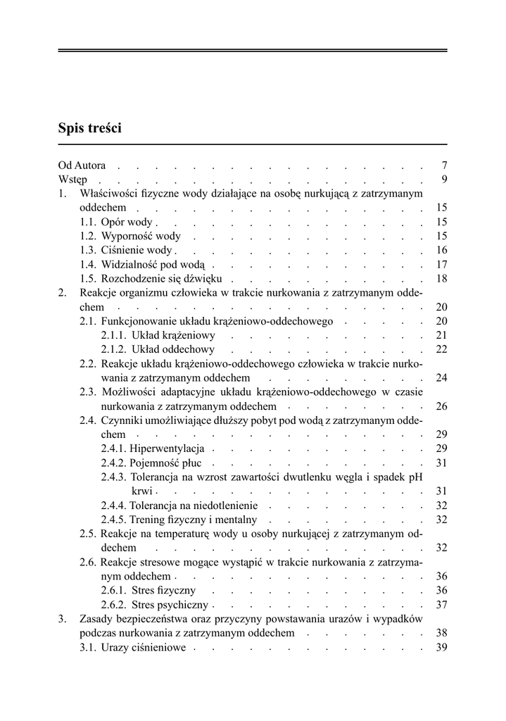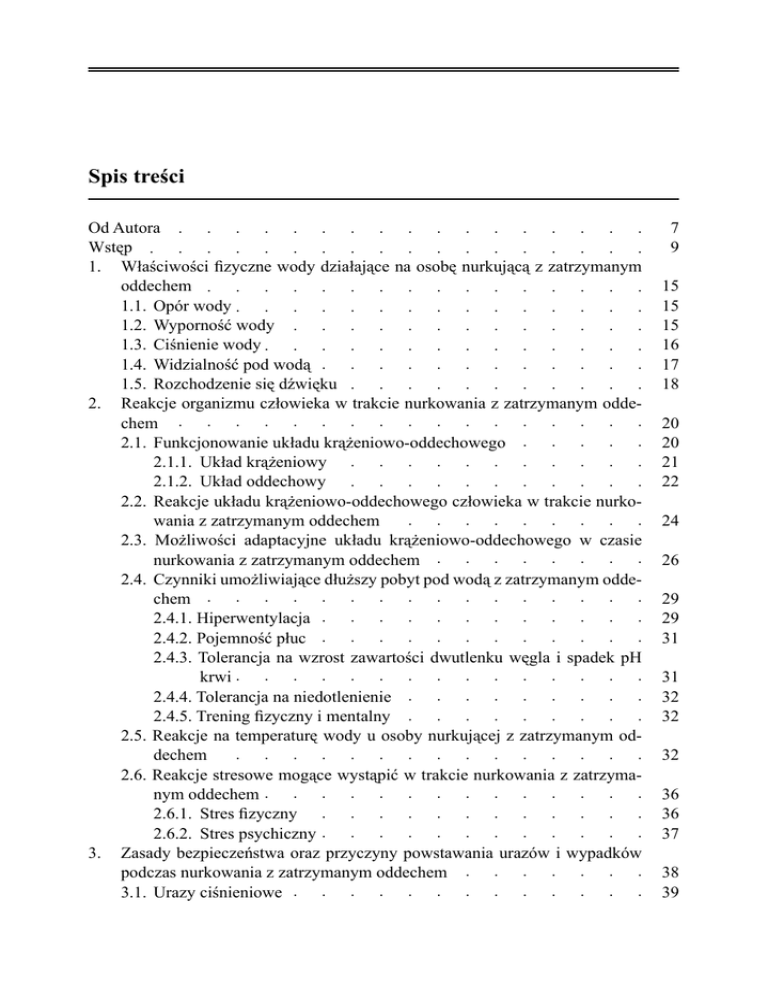 Spis treści Od Autora . . . . . . . . . . . . . . . . . . . Wstęp . . . . . . . . . . . . . . . . . . . 1. Właściwości fizyczne wody działające na osobę nurkującą z zatrzymanym .oddechem . . . . . . . . . . . . . . . . . . .1.1. .Opór . wody . . . . . . . . . . . . . . . . .1.2. .Wyporność . . .wody . . . . . . . . . . . . . . .1.3. .Ciśnienie . . wody . . . . . . . . . . . . . . . .1.4. .Widzialność . . . pod. wodą . . . . . . . . . . . . . .1.5. .Rozchodzenie . . . się . dźwięku . . . . . . . . . . . . . 2. Reakcje organizmu człowieka w trakcie nurkowania z zatrzymanym odde.chem . . . . . . . . . . . . . . . . . . .2.1. .Funkcjonowanie . . . . układu . .krążeniowo-oddechowego . . . . . . . . . . . . .2.1.1. . Układ . . krążeniowy . . . . . . . . . . . . . . . .2.1.2. . Układ . . oddechowy . . . . . . . . . . . . . . 2.2. Reakcje układu krążeniowo-oddechowego człowieka w trakcie nurko. .wania . z.zatrzymanym . . . oddechem . . . . . . . . . . . . 2.3. Możliwości adaptacyjne układu krążeniowo-oddechowego w czasie . .nurkowania . . .z zatrzymanym . . . oddechem . . . . . . . . . . . 2.4. Czynniki umożliwiające dłuższy pobyt pod wodą z zatrzymanym odde. .chem . . . . . . . . . . . . . . . . . . .2.4.1. . Hiperwentylacja . . . . . . . . . . . . . . . . . .2.4.2. . Pojemność . . . płuc . . . . . . . . . . . . . 2.4.3. Tolerancja na wzrost zawartości dwutlenku węgla i spadek pH . . . krwi . . . . . . . . . . . . . . . . . .2.4.4. . Tolerancja . . . na .niedotlenienie . . . . . . . . . . . . . .2.4.5. . Trening . . fizyczny . . i.mentalny . . . . . . . . . . . 2.5. Reakcje na temperaturę wody u osoby nurkującej z zatrzymanym od. .dechem . . . . . . . . . . . . . . . . . 2.6. Reakcje stresowe mogące wystąpić w trakcie nurkowania z zatrzyma. .nym. oddechem . . . . . . . . . . . . . . . . . .2.6.1. . Stres . .fizyczny . . . . . . . . . . . . . . . .2.6.2. . Stres . .psychiczny . . . . . . . . . . . . . . 3. Zasady bezpieczeństwa oraz przyczyny powstawania urazów i wypadków .podczas . .nurkowania . . .z zatrzymanym . . . oddechem . . . . . . . . . . .3.1. .Urazy . ciśnieniowe . . . . . . . . . . . . . . . . 7 9 15 15 15 16 17 18 20 20 21 22 24 26 29 29 31 31 32 32 32 36 36 37 38 39 4 Nurkowanie z zatrzymanym oddechem . . 3.1.1. . Uraz . .ciśnieniowy . . . narządu . . słuchu . . . . . 3.1.2. . Uraz . .ciśnieniowy . . . zatok . przynosowych . . . . . . 3.1.3. . Uraz . .ciśnieniowy . . . twarzy . . . . . . . 3.1.4. . Uraz . .ciśnieniowy . . . płuc. . . . . .3.2. . „Mroczki . . płytkiej . . wody” . . . . . . . 4. 5. . . . . . . . . . . . . . . . . . . . . . . . . . . . . . . 3.3. Utrata przytomności z powodu niedotlenienia (hipoksja) i nadmiaru . . dwutlenku . . węgla . . (hiperkapnia) . . . . . . . . . . . . . .Sprzęt . do . nurkowania . . . z zatrzymanym . . . . oddechem . . . . . . . . . .4.1. . Płetwy . . . . . . . . . . . . . . . . . .4.2. . Maska . do . nurkowania . . . . . . . . . . . . . . . .4.3. . Rurka . do . oddychania . . . . . . . . . . . . . . . .4.4. . Sprzęt . uzupełniający . . . . . . . . . . . . . . . . . . 4.4.1. . Ubranie . . z. pianki . neoprenowej . . . . . . . . . . . . . . 4.4.2. . Pas . balastowy . . . . . . . . . . . . . . . . . 4.4.3. . Nóż . nurkowy . . . . . . . . . . . . . . . . . 4.4.4. . Głębokościomierz . . . . . . . . . . . . . . . . . . 4.4.5. . Latarka . . . . . . . . . . . . . . . . . . 4.4.6. . Bojka . . asekuracyjna . . . . . . . . . . . . . . .Technika . . i ćwiczenia . . . uczące . .nurkowania . . .z zatrzymanym . . . oddechem . . . . . .5.1. . Nurkowanie . . . z zatrzymanym . . . .oddechem . . bez . sprzętu . . ABC . . . . . 5.2. Ćwiczenia uczące nurkowania z zatrzymanym oddechem bez sprzętu . . ABC . . . . . . . . . . . . . . . . . .5.3. . Pływanie . . i nurkowanie . . . z. zatrzymanym . . . oddechem . . . w sprzęcie . . ABC . . . . . 5.3.1. . Korzystanie . . . z. płetw . . . . . . . . . . . . . . 5.3.2. . Korzystanie . . . z. maski . do . nurkowania . . . . . . . . . . . . 5.3.3. . Korzystanie . . . z. rurki . oddechowej . . . . . . . . . . . 5.4. Ćwiczenia uczące nurkowania z zatrzymanym oddechem w sprzęcie . . ABC . . . . . . . . . . . . . . . . . 5.5. Zabawy, konkursy i gry stosowane w nauczaniu i doskonaleniu nurko. . wania . z. zatrzymanym . . . oddechem . . . . . . . . . . . . . . 5.5.1. . Zabawy . . . . . . . . . . . . . . . . . . 5.5.2. . Konkursy . . . . . . . . . . . . . . . . . . 5.5.3. . Gry . . . . . . . . . . . . . . . . 5.6. Ćwiczenia uczące opróżniania wody z maski tzw. dmuchanie ma. . ski . . . . . . . . . . . . . . . . . .5.7. . Ćwiczenia . . uczące . . orientacji . . .pod .wodą . . . . . . . . . .5.8. . Zanurzenia . . .się z. powierzchni . . . wody . . . . . . . . . . . . 5.8.1. . Zanurzenie . . . się . z pływania . . . na piersiach . . . tzw.. scyzoryk . . . . . . . 5.8.2. . Zanurzenie . . . się . z pozycji . . pionowej . . . tzw.. komandoski . . . . . . . . 5.8.3. . Ćwiczenia . . . uczące . . zanurzeń . . z powierzchni . . . .wody . . . . . 5.9. Skoki do wody z pomostu i ześlizgi z jednostki pływającej w sprzęcie ABC 40 42 43 44 45 46 48 48 50 52 54 54 55 56 56 56 57 58 58 61 62 64 66 68 69 72 73 76 79 83 84 86 86 88 89 90 5 Spis treści . . . 6. .5.9.1. . Skok . .pionowy . . na .nogi. . . . . .5.9.2. . Skok . .w wykroku . . .na nogi . . . . . .5.9.3. . Ześlizg . . do. wody . z. jednostki . . pływającej . . . 8. 9. . . . . . . . . . . . . . . . Freediving – nurkowanie z zatrzymanym oddechem o charakterze sporto. . . . . . . . . . . . . . . . . 6.1. Adaptacja organizmu człowieka do nadmiernego ciśnienia wody i cza. .su zatrzymania . . . oddechu . . .występującego . . . w. freedivingu . . . . . . . . .6.1.1. . Adaptacja . . . układu . .oddechowego . . . . . . . . . . . . .6.1.2. . Adaptacja . . . układu . .krążeniowego . . . . . . . . . . . .6.2. .Hiperwentylacja . . . . w freedivingu . . . . . . . . . . . . . .6.3. .
