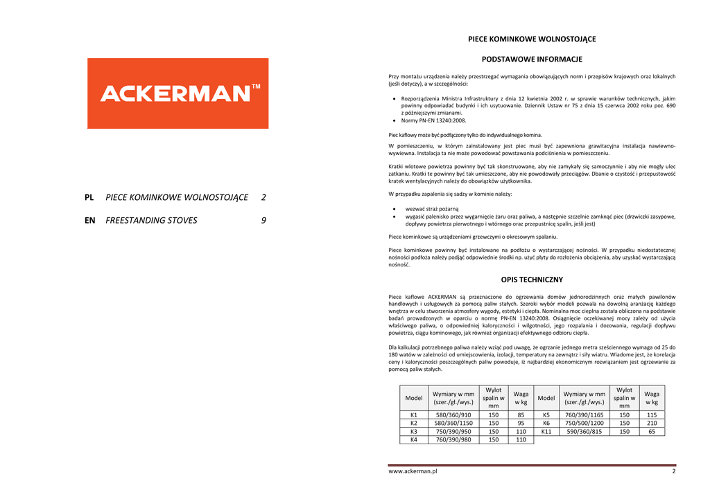 PIECE KOMINKOWE WOLNOSTOJĄCE PODSTAWOWE INFORMACJE PL PIECE KOMINKOWE WOLNOSTOJĄCE EN FREESTANDING STOVES Przy montażu urządzenia należy przestrzegać wymagania obowiązujących norm i przepisów krajowych oraz lokalnych (jeśli dotyczy), a w szczególności: • Rozporządzenia Ministra Infrastruktury z dnia 12 kwietnia 2002 r. w sprawie warunków technicznych, jakim powinny odpowiadać budynki i ich usytuowanie. Dziennik Ustaw nr 75 z dnia 15 czerwca 2002 roku poz. 690 z późniejszymi zmianami. • Normy PN‐EN 13240:2008. Piec kaflowy może być podłączony tylko do indywidualnego komina. W pomieszczeniu, w którym zainstalowany jest piec musi być zapewniona grawitacyjna instalacja nawiewno‐ wywiewna. Instalacja ta nie może powodować powstawania podciśnienia w pomieszczeniu. Kratki wlotowe powietrza powinny być tak skonstruowane, aby nie zamykały się samoczynnie i aby nie mogły ulec zatkaniu. Kratki te powinny być tak umieszczone, aby nie powodowały przeciągów. Dbanie o czystość i przepustowość kratek wentylacyjnych należy do obowiązków użytkownika. 2 9 W przypadku zapalenia się sadzy w kominie należy: • wezwać straż pożarną • wygasić palenisko przez wygarnięcie żaru oraz paliwa, a następnie szczelnie zamknąć piec (drzwiczki zasypowe, dopływy powietrza pierwotnego i wtórnego oraz przepustnicę spalin, jeśli jest) Piece kominkowe są urządzeniami grzewczymi o okresowym spalaniu. Piece kominkowe powinny być instalowane na podłożu o wystarczającej nośności. W przypadku niedostatecznej nośności podłoża należy podjąć odpowiednie środki np. użyć płyty do rozłożenia obciążenia, aby uzyskać wystarczającą nośność. OPIS TECHNICZNY Piece kaflowe ACKERMAN są przeznaczone do ogrzewania domów jednorodzinnych oraz małych pawilonów handlowych i usługowych za pomocą paliw stałych. Szeroki wybór modeli pozwala na dowolną aranżację każdego wnętrza w celu stworzenia atmosfery wygody, estetyki i ciepła. Nominalna moc cieplna została obliczona na podstawie badań prowadzonych w oparciu o normę PN‐EN 13240:2008. Osiągnięcie oczekiwanej mocy zależy od użycia właściwego paliwa, o odpowiedniej kaloryczności i wilgotności, jego rozpalania i dozowania, regulacji dopływu powietrza, ciągu kominowego, jak również organizacji efektywnego odbioru ciepła. Dla kalkulacji potrzebnego paliwa należy wziąć pod uwagę, że ogrzanie jednego metra sześciennego wymaga od 25 do 180 watów w zależności od umiejscowienia, izolacji, temperatury na zewnątrz i siły wiatru. Wiadome jest, że korelacja ceny i kaloryczności poszczególnych paliw powoduje, iż najbardziej ekonomicznym rozwiązaniem jest ogrzewanie za pomocą paliw stałych. Model Wymiary w mm (szer./gł./wys.) K1 K2 K3 K4 580/360/910 580/360/1150 750/390/950 760/390/980 Wylot spalin w mm 150 150 150 150 Waga w kg 85 95 110 110 Model Wymiary w mm (szer./gł./wys.) K5 K6 K11 760/390/1165 750/500/1200 590/360/815 Wylot spalin w mm 150 150 150 Waga w kg 115 210 65 www.ackerman.pl 2 Rozpalanie ma na celu zapalenie drewna za pierwszym razem, bez niepotrzebnego zamieszania i kilkukrotnego dorzucania papieru. Parametry dla drewna Model K1, K2 K3, K4, K5 K6 K11 Moc [kW] 6 7 8 6 Załadunek paliwa [kg/h] 1 ‐ 1,5 1 ‐ 1,6 1,5 ‐ 2 1 ‐ 1,5 Sprawność [%] 66 66 73 77 Zawartość CO w spalinach [%] 0,43 0,43 0,18 0,30 Temp. spalin [°C] 242 242 264 281 Ciąg kominowy [Pa] 12 12 12 12 INSTRUKCJA MONTAŻU Piec można podnosić tylko za elementy metalowe. Nie wolno naciskać kafli. Uszkodzenia powstałe na skutek niewłaściwego przenoszenia oraz montażu nie są objęte gwarancją. Piec wyposażony jest w stabilną i ognioodporną podstawę lub nóżki. Dla ochrony podłogi, można umieścić go na stabilnej i żaroodpornej płycie, która powinna wystawać minimum 50 cm od frontu i 30 cm po bokach pieca. W odległości 150 cm od pieca, nie powinny się znajdować materiały łatwopalne oraz takie, które mogą być zniszczone przez gorące powietrze. Piec musi być zamontowany zgodnie z przepisami prawa przez osobę mającą odpowiednie kwalifikacje. Elementy przyłączeniowe (rozeta i rury dymowe) powinny być połączone w sposób stabilny i trwały, tak aby nic nie dostało się do środka pieca. Piec powinien pracować z oddzielnym kominem. Należy zapewnić dostęp powietrza do pieca w ilości co najmniej 10 m3/h na każdy kilowat mocy. Jeżeli to konieczne, można doprowadzić powietrze z sąsiedniego pomieszczenia lub z zewnątrz. Urządzenie nie może pracować w warunkach niewystarczającej ilości powietrza, jako wyniku sił grawitacyjnych lub wymuszonych. Może to spowodować słabe spalanie lub nawet zaciąganie dymu do pomieszczenia. INSTRUKCJA UŻYTKOWANIA Paliwo. Należy używać wyłącznie drewna liściastego lub brykietów bez substancji klejących. Istotne jest, aby drewno było suche (jego wilgotność jest mniejsza niż 20%). Taki stan jest osiągnięty, gdy drewno pozostaje w suchym i przewiewnym miejscu przez okres minimum 2 lat. Drewno powinno być porąbane w taki sposób, aby jego grubość zawierała się pomiędzy 5 a 15 cm. Dlaczego nie należy stosować mokrego drewna: 1. Wilgotność drewna zmniejsza temperaturę podczas spalania. Duża część energii cieplnej jest zużywana na odparowywanie wody, a reszta energii może okazać się niewystarczająca do uzyskania odpowiedniej ilości ciepła. 2. Parowanie wody zmniejsza temperaturę spalania i przyczynia się do nadmiernego powstawania sadzy, która tworzy czarny nalot na komorze spalania, szybie, przyłączu i w kominie. 3. Spalanie mokrego drewna nie pozwala osiągnąć odpowiedniej temperatury spalania, przez co spaliny zawierają większą ilość szkodliwych substancji. Rozpalanie. Celem rozpalania jest rozgrzanie komory spalania, przyłączy i komina do temperatury zapewniającej odpowiedni ciąg, zapewniający całkowite i stabilne spalanie. 1. Przed rozpalaniem wyczyść pi