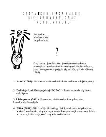 KSZTA CENIE FORMALNE, NIEFORMALNE, ORAZ INCYDENTALNE Formalne Nieformalne Incydentalne ? Czy trudno jest dokona jasnego rozró nienia pomi dzy kszta ceniem formalnym i nieformalnym, jako e cz sto oba poj cia si krzy uj ?(Mc Givney 1999). 1. Eraut (2000): Kszta cenie formalne i nieformalne w miejscu pracy. 2. Definicja Unii Europejskiej (EC 2001): Rama uczenia si przez ca e ycie 3. Livingstone (2001): Formalne, nieformalne i incydentalne kszta cenie doros ych 4. Billet (2001): Nie istnieje nic takiego jak kszta cenie incydentalne. Ka de kszta cenie odbywa si w ramach organizacji spo ecznych lub wspólnot, które maj struktury sformalizowane. 5. Beckett & Hager ( 2002): Kszta cenie nieformalne jest nie tylko bardziej powszechne, ale równie bardziej skuteczne ni kszta cenie formalne. DEFINIOWANIE KSZTA CENIA FORMALNEGO, NIEFORMALNEGO ORAZ INCYDENTALNEGO Eraut (2000): Kszta cenie formalne i nieformalne - Wykorzystuje poj cie kszta cenia nieformalnego, (nie incydentalnego) - Kszta cenie odbywa si g ównie poza formalnymi kontekstami edukacyjnymi - Przedstawia pi cech kszta cenia formalnego Okre lon ram kszta cenia Zorganizowane wydarzenie edukacyjne lub ich pakiet Obecno przydzielonego nauczyciela lub instruktora Nadanie kwalifikacji lub zaliczenie Zewn trzne okre lenie wyników kszta cenia - Okre la wymiary kszta cenia nieformalnego Czas bod ca (przesz y, bie cy, przysz y) Stopie , w jakim kszta cenie tego typu jest bierne (bierne, reaktywne lub przemy lane) Stopie , w jakim kszta cenie jest albo indywidualne albo spo eczne Stopie , w jakim kszta cenie jest albo ukryte albo jawne Definicja kszta cenia nieformalnego Eraut’a opiera si na badaniach kszta cenia w miejscu pracy. Definicja Unii Europejskiej (EC 2001) - Kszta cenie formalne: kszta cenie oferowane przez instytucj edukacyjn lub szkoleniow , zorganizowane (w sensie okre lenia celów, czasu nauki oraz pomocy udzielanej uczniom) oraz prowadz ce do certyfikacji. Kszta cenie formalne jest intencjonalne (zamierzone) z punktu widzenia ucznia. - Kszta cenie nieformalne: kszta cenie nie oferowane przez instytucj edukacyjn lub szkoleniow , które zwykle nie prowadzi do certyfikacji. Jest ono jednak zorganizowane (w sensie okre lenia celów, czasu nauki oraz pomocy udzielanej uczniom). Kszta cenie nieformalne jest intencjonalne (zamierzone) z punktu widzenia ucznia. - Kszta cenie incydentalne: kszta cenie wynikaj ce z codziennych sytuacji zaistnia ych w rodowisku pracy, w rodzinie, w trakcie wypoczynku. Nie jest zorganizowane ani zinstytucjonalizowane (w sensie okre lenia celów, czasu trwania, zasobów). Z punktu widzenia uczestnika kszta cenie incydentalne ma charakter uczenia si mimowolnego (niezamierzonego). Zazwyczaj nie prowadzi do certyfikacji. - Definicja Unii Europejskiej wynika z oraz wpisuje si w kontekst polityki Uczenia Si Przez Ca e ycie. Livingstone (2001): Formalne, nieformalne i incydentalne kszta cenie doros ych - Z kszta ceniem formalnym mamy do czynienia wówczas, gdy nauczyciel ma w adz decydowa , eby ludzie okre leni jako potrzebuj cy lub wymagaj cy wiedzy skutecznie realizowali program nauczania pobrany od ustalonego wcze niej organu zarz dzaj cego wiedz …czy to w formie zorganizowanych wg przedzia ów wiekowych lub biurokratycznych, nowoczesnych systemów szkolnych, czy to pod postaci starszyzny wprowadzaj cej m odzie do tradycyjnych instytucji wiedzy - Z kszta ceniem nieformalnym lub dalszym (ustawicznym) mamy do czynienia wówczas, gdy to uczniowie decyduj si uzyska dalsz wiedz lub umiej tno poprzez dobrowoln nauk z nauczycielem, który wspomaga ich samookre lone zainteresowania, wykorzystuj c zorganizowany program nauczania, tak jak ma to miejsce w przypadku wielu kursów i warsztatów w kszta ceniu doros ych. - O kszta ceniu incydentalnym mówimy wówczas, gdy nauczyciele lub mentorzy bior odpowiedzialno za nauczanie innych bez sta ego odniesienia do zorganizowanej intencjonalnie instytucji wiedzy, w bardziej przypadkowych i spontanicznych sytuacjach edukacyjnych, takich jak nakierowywanie uczniów na zdobycie umiej tno ci zawodowych lub dzia aniach na rzecz rozwoju wspólnoty. - Kszta ceniem incydentalnym nazywamy ka de dzia anie obejmuj ce d enie do zrozumienia wiedzy lub umiej tno ci, które wyst puje przy nieobecno ci zewn trznie narzuconych kryteriów programu nauczania …w ka dym kontek cie poza ustalonymi wcze niej przez instytucje edukacyjne programami nauczania. Definicja ta ma inn zasad organizacyjn – zwi zek mi dzy nauczycielem/mentorem a uczniem. Billet (2001): Nie istnieje nic takiego jak kszta cenie incydentalne. - Widzi kszta cenie jako wszechobecne w dzia aniach ludzkich. - Wi kszo kszta cenia odbywa si poza formalnymi strukturami edukacyjnymi - Oznacza to, e co zbli onego do kszta cenia nieformalnego powinno by uwa ane za form standardow , raczej ni to, co pozostanie, gdy zostanie ju rozliczone kszta cenie formalne. - Ma istotne obiekcje do terminu “incydentalne”, poniewa ka de kszta cenie odbywa si w ramach organizacji spo ecznych lub wspólnot, które maj struktury sformalizowane. - Nigdy nie u ywa poj cia „nieformalne”, lecz logika jego argumentu jest taka, e kszta cenie nie mo e równie by nieformalne Beckett & Hager (2002): kszta cenie incydentalne - Kszta cenie jest organiczne lub holistyczne, anga uj ce ca osob do tego stopnia, e intelekt, emocje, warto ci oraz dzia ania praktyczne mieszaj si . - Kszta cenie incydentalne jest bardziej powszechne oraz bardziej skuteczne ni kszta cenie formalne. - Cechy kszta cenia incydentalnego: Praktyczne kszta cenie incydentalne jest organiczne / holistyczne. Praktyczne kszta cenie incydentalne jest kontekstualne Praktyczne kszta cenie incydentalne opiera si na dzia aniu oraz do wiadczeniu Praktyczne kszta cenie incydentalne wyst puje w sytuacjach, gdzie kszta cenie nie jest g ównym celem. Praktyczne kszta cenie incydentalne w miejscu pracy jest uaktywniane przez poszczególnych uczniów raczej ni nauczycieli / instruktorów Praktyczne kszta