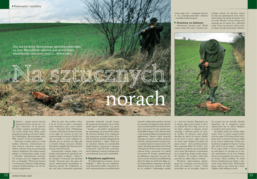 Polowanie i myśliwy Obstawiamy pierwszą norę. Wokół wejścia widać lisie tropy i bażancie pió- wybiega szybciej niż pierwszy. Janusz nie daje mu najmniejszych szans. Śmiertelnie trafiony lis wpada do kanału. Czas na wyżła. Wysokie i strome brzegi rowu zmuszają psa do aportu lisa z głębokiej wody. Cieszy ten pierwszy sukces, drażni udana ucieczka pierwszego rudzielca. ra – może być ciekawie. Wpatrujemy się w miejsce, gdzie przed chwilą w otworze zniknął Alf. Przez długi czas nic się nie dzieje, czekamy w napięciu, mocno trzymając w dłoniach gotowe do strzału strzelby. Po pewnym czasie Darek decyduje się zajrzeć do otworu. Kładzie się na trawie za norą i nagle zrywa się na równe nogi. Kłapnął mi zębami tuż przed nosem! – mówi podekscytowany. Było naprawdę blisko! Po chwili z nory wyskakuje lis. Jednym susem przeskakuje rów z wodą. Ma trudności z wydostaniem się na drugi brzeg. Padają strzały, wszystkie chybione. Za wcześnie, trzeba było pozwolić mu odbiec dalej, na oziminy! Wzrokiem odprowadzamy galopującego lisa. Uważajcie, może być jeszcze jeden, pies nadal jest w norze! – Darek przywołuje nas do porządku. Drugi lis Na szczęście psy nie zawiodły. Zgodnie umawiamy się, że następnym razem odpuszczamy lisa na dalszą odległość, co zwiększy pole rażenia śrutu. Na kolejną okazję nie musimy długo czekać. Nora w starym nasypie kolejowym jest zajęta. Pod ziemią słychać szczekanie, które w pewnym momencie zbliża się do otworu wejściowego. Darek zniecierpliwiony zagląda do wnętrza. Uważaj, żeby znów lis cię nie ugryzł – żartujemy. W tej samej chwili w otworze pojawia się ruda głowa. Lis orientuje się w sytuacji i natychmiast cofa do nory. Trafiając wprost na pracującego tym razem w norze Franza. Mamy problem. Po chwili słychać charakterystyczny bulgot i charczenie. Franz siedzi na lisie. Trzeba będzie kopać, chyba że pies obróci lisa w kotle. Odgłosy walki milkną po chwili. można zająca oraz – występujące przecież w woj. kujawsko-pomorskim nielicznie – niewielkie stadka kuropatw. Strzelamy na zielonym Nie ma bardziej skutecznego sposobu polowania na lisy. Warunkiem sukcesu jest prawidłowe zbudowanie sztucznej nory i… dobry pies. Na sztucznych norach J edziemy – zapada wreszcie decyzja. Śniegu jak nie było, tak nie ma i – sądząc z obserwacji – nic nie zapowiada rychłego nadejścia prawdziwej zimy. Nie można jednak kazać dłużej czekać gospodarzom polnego obwodu w Radzyniu Chełmińskim, dzierżawionego przez WKŁ „Daniel” nr 220 w Grudziądzu. Polowania na białej stopie są o wiele bardziej efektywne. Zdecydowanie łatwiej wówczas rozpoznać czynną norę. Dobrze widoczne tropy nie pozostawiają żadnych wątpliwości. Bez śniegu musimy polegać na doskonałości psiego węchu i łowieckim doświadczeniu menerów. Na szczęście pod tym względem trafiliśmy „w dziesiątkę”. Wyruszymy bowiem w towarzystwie Dariusza Szałkowskiego i Janusza Trzebiatowskiego oraz ich znakomitych jagdterierów. 12 ŁOWIEC POLSKI 2/2007 Kilka lat temu obaj myśliwi wybrali się do Czech na jeden z najważniejszych konkursów pracy psów myśliwskich – Memoriał Karla Podhajskiego i wrócili z niezłomnym postanowieniem, że już nigdy nie wyruszą na łowy bez czworonożnego towarzysza. Rychło okazało się jednak, że nawet najlepiej wyszkolone psy na niewiele się zdają, gdy w łowisku brakuje zwierzyny drobnej. Tak właśnie wyglądał dzierżawiony przez ich koło obwód łowiecki. Systematycznie osuszane bagna i rozlewiska wód gruntowych ograniczyły środowisko ptactwa wodnego – dawne linie brzegowe wyznaczają dziś głowiaste wierzby. Tworzona przez lata gęsta sieć rowów melioracyjnych porośniętych roślinnością typową dla śródpolnych remiz oraz liczne trzcinowiska zapewniały wprawdzie doskonałe warunki bytowe dla wpuszczanych bażantów, ale te szybko padały łupem drapieżników. Lisy, jenoty i borsuki, o pozostałych drapieżnikach nie wspominając, nie pozostawiały miejsca dla zwierzyny drobnej. Nory znajdywane były praktycznie na każdym kroku. W takich warunkach spotkanie jakiegokolwiek bażanta graniczyło z cudem. Niskie stany zwierzyny drobnej nie przeszkodziły jednak Darkowi i Januszowi w szkoleniu swoich psów i dziś ich wyżły z powodzeniem konkurują z krajową czołówką podczas konkursów pracy psów myśliwskich. Wyjątkowe jagdteriery W październikowym numerze „Łowca Polskiego” z 2004 roku moi współtowarzysze przeczytali artykuł o sztucznych norach i stwarzanych przez nie możliwościach kontroli i redukcji lisiej populacji. Zarażeni już wcześniej kynologiczną pasją zdecydowali, że powinni spróbować swoich sił również z norowcami. Do tego pomysłu przekonali kilku kolegów z koła. Obecnie każdy z nich dysponuje kilkoma doświadczonymi jagdterierami. Ostatnio kupili niezwykle obiecujące szczenięta z wybitnie użytkowej hodowli, z której pochodzi zwycięzca świata ostatniej światowej wystawy psów w Poznaniu. Specjalnie pojechali po nie do Bośni i Hercegowiny. W kole zaczęto intensywnie polować na lisy z norowcami. I to z jakimi norowcami! W łowisku zainstalowanych jest kilkanaście sztucznych nor, przy których w sezonie strzelanych jest kilkadziesiąt lisów. Na efekty nie trzeba było długo czekać. Dziś spotkanie z bażantem w obwodzie dzierżawionym przez „Daniela” nie należy już do rzadkości. Gdzieniegdzie spotkać 13 Polowanie i myśliwy bie w myślach. Wytrzymałeś, zgodnie z umową, że strzelamy na… Nagle z nory wybiega lis. Bez zastanowienia pociągam za spust. Tym razem to ja nie dałem szansy Januszowi. Od kiedy to jest zielone? – śmieje się ze mnie. Gratuluję! Kolejna nora z przewróconą u wejścia gałązką. Dag jest doświadczonym i znika w otworze. Stoimy w milczeniu. Nie mamy pojęcia, co dzieje się pod ziemią, ale jednego możemy być pewni. Jeżeli tam