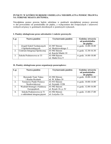 PUNKTY W KTÓRYCH BĘDZIE UDZIELANA NIEODPŁATNA POMOC PRAWNA NA TERENIE MIASTA BYTOMIA. Nieodpłatna pomoc prawna będzie udzielana w punktach nieodpłatnej pomocy prawnej w dni powszednie od poniedziałku do piątku, z wyłączeniem dni świątecznych i ustawowo wolnych od pracy w godzinach określonych w poniższych wykazach. I. Punkty obsługiwane przez adwokatów i radców prawnych: L.p. 1. Nazwa punktu 2. Zespół Szkół Technicznych i Ogólnokształcących Centrum Integracji Społecznej 3. Szkoła Podstawowa nr 33 Usytuowanie punktu 41-907 Bytom ul. Modrzewskiego 5 41-902 Bytom ul. Karola Miarki 10 41-908 Bytom ul. Matki Ewy 9 Godziny otwarcia od poniedziałku do piątku w godz. 14.00-18.00 w godz. 12.30-16.30 w godz. 14.00-18.00 II. Punkty obsługiwane przez organizacje pozarządowe: L.p. Nazwa punktu 1. Bytomski Teatr Tańca i Ruchu Rozbark Terenowy Punkt Pomocy Środowiskowej Wydział Strategii i Funduszy Europejskich Szkoła Podstawowa nr 51 z oddziałami integracyjnymi 2. 3. 4. Usytuowanie punktu 41-902 Bytom ul. W. Kilara 29 41-933 Bytom ul. Szymały 122B 41-902 Bytom ul. Rynek 26, p. IV 41-902 Bytom ul. Łużycka 12a Godziny otwarcia od poniedziałku do piątku w godz. 10.00-14.00 w godz. 10.00-14.00 w godz. 12.00-16.00 w godz. 13.00-17.00