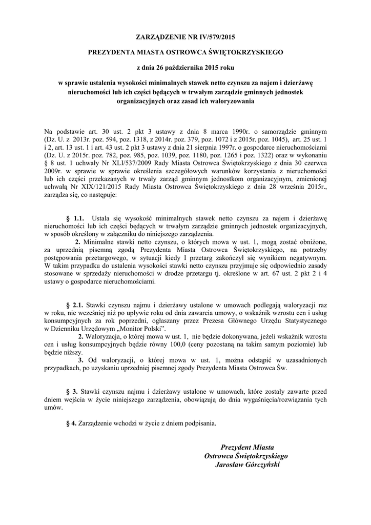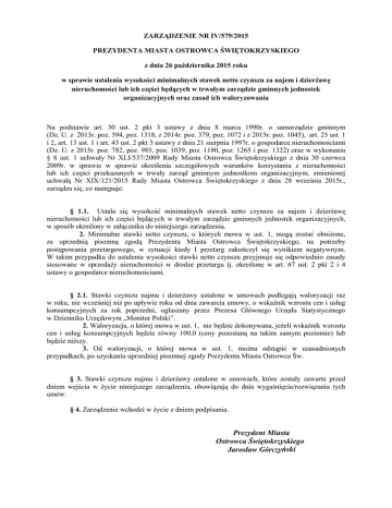 ZARZĄDZENIE NR IV/579/2015 PREZYDENTA MIASTA OSTROWCA ŚWIĘTOKRZYSKIEGO z dnia 26 października 2015 roku w sprawie ustalenia wysokości minimalnych stawek netto czynszu za najem i dzierŜawę nieruchomości lub ich części będących w trwałym zarządzie gminnych jednostek organizacyjnych oraz zasad ich waloryzowania Na podstawie art. 30 ust. 2 pkt 3 ustawy z dnia 8 marca 1990r. o samorządzie gminnym (Dz. U. z 2013r. poz. 594, poz. 1318, z 2014r. poz. 379, poz. 1072 i z 2015r. poz. 1045), art. 25 ust. 1 i 2, art. 13 ust. 1 i art. 43 ust. 2 pkt 3 ustawy z dnia 21 sierpnia 1997r. o gospodarce nieruchomościami (Dz. U. z 2015r. poz. 782, poz. 985, poz. 1039, poz. 1180, poz. 1265 i poz. 1322) oraz w wykonaniu § 8 ust. 1 uchwały Nr XLI/537/2009 Rady Miasta Ostrowca Świętokrzyskiego z dnia 30 czerwca 2009r. w sprawie w sprawie określenia szczegółowych warunków korzystania z nieruchomości lub ich części przekazanych w trwały zarząd gminnym jednostkom organizacyjnym, zmienionej uchwałą Nr XIX/121/2015 Rady Miasta Ostrowca Świętokrzyskiego z dnia 28 września 2015r., zarządza się, co następuje: § 1.1. Ustala się wysokość minimalnych stawek netto czynszu za najem i dzierŜawę nieruchomości lub ich części będących w trwałym zarządzie gminnych jednostek organizacyjnych, w sposób określony w załączniku do niniejszego zarządzenia. 2. Minimalne stawki netto czynszu, o których mowa w ust. 1, mogą zostać obniŜone, za uprzednią pisemną zgodą Prezydenta Miasta Ostrowca Świętokrzyskiego, na potrzeby postępowania przetargowego, w sytuacji kiedy I przetarg zakończył się wynikiem negatywnym. W takim przypadku do ustalenia wysokości stawki netto czynszu przyjmuje się odpowiednio zasady stosowane w sprzedaŜy nieruchomości w drodze przetargu tj. określone w art. 67 ust. 2 pkt 2 i 4 ustawy o gospodarce nieruchomościami. § 2.1. Stawki czynszu najmu i dzierŜawy ustalone w umowach podlegają waloryzacji raz w roku, nie wcześniej niŜ po upływie roku od dnia zawarcia umowy, o wskaźnik wzrostu cen i usług konsumpcyjnych za rok poprzedni, ogłaszany przez Prezesa Głównego Urzędu Statystycznego w Dzienniku Urzędowym „Monitor Polski”. 2. Waloryzacja, o której mowa w ust. 1, nie będzie dokonywana, jeŜeli wskaźnik wzrostu cen i usług konsumpcyjnych będzie równy 100,0 (ceny pozostaną na takim samym poziomie) lub będzie niŜszy. 3. Od waloryzacji, o której mowa w ust. 1, moŜna odstąpić w uzasadnionych przypadkach, po uzyskaniu uprzedniej pisemnej zgody Prezydenta Miasta Ostrowca Św. § 3. Stawki czynszu najmu i dzierŜawy ustalone w umowach, które zostały zawarte przed dniem wejścia w Ŝycie niniejszego zarządzenia, obowiązują do dnia wygaśnięcia/rozwiązania tych umów. § 4. Zarządzenie wchodzi w Ŝycie z dniem podpisania. Prezydent Miasta Ostrowca Świętokrzyskiego Jarosław Górczyński Załącznik do Zarządzenia Nr IV/579/2015 Prezydenta Miasta Ostrowca Św. z dnia 26 października 2015 roku Wysokość minimalnych stawek netto czynszu za najem i dzierŜawę nieruchomości lub ich części będących w trwałym zarządzie gminnych jednostek organizacyjnych Rodzaj pomieszczenia Sala gimnastyczna Sala dydaktyczna Pracownia informatyczna Świetlica/kuchnia/stołówka szkolna Pomieszczenia biurowe Sala konferencyjna Sklepiki szkolne Pomieszczenia handlowe i gastronomiczne Powierzchnie pod automaty vendingowe, punkty kserograficzne itp. Magazyny, piwnice, inne pomieszczenia składowe Gabinety lekarskie i sale rehabilitacyjno-terapeutyczne (nie dotyczy gabinetów profilaktyki zdrowotnej i pomocy przedlekarskiej, o których mowa w ustawie o systemie oświaty) Inne pomieszczenia Okres rozliczeniowy Minimalna stawka netto czynszu w zł godzina dzień miesięcznie godzina dzień miesięcznie 30,00 zł 150,00 zł 1.300,00 zł 10,00 zł 60,00 zł 650,00 zł godzina dzień 50,00 zł 250,00 zł godzina dzień miesięcznie 20,00 zł 100,00 zł 600,00 zł miesięcznie za m² 6,00 zł godzina dzień 50,00 zł 250,00 zł miesięcznie za m² 8,00 zł miesięcznie za m² 10,00 zł Miesięcznie 200,00 zł miesięcznie za m² 2,00 zł godzina miesięcznie 10,00 zł 450,00 zł miesięcznie za m² 8,00 zł Korty tenisowe, boiska, bieŜnie Powierzchnie reklamowe Plac gruntu godzina dzień miesięcznie 10,00 zł 100,00 zł 1.000,00 zł miesięcznie za m² powierzchni reklamowej 50,00 zł miesięcznie za m² 5,00 zł Prezydent Miasta Ostrowca Świętokrzyskiego Jarosław Górczyński