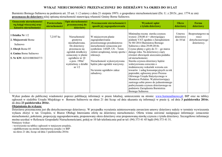 WYKAZ NIERUCHOMOŚCI PRZEZNACZONEJ DO DZIERŻAWY NA OKRES DO 10 LAT Burmistrz Bornego Sulinowa na podstawie art. 35 ust. 1 i 2 ustawy z dnia 21 sierpnia 1997r. o gospodarce nieruchomościami (Dz. U. z 2015r., poz. 1774 ze zm) przeznacza do dzierżawy niżej opisaną nieruchomość stanowiącą własność Gminy Borne Sulinowo. Oznaczenie nieruchomości wg księgi wieczystej oraz katastru nieruchomości 1 Działka Nr 1/2 2. Miejscowość Borne Sulinowo 3. Obręb Borne 05 4. Gmina Borne Sulinowo 5. Nr KW: KO1I/00030437/3 Powierzchnia nieruchomości 7,2107 ha Opis nieruchomości przeznaczonej do dzierżawy Nieruchomość gruntowa niezabudowana. Do dzierżawy przeznacza się ogródek działkowy oznaczony w planie ogródków nr 10 o pow. 190m2 wydzielony z działki nr 1/2 Przeznaczenie nieruchomości i sposób jej zagospodarowania W miejscowym planie zagospodarowania przestrzennego przedmiotowa nieruchomość oznaczona jest symbolem: 145ZP, US – Teren zieleni urządzonej, tereny sportu i rekreacji. Nieruchomość wykorzystywana będzie jako ogródek warzywny. Na terenie ogródków zakaz zabudowy. Wysokość opłat z tytułu dzierżawy Okres dzierżawy Forma dzierżawy Minimalna roczna stawka czynszu wynosi: 230,00 zł + obowiązujący podatek VAT zgodnie z Zarządzeniem Nr 88//2014 Burmistrza Bornego Sulinowa z dnia 29.09.2014r. Czynsz płatny z góry do 31 – go marca danego roku. Na dzierżawcy ciąży również obowiązek uiszczania podatku od nieruchomości. Stawka czynszu dzierżawy będzie waloryzowana corocznie o średnioroczny wskaźnik wzrostu cen towarów i usług konsumpcyjnych za rok poprzedni, ogłoszony przez Prezesa Głównego Urzędu Statystycznego w Monitorze Polskim. Wydzierżawiający zastrzega sobie prawo do jednostronnego podwyższania czynszu dzierżawnego na podstawie Zarządzenia Burmistrza Bornego Sulinowa Umowa dzierżawy do 10 lat Bezprzetargowo na rzecz dotychczasowego dzierżawcy. Wykaz podano do publicznej wiadomości poprzez publikację informacji w prasie lokalnej, umieszczenie na stronie: www.bornesulinowo.pl, BIP oraz na tablicy ogłoszeń w siedzibie Urzędu Miejskiego w Bornem Sulinowie na okres 21 dni licząc od dnia ukazania się informacji w prasie tj. od dnia 3 października 2016r. do dnia 23 października 2016r. Objaśnienia do wykazu: Dzierżawa przeznaczona jest dla dotychczasowego dzierżawcy. W przypadku wyrażenia zainteresowania zawarciem umowy dzierżawy należy w terminie wywieszenia wykazu złożyć w tut. Urzędzie, w Biurze Obsługi Interesanta ofertę na dzierżawę nieruchomości. Oferta winna zawierać następujące informacje: oznaczenie nieruchomości, położenie, propozycję zagospodarowania, proponowany okres dzierżawy oraz proponowaną stawkę czynszu z tytułu dzierżawy. Szczegółowe informacje można uzyskać w Referacie Gospodarki Nieruchomościami, pokój nr 10 lub telefonicznie pod nr tel: (94) 373 41 45 bądź (94) 373 41 51. Niniejszy wykaz: - wywieszono na tablicy ogłoszeń w tutejszym urzędzie, - opublikowano na stronie internetowej urzędu i w BIP na okres 21 dni, licząc od dnia 3 października 2016r.