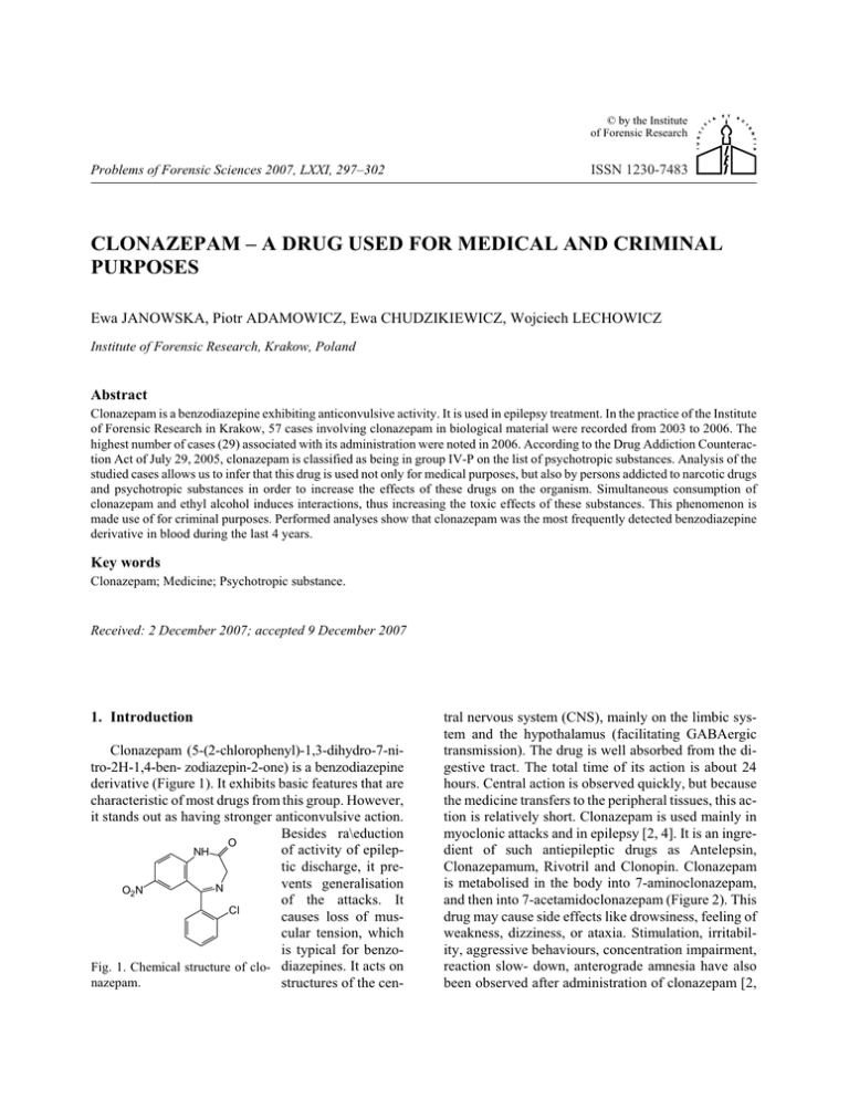 © by the Institute of Forensic Research Problems of Forensic Sciences 2007, LXXI, 297–302 ISSN 1230-7483 CLONAZEPAM – A DRUG USED FOR MEDICAL AND CRIMINAL PURPOSES Ewa JANOWSKA, Piotr ADAMOWICZ, Ewa CHUDZIKIEWICZ, Wojciech LECHOWICZ Institute of Forensic Research, Krakow, Poland Abstract Clonazepam is a benzodiazepine exhibiting anticonvulsive activity. It is used in epilepsy treatment. In the practice of the Institute of Forensic Research in Krakow, 57 cases involving clonazepam in biological material were recorded from 2003 to 2006. The highest number of cases (29) associated with its administration were noted in 2006. According to the Drug Addiction Counteraction Act of July 29, 2005, clonazepam is classified as being in group IV-P on the list of psychotropic substances. Analysis of the studied cases allows us to infer that this drug is used not only for medical purposes, but also by persons addicted to narcotic drugs and psychotropic substances in order to increase the effects of these drugs on the organism. Simultaneous consumption of clonazepam and ethyl alcohol induces interactions, thus increasing the toxic effects of these substances. This phenomenon is made use of for criminal purposes. Performed analyses show that clonazepam was the most frequently detected benzodiazepine derivative in blood during the last 4 years. Key words Clonazepam; Medicine; Psychotropic substance. Received: 2 December 2007; accepted 9 December 2007 1. Introduction Clonazepam (5-(2-chlorophenyl)-1,3-dihydro-7-nitro-2H-1,4-ben- zodiazepin-2-one) is a benzodiazepine derivative (Figure 1). It exhibits basic features that are characteristic of most drugs from this group. However, it stands out as having stronger anticonvulsive action. Besides ra\eduction O of activity of epilepNH tic discharge, it prevents generalisation N O2N of the attacks. It Cl causes loss of muscular tension, which is typical for benzoFig. 1. Chemical structure of clo- diazepines. It acts on nazepam. structures of the cen- tral nervous system (CNS), mainly on the limbic system and the hypothalamus (facilitating GABAergic transmission). The drug is well absorbed from the digestive tract. The total time of its action is about 24 hours. Central action is observed quickly, but because the medicine transfers to the peripheral tissues, this action is relatively short. Clonazepam is used mainly in myoclonic attacks and in epilepsy [2, 4]. It is an ingredient of such antiepileptic drugs as Antelepsin, Clonazepamum, Rivotril and Clonopin. Clonazepam is metabolised in the body into 7-aminoclonazepam, and then into 7-acetamidoclonazepam (Figure 2). This drug may cause side effects like drowsiness, feeling of weakness, dizziness, or ataxia. Stimulation, irritability, aggressive behaviours, concentration impairment, reaction slow- down, anterograde amnesia have also been observed after administration of clonazepam [2, 298 E. Janowska, P. Adamowicz, E. Chudzikiewicz et al. O NH O NH O NH [H] N O2N N H2N Cl clonazepam CH3COHN Cl 7-aminoclonazepam N Cl 7-acetamidoclonazepam Fig. 2. Metabolic pathway of clonazepam. 4]. It can be taken orally by an adult at a daily dose of 4–10 mg (in 3–4 divided doses). In an epileptic state, it can be administered intramuscularly or intravenously at a dose of 1 mg [2]. The therapeutic blood concentration of clonazepam ranges from 4 to 80 ng/ml, whereas the toxic concentration is higher than 100 ng/ml [3, 5]. According to the Drug Addiction Counteraction Act of July 29, 2005, clonazepam is classified as being in group IV-P on the list of psychotropic substances1. According to the Decree of the Ministry of Health of June 11, 2003, benzodiazepine derivatives are considered as agents acting similarly to alcohol and they may not be taken by persons driving vehicles2. 3.2. Chemicals 2. Aim of the study In the ELISA method, 10 ml of blood sample or positive control (blood spiked with 10 ng/ml of clonazepam) diluted 1:4 in a buffer delivered by the manufacturer were placed into the “well” of a microplate coated with anti-drug antiserum, followed by addition of analyte-enzyme conjugate. After incubation at room temperature for 45 min, the liquid was removed from the wells and the microplate was washed three times with the buffer. Then, substrate was added to the dried wells. After a 30 min incubation, the reaction was halted. Measurement of the absorbance of the obtained solution was performed within a 2-hour period after stopping the reaction. Each positive result obtained by the screening method was confirmed by a specific method. A four-year (2003–2006) retrospective study, which summarizes routine examinations of blood samples for the presence of narcotic drugs, psychoactive substances and medicines, is presented in this paper. 3. Material and methods 3.1. Material The studied material was samples taken from drivers and addicted persons, who were subjected to screening analysis for the presence of drugs of abuse: opium alkaloid derivatives, cocaine, amphetamines (including MDMA), cannabinols and drugs from the group of benzodiazepine derivatives in the Section for Toxicological Analyses, Department of Forensic Toxicology, Institute of Forensic Research, Krakow. “Benzodiazepines Group (Oxazepam/Clonazepam)” test kit manufactured by Neogen (United States) was used for determination of benzodiazepines by means of the ELISA method. Clonazepam, 7-aminoclonazepam and prazepam (internal standard – IS) were purchased from Cerillant (Poland), while acetonitrile and distilled water (HPLC grade) from Merck (Germany). Diisopropyl ether was bought from Fluka (France). 3.3. Screening – enzyme-linked immunosorbent assay (ELISA) 3.4. Confirmatory method – liquid chromatography coupled to mass spectrometry (LC-MS) 3.4.1. Liquid-liquid extraction 1 2 Drug Addiction Counteraction Act of July 29, 2005, Journal of Laws 2005, no. 179, item 1485. Decree of the Ministry of Health of June 11, 2003 on the list of agents acti