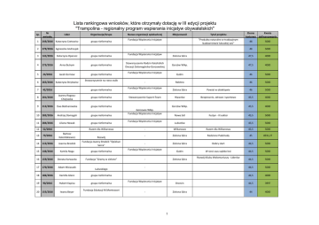 Lista rankingowa wniosków, które otrzymały dotację w III edycji projektu "Trampolina - regionalny program wspierania inicjatyw obywatelskich" Lp. Nr wniosku Lider Organizacja/Grupa Nazwa organizacji opiekuńczej Miejscowość Tytuł projektu Ocena końcowa Kwota dofinansowania 1 243/2016 Katarzyna Czetowicz grupa nieformalna Fundacja Wspierania Inicjatyw Społecznych Świdnica "Produkty naturalne w tradycyjnym budownictwie lubuskiej wsi" 48 5000 - Krosno Odrzańskie Sołtys z werwą - Akademia sołtysa 48 5000 2 279/2016 Agnieszka Andrzejek Stowarzyszenie Sołtysów Powiatu Krosnieńskiego 3 141/2016 Katarzyna Operacz grupa nieformalna Fundacja Wspierania Inicjatyw Społecznych Zielona Góra Nie boje się księgowości 47,5 4000 4 273/2016 Anna Butrym grupa nieformalna Stowarzyszenie Rodzin Katolickich Diecezji Zielonogórsko-Gorzowskiej Gorzów Wlkp. Zobacz we mnie człowieka 47,5 4000 5 24/2016 Jacek Gornow grupa nieformalna Fundacja Wspierania Inicjatyw Społecznych Gubin Poznaję siebie - odkrywam Warszawę 46 5000 6 265/2016 Katarzyna Strylewicz Stowarzyszenie na rzecz osób niepełnosprawnych "RAZEM" - Rokitno Sprawni Niepełnosprawni 46 5000 Zielona Góra Powiat w obiektywie 46 5000 Wawrów Bezpiecznie, zdrowo i sportowo 45,5 4000 Gorzów Wlkp. Jesień może być pogodna 45,5 4000 Nowa Sól Festyn - III sektor 45,5 5000 Lubiatów Młodzi na Start 45,5 5000 42/2016 Erwin Stróżyk grupa nieformalna Fundacja Wspierania Inicjatyw Społecznych 8 201/2016 Joanna RogozaChojnacka grupa nieformalna Stowarzyszenie Suport-Team 9 212/2016 Ewa Bodnarowska grupa nieformalna 10 282/2016 Andrzej Domagali grupa nieformalna 11 284/2016 Liliana Nowak grupa nieformalna 12 52/2016 Paweł Kierzek Razem dla Wilkanowa - Wilkanowo Razem dla Wilkanowa 45,5 5000 13 79/2016 Bartosz Kalembkiewicz Fundacja Bodzio Radość Rodzina Rozwój - Zielona Góra Rodzinne Podchody 45 4931,27 14 115/2016 Joanna Brodzik Fundacja Joanny Brodzik "Opiekun Serca" - Zielona Góra Dobry start 44,5 5000 15 146/2016 Kamila Noga grupa nieformalna Fundacja Wspierania Inicjatyw Społecznych Gubin W sieci czas szybko leci 44,5 5000 16 159/2016 Donata Karwacka Fundacja "Gramy w zielone" - Zielona Góra Rozwój Klubu Wolontariuszy - Liderów Społecznych Inicjatyw 44,5 5000 17 170/2016 Adam Misiaszek Stowarzyszenie Młodzi dla Lubuskiego - Strzelce Krajeńskie Bądź wielki i słyszalny 44,5 5000 18 186/2016 Kamilla Glanc grupa nieformalna Stowarzyszenie Przyjaciół Wielowsi "Nasza wieś" Wielowieś Dożynki - Sulęcińskie Święto Plonów 44,5 4000 19 90/2016 Hubert Kapica grupa nieformalna Fundacja Wspierania Inicjatyw Społecznych Drzecin Święto polskiej wsi 44,5 3997 20 155/2016 Iwona Beyer Fundacja Edukacji M.Montessori Ziarenko Wielkości - Zielona Góra Nie przydeptuj małych skrzydeł 44 4000 7 Polski Związek Emerytów Rencistów i Inwalidów - Oddział Rejonowy w Gorzowie Wlkp. Fundacja Wspierania Inicjatyw Społecznych Fundacja Wspierania Inicjatyw Społecznych 1 21 22/2016 Małgorzata Daszczyszak grupa nieformalna Fundacja Wspierania Inicjatyw Społecznych Zielona Góra Świdnica w kolorze marzeń - malarskie warsztaty artstyczne 44 4000 22 246/2016 Monika Dominiak Stowarzyszenie "EDUŚ - razem możemy więcej" - Żary Aktywnie - Kreatywnie - Zdrowo 44 3915 23 48/2016 Elwira Przybylska grupa nieformalna Stowarzyszenie "CURTEZ" Łężyca Młodzieżowa formacja cheerleaderek w Łężycy 44 4000 24 116/2016 Arkadiusz Sowiński Trzebiechowskie Stowarzyszenie Piłki Siatkowej - Trzebiechów Gmina Trzebiechów - gminą siatkówki 43,5 4000 25 257/2016 Maja Nowak Fundacja Rozwoju Aktywności Lokalnych FALA - Bytom Odrzański Doposażenie biura Fundacji Rozwoju Aktywności Lokalnych FALA 43,5 4000 26 54/2016 Agata Białkowska grupa nieformalna Fundacja Wspierania Inicjatyw Społecznych Buchałów Powiat zielonogórski, tu mieszkam, tu się ucze, tu pracuje. 43,5 4000 27 67/2016 Stanisława Tarczewska grupa nieformalna Polski Związek Emerytów Rencistów i Inwalidów - Zarząd Okręgowy Zielona Góra Aktywacja środowiska 60+ 43,5 4000 28 178/2016 Emilia Przybysz Stowarzyszenie Małego Przyrodnika - Sulęcin Mały Przyrodnik Wczoraj i Dziś 43 4000 29 20/2016 Grażyna Bekus grupa nieformalna Zielonogórskie Stowarzyszenie Amazonek Zielona Góra W Lubuskiem mieszkamy, ale go nie znamy! 43 4000 30 222/2016 Szymon Siuda Fundacja LUBUSKIE OD-NOWA - Zielona Góra Rozwój Fundacji LUBUSKIE OD-NOWA 43 4000 31 238/2016 Grażyna Bar Fundacja Centrum Rozwoju Społeczno - Edukacyjno Gospodarczego - Żary Promocja - Trampoliną do rozwoju 43 4000 32 271/2016 Marta SprengelPieczyńska Stowarzyszenie Nasze Kąty - Łupowo Na strychu 43 4000 33 39/2016 Aldona Chmal grupa nieformalna Stowarzyszenie na rzecz Aktywizacji Wsi "Przy Szkole" Łysiny Żyj zdrowo i sportowo 43 3984 34 62/2016 Dariusz Kłosiński Stowarzyszenie "Buszów dla Nas" - Buszów Zakup sprzętu biurowego, rozwój stowarzyszenia "Buszów dla Nas" 43 4000 35 177/2016 Barbara Pajcz grupa nieformalna Kargowski Uniwersytet Trzeciego Wieku Kargowa Likwidujemy wykluczenie cyfrowe kargowskich seniorów 42,5 3500 36 219/2016 Mirosław Choiński "Gołębnik" - Sidłów Życie mieszkańców na sportowo i wesoło 42,5 4000 37 23/2016 Ryszard Ratajczak Stowarzyszenie Razem Łatwiej we Wschowie - Wschowa Kreator aktywności 42,5 4000 38 244/2016 Milena Sieradzka Gorzów Dla Seniora - Gorzów Wlkp. Nakręceni na aktywność 42,5 4000 39 1/2016 Justyna ZakrzewskaWoźniak Stowarzyszenie Miłośników Czarnej - Czarna Ocalic od zapomnienia-wspomnienia zza Buga 42 4000 40 134/2016 Joanna Łebek grupa nieformalna Stowarzyszenie Miłośników Droszkowa z siedzibą w Droszkowie Przytok Żywa historia początku Polski 42 4000 41 184/2016 Andrzej Łuczak Fundacja Dialog i Porozumienie - Zielona Góra Doposażenie szansą na rozwój organizacji 42 3500 2 42 190/2016 43 239/2016 Marta Dominikowska 44 262/2016 45 58/2016 Maria Hrehorowicz Beata Zatylna Roman Mączkowski Fundacja dla Etyki w Biznes