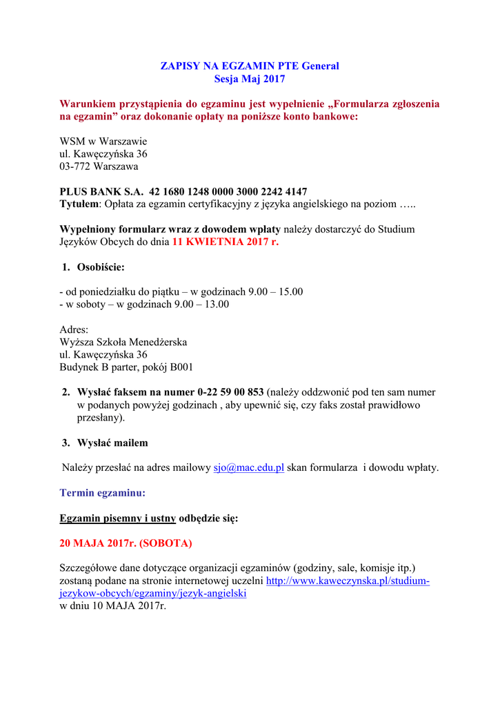 ZAPISY NA EGZAMIN PTE General Sesja Maj 2017 Warunkiem przystąpienia do egzaminu jest wypełnienie „Formularza zgłoszenia na egzamin” oraz dokonanie opłaty na poniższe konto bankowe: WSM w Warszawie ul. Kawęczyńska 36 03-772 Warszawa PLUS BANK S.A. 42 1680 1248 0000 3000 2242 4147 Tytułem: Opłata za egzamin certyfikacyjny z języka angielskiego na poziom ….. Wypełniony formularz wraz z dowodem wpłaty należy dostarczyć do Studium Języków Obcych do dnia 11 KWIETNIA 2017 r. 1. Osobiście: - od poniedziałku do piątku – w godzinach 9.00 – 15.00 - w soboty – w godzinach 9.00 – 13.00 Adres: Wyższa Szkoła Menedżerska ul. Kawęczyńska 36 Budynek B parter, pokój B001 2. Wysłać faksem na numer 0-22 59 00 853 (należy oddzwonić pod ten sam numer w podanych powyżej godzinach , aby upewnić się, czy faks został prawidłowo przesłany). 3. Wysłać mailem Należy przesłać na adres mailowy [email protected] skan formularza i dowodu wpłaty. Termin egzaminu: Egzamin pisemny i ustny odbędzie się: 20 MAJA 2017r. (SOBOTA) Szczegółowe dane dotyczące organizacji egzaminów (godziny, sale, komisje itp.) zostaną podane na stronie internetowej uczelni http://www.kaweczynska.pl/studiumjezykow-obcych/egzaminy/jezyk-angielski w dniu 10 MAJA 2017r.