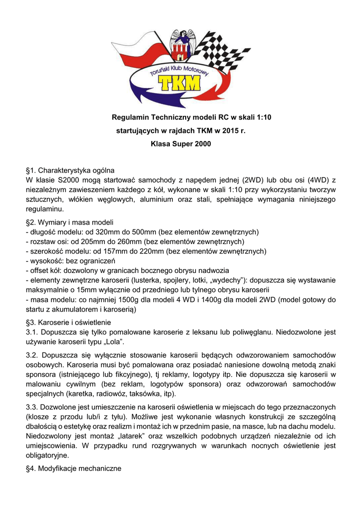 Regulamin Techniczny modeli RC w skali 1:10 startujących w rajdach TKM w 2015 r. Klasa Super 2000 §1. Charakterystyka ogólna W klasie S2000 mogą startować samochody z napędem jednej (2WD) lub obu osi (4WD) z niezależnym zawieszeniem każdego z kół, wykonane w skali 1:10 przy wykorzystaniu tworzyw sztucznych, włókien węglowych, aluminium oraz stali, spełniające wymagania niniejszego regulaminu. §2. Wymiary i masa modeli - długość modelu: od 320mm do 500mm (bez elementów zewnętrznych) - rozstaw osi: od 205mm do 260mm (bez elementów zewnętrznych) - szerokość modelu: od 157mm do 220mm (bez elementów zewnętrznych) - wysokość: bez ograniczeń - offset kół: dozwolony w granicach bocznego obrysu nadwozia - elementy zewnętrzne karoserii (lusterka, spojlery, lotki, „wydechy”): dopuszcza się wystawanie maksymalnie o 15mm wyłącznie od przedniego lub tylnego obrysu karoserii - masa modelu: co najmniej 1500g dla modeli 4 WD i 1400g dla modeli 2WD (model gotowy do startu z akumulatorem i karoserią) §3. Karoserie i oświetlenie 3.1. Dopuszcza się tylko pomalowane karoserie z leksanu lub poliwęglanu. Niedozwolone jest używanie karoserii typu „Lola”. 3.2. Dopuszcza się wyłącznie stosowanie karoserii będących odwzorowaniem samochodów osobowych. Karoseria musi być pomalowana oraz posiadać naniesione dowolną metodą znaki sponsora (istniejącego lub fikcyjnego), tj reklamy, logotypy itp. Nie dopuszcza się karoserii w malowaniu cywilnym (bez reklam, logotypów sponsora) oraz odwzorowań samochodów specjalnych (karetka, radiowóz, taksówka, itp). 3.3. Dozwolone jest umieszczenie na karoserii oświetlenia w miejscach do tego przeznaczonych (klosze z przodu lub/i z tyłu). Możliwe jest wykonanie własnych konstrukcji ze szczególną dbałością o estetykę oraz realizm i montaż ich w przednim pasie, na masce, lub na dachu modelu. Niedozwolony jest montaż „latarek” oraz wszelkich podobnych urządzeń niezależnie od ich umiejscowienia. W przypadku rund rozgrywanych w warunkach nocnych oświetlenie jest obligatoryjne. §4. Modyfikacje mechaniczne Dopuszcza się montaż mechanicznych elementów tunningowych, wpływających na usprawnienie konstrukcji i podnoszących zdolności jezdne. Warunkiem dopuszczenia modyfikacji jest nie wystawanie elementów poza obrys karoserii. §5. Napęd Dopuszcza się zasilanie modelu jednym silnikiem elektrycznym klasy 540, którego moment obrotowy może być przenoszony na koła za pomocą paska, zębatek lub wału. Silnik nie może nosić śladów rozbierania ani modyfikacji, również na zewnątrz stojana, np. dodatkowe magnesy. Zabrania się stosowania urządzeń podnoszących napięcie zasilania regulatora. §6. Silniki i ich zasilanie 6.1. Silniki szczotkowe nierozbieralne klasy 540 - minimalna ilość zwoi: 20 6.2. Silniki szczotkowe dowolnie łożyskowane z wymiennymi szczotkami klasy 540 - minimalna ilość zwoi: 23 6.3. Silniki bezszczotkowe dwupolowe klasy 540 15,5 – 17,5T - uzwojenie gwieździste (star) - ilość zwoi: 15,5 do 17,5 - połączenie: sensorowe lub bezsensorowe 6.4. Zasilanie: - zasilanie dowolne o napięciu nominalnym nie większym niż 7,4V. 6.4.1 Dopuszczalne są - oryginalne pakiety z widocznym logo producenta i opisem umożliwiającym jednoznaczne określenie ich typu oraz pojemności. - pakiety wykonane we własnym zakresie muszą być zbudowane w sposób umożliwiający identyfikację przynajmniej jednej celi – przezroczysta koszulka termokurczliwa albo otwór w „obudowie”. §7. Koła 7.1. Dopuszcza się stosowanie kół gumowych z bieżnikiem lub bez (slick) oraz pełnych z pianki lub mikrogumy o maksymalnej średnicy zewnętrznej 77mm i szerokości od 24mm do 32mm. 7.2. Na śniegu i lodzie za zgodą sędziego zawodów dopuszcza się stosowanie metalowych kolców o maksymalnej długości na zewnątrz opony 1,5mm. Średnicę opony mierzy się bez kolców. 7.3. Dopuszcza się wszystkie rodzaje felg, z wyłaczeniem felg wyścigowych typu Disc. §8. Sterowanie 8.1. Wymagane jest stosowanie aparatur pracujących w systemie proporcjonalnym w pasmach nominalnych 27MHz i 40MHz w modulacji AM lub FM bądź urządzeń w częstotliwości 2,4GHz. W przypadku aparatur kwarcowych wymagane jest posiadanie dwóch kompletów kwarców i zgłoszenie ich częstotliwości podczas rejestracji. Nie zezwala się na stosowanie jakichkolwiek urządzeń elektronicznych wspomagających kierowanie modelem poprzez ingerencję w pracę serwa skrętu. 8.2. Sterowanie serwem skrętu może odbywać się jedynie przy pomocy aparatury. §9. Niezgodność parametrów 9.1. W przypadku stwierdzenia niezgodności parametrów modelu zgłoszonego do danej klasy zawodnik zostaje przeniesiony do odpowiedniej klasy podczas Badania Kontrolnego nr 1 (BK1), jeśli samochód spełnia pozostałe wymogi tej klasy, lub zdyskwalifikowany po stwierdzeniu powyższego podczas Badania Kontrolnego nr 2 (BK2). 9.2. Przeniesienie do innej klasy może wystąpić tylko raz w sezonie dla danego zawodnika. Każde kolejne zgłoszenie do klasy z modelem niezgodnym z regulaminem powoduje niedopuszczenie do zawodów.