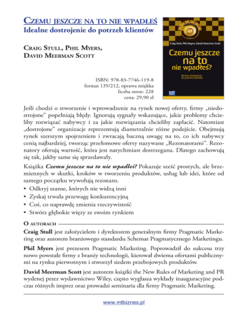 Czemu jeszcze na to nie wpadłeś Idealne dostrojenie do potrzeb klientów Craig Stull, Phil Myers, David Meerman Scott ISBN: 978-83-7746-119-8 format 135/212, oprawa miękka liczba stron: 228 cena: 29,90 zł Jeśli chodzi o stworzenie i wprowadzenie na rynek nowej oferty, firmy „niedostrojone” popełniają błędy. Ignorują sygnały wskazujące, jakie problemy chcieliby rozwiązać nabywcy i za jakie rozwiązania chcieliby zapłacić. Natomiast „dostrojone” organizacje reprezentują diametralnie różne podejście. Obejmują rynek szerszym spojrzeniem i zwracają baczną uwagę na to, co ich nabywcy cenią najbardziej, tworząc przełomowe oferty nazywane „Rezonatorami”. Rezonatory oferują wartość, która jest natychmiast dostrzegana. Dlatego zachowują się tak, jakby same się sprzedawały. Książka Czemu jeszcze na to nie wpadłeś? Pokazuje sześć prostych, ale brzemiennych w skutki, kroków w tworzeniu produktów, usług lub idei, które od samego początku wywołują rezonans. • Odkryj szanse, których nie widzą inni • Zyskaj trwała przewagę konkurencyjną • Coś, co naprawdę zmienia rzeczywistość • Stwórz głębokie więzy ze swoim rynkiem O autorach Craig Stull jest założycielem i dyrektorem generalnym firmy Pragmatic Marketing oraz autorem branżowego standardu Schemat Pragmatycznego Marketingu. Phil Myers jest prezesem Pragmatic Marketing. Poprowadził do sukcesu trzy nowo powstałe firmy z branży technologii, kierował dwiema ofertami publicznymi na rynku pierwotnym i stworzył siedem przebojowych produktów. David Meerman Scott jest autorem książki the New Rules of Marketing and PR wydenej przez wydawnictwo Wiley, często wygłasza wykłady inauguracyjne podczas różnych imprez oraz prowadzi seminaria dla firmy Pragmatic Marketing. www.mtbiznes.pl Czemu jeszcze na to nie wpadłeś SPIS TREŚCI Rozdział 1 Dlaczego na to nie wpadliśmy? ..........................................17 Idealne dostrojenie – proces i ta książka ............................ 19 Po co nas słuchać? ............................................................. 20 Dostrojony agent nieruchomości ........................................ 22 Jak uzyskać idealne dostrojenie? ........................................ 25 Rezonator .......................................................................... 26 Anatomia rezonatora .................................................... 26 Idealnie dostrojona organizacja .......................................... 27 Czy idealne dostrojenie to coś dla ciebie? ........................... 30 Jak dążyć do idealnego dostrojenia?....................................31 Podsumowanie rozdziału ................................................... 33 Rozdział 2 Nie dostrojeni, tylko zgadujący ..........................................35 Przecież jesteśmy ekspertami! ............................................ 37 Dolar, którego nikt nie chciał............................................ 38 Jeśli nie jesteśmy idealnie dostrojeni, to jacy jesteśmy? ....... 39 Obalamy mit, że liczy się tylko innowacja ......................... 40 Obalamy mit, że dochody to sposób na wszystko .............. 43 Obalamy mit, że klienci wiedzą najlepiej ........................... 45 Sprzedaż misyjna? ............................................................. 46 Jesteś idealnie dostrojony czy niedostrojony? ...................... 47 Oprzeć się sile ciążenia ...................................................... 48 Czy twoja lodówka używa… nowego oprogramowania antywirusowego? ...........................................................51 www.mtbiznes.pl Czemu jeszcze na to nie wpadłeś 12 Czemu jeszcze na to nie wpadłeś? Czy to rezonator? .............................................................. 53 Przestań zgadywać ............................................................ 56 Podsumowanie rozdziału ................................................... 57 Rozdział 3 Bądź idealnie dostrojony ....................................................59 Samo słuchanie obecnych klientów nie wystarcza............... 60 To nie wynajem samochodów, tylko Zipcar ....................... 62 Jak firma Zipcar osiągnęła idealne dostrojenie i zbudowała rezonator ................................................... 63 Krok 1 – Wyszukaj nierozwiązane problemy ................ 65 Krok 2 – Zrozum nabywców........................................ 66 Krok 3 – Skwantyfikuj skutki ...................................... 67 Krok 4 – Stwórz przełomową jakość ............................. 69 Krok 5 – Wyartykułuj obiecujące idee.......................... 70 Krok 6 – Wytwórz autentyczne więzi ........................... 72 Wprowadzanie na rynek produktów i usług idealnie dostrojonych ................................................................. 74 Podsumowanie rozdziału ................................................... 75 Rozdział 4 Krok 1 – Wyszukaj nierozwiązane problemy ....................77 Może mieli po prostu szczęście? ......................................... 79 Poszukiwanie problemów .................................................. 81 Wypowiedziane i ciche potrzeby ........................................ 81 Przecież nasza firma nie zajmuje się rozwiązywaniem problemów!................................................................... 82 Pokaż, jak wypisujesz czek ................................................ 83 Spotkania z nabywcami ..................................................... 85 Idealnie dostrojona lista wskazówek przed rozmową ...... 87 Wyszukuj problemy całego rynku, a nie tylko twojej bazy klientów ..................................................... 87 Klienci ......................................................................... 89 Obserwatorzy ............................................................... 89 www.mtbiznes.pl Czemu jeszcze na to nie wpadłeś S