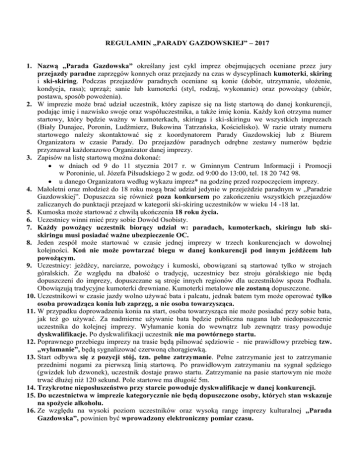 REGULAMIN „PARADY GAZDOWSKIEJ” – 2017 1. Nazwą „Parada Gazdowska” określany jest cykl imprez obejmujących oceniane przez jury przejazdy paradne zaprzęgów konnych oraz przejazdy na czas w dyscyplinach kumoterki, skiring i ski-skiring. Podczas przejazdów paradnych oceniane są konie (dobór, utrzymanie, ułożenie, kondycja, rasa); uprząż; sanie lub kumoterki (styl, rodzaj, wykonanie) oraz powożący (ubiór, postawa, sposób powożenia). 2. W imprezie może brać udział uczestnik, który zapisze się na listę startową do danej konkurencji, podając imię i nazwisko swoje oraz współuczestnika, a także imię konia. Każdy koń otrzyma numer startowy, który będzie ważny w kumoterkach, skiringu i ski-skiringu we wszystkich imprezach (Biały Dunajec, Poronin, Ludźmierz, Bukowina Tatrzańska, Kościelisko). W razie utraty numeru startowego należy skontaktować się z koordynatorem Parady Gazdowskiej lub z Biurem Organizatora w czasie Parady. Do przejazdów paradnych odrębne zestawy numerów będzie przyznawał każdorazowo Organizator danej imprezy. 3. Zapisów na listę startową można dokonać: w dniach od 9 do 11 stycznia 2017 r. w Gminnym Centrum Informacji i Promocji w Poroninie, ul. Józefa Piłsudskiego 2 w godz. od 9:00 do 13:00, tel. 18 20 742 98. u danego Organizatora według wykazu imprez* na godzinę przed rozpoczęciem imprezy. 4. Małoletni oraz młodzież do 18 roku mogą brać udział jedynie w przejeździe paradnym w „Paradzie Gazdowskiej”. Dopuszcza się również poza konkursem po zakończeniu wszystkich przejazdów zaliczanych do punktacji przejazd w kategorii ski-skiring uczestników w wieku 14 -18 lat. 5. Kumoska może startować z chwilą ukończenia 18 roku życia. 6. Uczestnicy winni mieć przy sobie Dowód Osobisty. 7. Każdy powożący uczestnik biorący udział w: paradach, kumoterkach, skiringu lub skiskiringu musi posiadać ważne ubezpieczenie OC. 8. Jeden zespół może startować w czasie jednej imprezy w trzech konkurencjach w dowolnej kolejności. Koń nie może powtarzać biegu w danej konkurencji pod innym jeźdźcem lub powożącym. 9. Uczestnicy: jeźdźcy, narciarze, powożący i kumoski, obowiązani są startować tylko w strojach góralskich. Ze względu na dbałość o tradycję, uczestnicy bez stroju góralskiego nie będą dopuszczeni do imprezy, dopuszczane są stroje innych regionów dla uczestników spoza Podhala. Obowiązują tradycyjne kumoterki drewniane. Kumoterki metalowe nie zostaną dopuszczone. 10. Uczestnikowi w czasie jazdy wolno używać bata i palcatu, jednak batem tym może operować tylko osoba prowadząca konia lub zaprzęg, a nie osoba towarzysząca. 11. W przypadku doprowadzenia konia na start, osoba towarzysząca nie może posiadać przy sobie bata, jak też go używać. Za nadmierne używanie bata będzie publiczna nagana lub niedopuszczenie uczestnika do kolejnej imprezy. Wyłamanie konia do wewnątrz lub zewnątrz trasy powoduje dyskwalifikacje. Po dyskwalifikacji uczestnik nie ma powtórnego startu. 12. Poprawnego przebiegu imprezy na trasie będą pilnować sędziowie - nie prawidłowy przebieg tzw. „wyłamanie”, będą sygnalizować czerwoną chorągiewką. 13. Start odbywa się z pozycji stój, tzn. pełne zatrzymanie. Pełne zatrzymanie jest to zatrzymanie przednimi nogami za pierwszą linią startową. Po prawidłowym zatrzymaniu na sygnał sędziego (gwizdek lub dzwonek), uczestnik dostaje prawo startu. Zatrzymanie na pasie startowym nie może trwać dłużej niż 120 sekund. Pole startowe ma długość 5m. 14. Trzykrotne nieposłuszeństwo przy starcie powoduje dyskwalifikacje w danej konkurencji. 15. Do uczestnictwa w imprezie kategorycznie nie będą dopuszczone osoby, których stan wskazuje na spożycie alkoholu. 16. Ze względu na wysoki poziom uczestników oraz wysoką rangę imprezy kulturalnej „Parada Gazdowska”, powinien być wprowadzony elektroniczny pomiar czasu. 17. W kumoterkach startuje kumoter z kumoską (przebierańcy nie będą klasyfikowani). 18. Uczestnik może wnosić protest do Komisji Sędziowskiej przed rozdaniem nagród (wpłata 50 zł). 19. Za prawidłowe przeprowadzenie imprezy odpowiedzialny jest Sędzia Główny. *Wykaz imprez w poszczególnych miejscowościach wraz z osobą odpowiedzialną: Biały Dunajec, GOK dyr. Bartłomiej Kudasik tel. 18 20 016 90, 605 128 391, [email protected]; Krzysztof Jarosz tel. 660 544 333 Poronin, GCIiP Łukasz Nodzyński, tel. 18 20 742 98, tel. 608 381 828, [email protected] Ludźmierz, Oddział Związku Podhalan, Ewa Iwulska tel. 18 26 555 95, 606 394 095, [email protected], [email protected] Bukowina Tatrzańska, BCK dyr. Bartłomiej Koszarek tel. 721 007 221, [email protected] Kościelisko, Urząd Gminy Kościelisko Anna Fidermak, tel. 18 20 79 100 wew. 32, [email protected] oraz GOKR Kościelisko, dyr. Małgorzata Karpiel –Bzdyk tel. 18 20 700 51 [email protected] Szaflary, Gminne Centrum Kultury, Promocji i Turystyki dyr. Maciej Szostak tel.18 27 123 37, [email protected] Zakopane, Związek Podhalan Oddział Zakopane Andrzej Skupień tel. 509 796 566 Koordynator Parady Gazdowskiej 2017 Gminne Centrum Informacji i Promocji w Poroninie ul. Józefa Piłsudskiego 2, tel. 18 20 742 98,