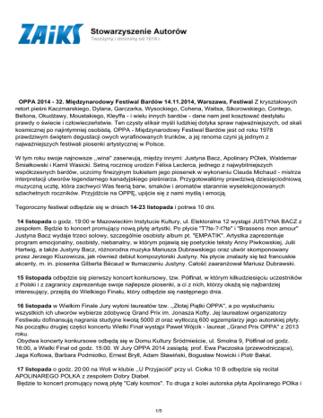 OPPA 2014 - 32. Międzynarodowy Festiwal Bardów 14.11.2014, Warszawa, Festiwal Z kryształowych retort pieśni Kaczmarskiego, Dylana, Garczarka, Wysockiego, Cohena, Waitsa, Sikorowskiego, Contego, Bellona, Okudżawy, Moustakiego, Kleyffa - i wielu innych bardów - dane nam jest kosztować destylatu prawdy o świecie i człowieczeństwie. Ten czysty eliksir myśli ludzkiej dotyka spraw najważniejszych, od skali kosmicznej po najintymniej osobistą. OPPA - Międzynarodowy Festiwal Bardów jest od roku 1978 prawdziwym świętem degustacji owych wyrafinowanych trunków, a jej renoma czyni ją jednym z najważniejszych festiwali piosenki artystycznej w Polsce. W tym roku swoje najnowsze ,,wina'' zaserwują, między innymi: Justyna Bacz, Apolinary POlek, Waldemar Śmiałkowski i Kamil Wasicki. Setną rocznicę urodzin Félixa Leclerca, jednego z najwybitniejszych współczesnych bardów, uczcimy finezyjnym bukietem jego piosenek w wykonaniu Clauda Michaud - mistrza interpretacji utworów legendarnego kanadyjskiego pieśniarza. Przygotowaliśmy prawdziwą dziesięciodniową muzyczną ucztę, która zachwyci Was feerią barw, smaków i aromatów starannie wyselekcjonowanych szlachetnych roczników. Przyjdźcie na OPPĘ, upijcie się z nami myślą i emocją. Tegoroczny festiwal odbędzie się w dniach 14-23 listopada i potrwa 10 dni. 14 listopada o godz. 19:00 w Mazowieckim Instytucie Kultury, ul. Elektoralna 12 wystąpi JUSTYNA BACZ z zespołem. Będzie to koncert promujący nową płytę artystki. Po płycie "T?te-?-t?te" i "Brassens mon amour" Justyna Bacz wydaje trzeci solowy, szczególnie osobisty album pt. "EMPATIK". Artystka zaprezentuje program emocjonalny, osobisty, niebanalny, w którym pojawią się poetyckie teksty Anny Piwkowskiej, Julii Hartwig, a także Justyny Bacz, różnorodna muzyka Mariusza Dubrawskiego oraz utwór skomponowany przez Jerzego Kluzowicza, jak również debiut kompozytorski Justyny. Na płycie znalazły się też francuskie akcenty, m. in. piosenka Gilberta Bécaud w tłumaczeniu Justyny. Całość zaaranżował Mariusz Dubrawski. 15 listopada odbędzie się pierwszy koncert konkursowy, tzw. Półfinał, w którym kilkudziesięciu uczestników z Polski i z zagranicy zaprezentuje swoje najlepsze piosenki, a ci z nich, którzy okażą się najbardziej interesujący, przejdą do Wielkiego Finału, który odbędzie się następnego dnia. 16 listopada w Wielkim Finale Jury wyłoni laureatów tzw. ,,Złotej Piątki OPPA'', a po wysłuchaniu wszystkich ich utworów wybierze zdobywcę Grand Prix im. Jonasza Kofty. Jej laureatowi organizatorzy Festiwalu dofinansują nagrania studyjne kwotą 5000 zł oraz wytłoczą 600 egzemplarzy jego autorskiej płyty. Na początku drugiej części koncertu Wielki Finał wystąpi Paweł Wójcik - laureat ,,Grand Prix OPPA'' z 2013 roku. Obydwa koncerty konkursowe odbędą się w Domu Kultury Śródmieście, ul. Smolna 9, Półfinał od godz. 16:00, a Wielki Finał od godz. 15:00. W Jury OPPA 2014 zasiądą: prof. Ewa Paczoska (przewodnicząca), Jaga Koftowa, Barbara Podmiotko, Ernest Bryll, Adam Sławiński, Bogusław Nowicki i Piotr Bakal. 17 listopada o godz. 20:00 na Woli w klubie ,,U Przyjaciół'' przy ul. Ciołka 10 B odbędzie się recital APOLINAREGO POLKA z zespołem Dobry Diabeł. Będzie to koncert promujący nową płytę "Cały kosmos". To druga z kolei autorska płyta Apolinarego POlka i 1/5 pierwsza z zespołem Dobry Diabeł. Repertuar to autorskie utwory w brzmieniu i stylu łączącym w sobie wpływy amerykańskiego folku, piosenki poetyckiej i turystycznej, bluesa, bluegrassu, muzyki ludowej i klasycznej. Teksty traktują o szczęściu, wdzięczności, o miłości i tęsknocie, a także o niezwykłych miejscach i postaciach. Akustyczne brzmienie całości utrzymane jest w atmosferze radości i umiłowania piękna, a jednocześnie melancholii i zadumy. 18 listopada o godz. 19:00 zapraszamy do Piwnicy na Wójtowskiej na recital WALDEMARA ŚMIAŁKOWSKIEGO, laureata Grand Prix OPPA 1998, który promować będzie swoją nową płytę ,,Hotel Film''. Artyście towarzyszyć będzie na gitarze Andrzej Czamara. 19 listopada o godz. 19:00 w Domu Kultury Praga, ul. Dąbrowszczaków 2 wystąpi KAMIL WASICKI z zespołem - laureat Grand Prix im. Jonasza Kofty z 2009 roku, promujący nową płytę "Dobre rzeczy się zdarzają". Po trzech latach od fonograficznego debiutu płyty "Chwyć mnie za rękę" Kamil Wasicki wydaje swój drugi album. Nowe wydawnictwo zawiera dziewięć poetyckich, autorskich utworów o bluesowo-rockowym zabarwieniu. 20 listopada o godz. 20:00 zapraszamy do Ośrodka Kultury Ochoty na wieczór HOMMAGE A SERGE GAINSBOURG ? koncert poświęcony życiu i twórczości jednego z najbardziej kontrowersyjnych twórców piosenki francuskiej, skandalisty i promotora rewolucji seksualnej przełomu lat 60. i 70., zmarłego w 1991 roku w Paryżu. Wystąpią wokaliści zespołu ,,Piąty dzień'': Katarzyna Kucharzewska, Dominika Świątek, René Koelblen i Stanisław Waszak oraz gościnnie Piotr Bakal, tekst biograficzny o Gainsbourgu, scenariusz i reżyseria: René Koelblen, czyta Krystyna Czubówna, akompaniuje zespół pod kierownictwem Andrzeja Perkmana. 21 listopada, o godzinie 19:00 zapraszamy do Muzycznego Studia Polskiego Radia im. Agnieszki Osieckiej na Koncert Galowy pt. ,,Premiery i Interpretacje OPPA 2014''. Jest to tradycyjny, dwuczęściowy koncert, w którym w pierwszej części z premierowymi utworami wystąpi kilkunastu znanych twórców piosenki autorskiej, a publiczność w specjalnym plebiscycie wybierze najlepszą piosenkę premierową. W drugiej części piosenki sławnych bardów zagranicznych zaprezentowane zostaną w polskich wersjach językowych przez polskich bardów. Wystąpią: Dominika Barabas, Małgorzata Wojciechowska, Piotr Bakal, Marek Bartkowicz, Andrzej Brzeski, Grzegorz Bukała, Jacek Gutry, Roman Kołakowski, Tomasz Kordeusz, Jacek Łapot, Marek Majewski, Andrzej Ozga, Mateusz Rulski,
