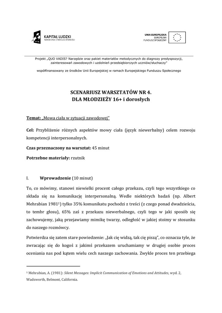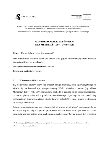 Projekt „QUO VADIS? Narzędzie oraz pakiet materiałów metodycznych do diagnozy predyspozycji, zainteresowań zawodowych i uzdolnień przedsiębiorczych uczniów/słuchaczy” współfinansowany ze środków Unii Europejskiej w ramach Europejskiego Funduszu Społecznego SCENARIUSZ WARSZTATÓW NR 4. DLA MŁODZIEŻY 16+ i dorosłych Temat: „Mowa ciała w sytuacji zawodowej” Cel: Przybliżenie różnych aspektów mowy ciała (język niewerbalny) celem rozwoju kompetencji interpersonalnych. Czas przeznaczony na warsztat: 45 minut Potrzebne materiały: rzutnik I. Wprowadzenie (10 minut) To, co mówimy, stanowi niewielki procent całego przekazu, czyli tego wszystkiego co składa się na komunikację interpersonalną. Wedle niektórych badań (np. Albert Mehrabian 19811) tylko 35% komunikatu pochodzi z treści (z czego ponad dwadzieścia, to tembr głosu), 65% zaś z przekazu niewerbalnego, czyli tego w jaki sposób się zachowujemy, jaką przejawiamy mimikę twarzy, odległość w jakiej stoimy w stosunku do naszego rozmówcy. Potwierdza się zatem stare powiedzenie: „Jak cię widzą, tak cię piszą”, co oznacza tyle, że zwracając się do kogoś z jakimś przekazem uruchamiamy w drugiej osobie proces oceniania nas pod kątem wielu cech naszego zachowania. Zwykle proces ten przebiega 1 Mehrabian, A. (1981): Silent Messages: Implicit Communication of Emotions and Attitudes, wyd. 2, Wadsworth, Belmont, California. Projekt „QUO VADIS? Narzędzie oraz pakiet materiałów metodycznych do diagnozy predyspozycji, zainteresowań zawodowych i uzdolnień przedsiębiorczych uczniów/słuchaczy” współfinansowany ze środków Unii Europejskiej w ramach Europejskiego Funduszu Społecznego w sposób nieświadomy. Mimo, że koncentrujemy się na tym, co ktoś do nas mówi, nasz mózg analizuje tysiące bitów informacji, związanych z wyglądem, sposobem mówienia i zachowaniem naszego rozmówcy. Stosunek do innych osób zatem, głównie ustanawiamy dzięki komunikatom niewerbalnym. Są one szalenie istotne w wywieraniu pierwszego wrażenia. Ponad dziewięćdziesiąt procent naszych ocen na temat drugiego człowieka powstaje w pierwszych dziesięciu sekundach rozmowy. Dlatego pierwsze wrażenie jest takie ważne! Efekt wpływu pierwszego wrażenia, nazywany jest „efektem świeżości” i często wiązany jest z drugim efektem, tzw. „efektem halo”. Efekt halo polega na tym, że pierwsze wrażenie niejako rozlewa się na inne obszary naszej oceny. Przykładowo, jeśli ktoś uznany od razu zostanie jako ładny i zadbany (uroda), od razu może to zostać powiązane z takimi cechami jak: inteligencja, odpowiedzialność, szlachetność itp. Należy również pamiętać, że raz wywarte wrażenie trudno jest zmienić! Zadanie 1. (10 minut) „PIĘKNA, MĄDRA I SZLACHETNA…” KROK 1: Wyświetlenie za pomocą rzutnika, bądź rozdanie wcześniej przygotowanych kartek z dwoma zdjęciami kobiet (Załącznik 1). Projekt „QUO VADIS? Narzędzie oraz pakiet materiałów metodycznych do diagnozy predyspozycji, zainteresowań zawodowych i uzdolnień przedsiębiorczych uczniów/słuchaczy” współfinansowany ze środków Unii Europejskiej w ramach Europejskiego Funduszu Społecznego KROK 2: Przekazanie poniżej instrukcji: Proszę, abyście Państwo przyjrzeli się kobiecie na zdjęciu A i postarali się ją opisać, wymieniając przynamniej trzy cechy jej charakteru. Proszę czuć się swobodnie, istnieje bardzo duże prawdopodobieństwo, że nigdy nie spotkacie tej kobiety. A teraz proszę przyjrzeć się kobiecie na zdjęciu B. Jakie cechy charakteru przypisalibyście tej kobiecie? Na wykonanie tego zadania jest przeznaczonych 10 minut. Po przeprowadzeniu ćwiczenia Prowadzący może zadać wszystkim Uczestnikom następujące pytania: 1. Czy cechy, jakie przypisaliście tym kobietom są takie same, czy różne? Jeśli różne, to na czym polegają różnice? 2. Jak sądzicie Państwo, której z tych kobiet szybciej zaoferowano by pracę w księgowości? A w marketingu? Skąd wiadomo, że te kobiety nadawałyby się do takiej pracy? Jak na to wpadliście? Zadanie 2. (10 minut) „MOWA CIAŁA, KTÓRA NAS ZDRADZA” KROK 1: Wprowadzenie przez Prowadzącego do dalszej części warsztatów. Prowadzący może powiedzieć: Teraz przejdziemy do omawiania różnych gestów, mimiki i pozycji ciała, które mogą zdradzać nasze intencje. Jest to szczególnie istotne podczas rozmowy kwalifikacyjnej. KROK 2: Wyświetlenie za pomocą rzutnika, bądź rozdanie wcześniej przygotowanych kartek z opisem poszczególnych pozycji mowy ciała. Można też poprosić osoby chętne do aktywnego udziału, które zechcą zaprezentować daną postawę, bądź wyraz twarzy. ------------------------------------------------------------------------------------------------- Projekt „QUO VADIS? Narzędzie oraz pakiet materiałów metodycznych do diagnozy predyspozycji, zainteresowań zawodowych i uzdolnień przedsiębiorczych uczniów/słuchaczy” współfinansowany ze środków Unii Europejskiej w ramach Europejskiego Funduszu Społecznego 1. Brak kontaktu wzrokowego z rozmówcą. Podczas rozmowy nie należy „świdrować” oczami rozmówcy, ale dobrze jest patrzeć mu w oczy, przynajmniej wówczas, kiedy do nas mówi. Szczególnie jest to istotne w momencie przywitania (np. poprzez podanie dłoni). ------------------------------------------------------------------------------------------------Pytanie do Uczestników: Co można wyczytać z braku kontaktu wzrokowego? Co to może oznaczać? Brak kontaktu wzrokowego może oznaczać zmieszanie, nieśmiałość ale także ignorowanie rozmówcy. Może także być odebrane jako wyraz braku szczerości. ------------------------------------------------------------------------------------------------2. Nieodpowiednia postawa ciała (bujanie się na krześle, garbienie się, zwieszanie ramion). Podczas rozmowy dobrze jest przyjąć postawę wyprostowaną ale naturalną. Odchyl