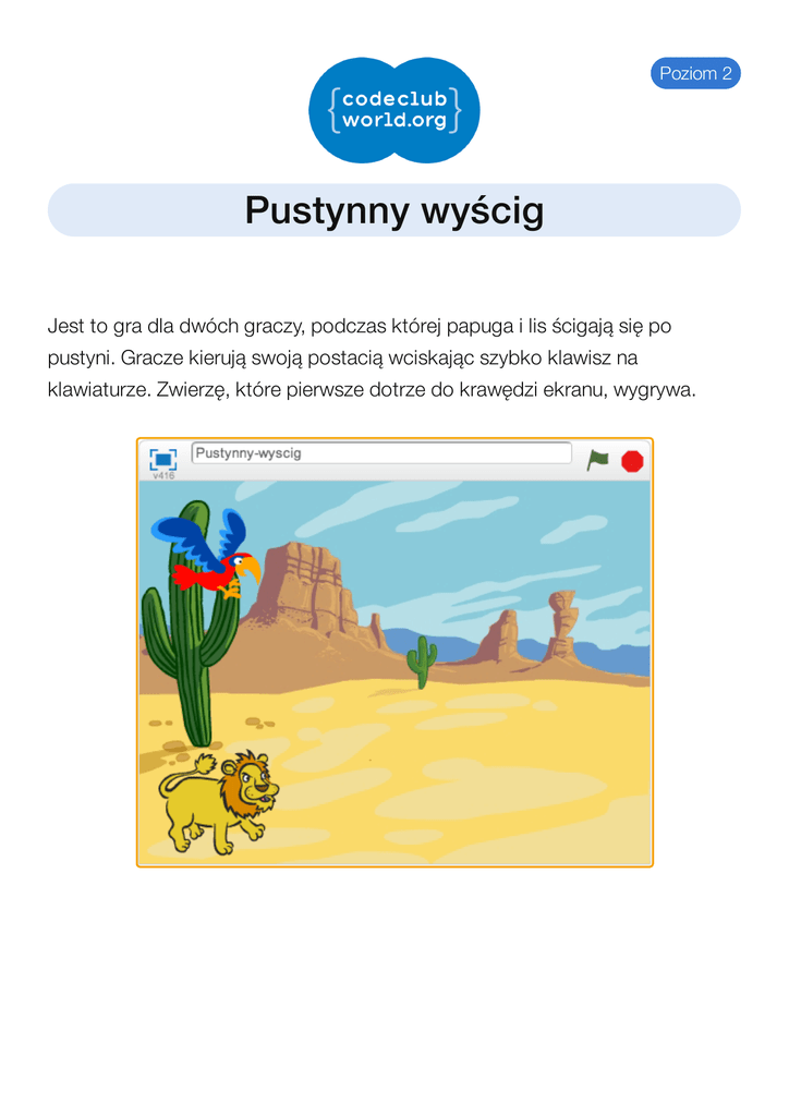 Poziom 2 Pustynny wyścig Jest to gra dla dwóch graczy, podczas której papuga i lis ścigają się po pustyni. Gracze kierują swoją postacią wciskając szybko klawisz na klawiaturze. Zwierzę, które pierwsze dotrze do krawędzi ekranu, wygrywa. Kliknij na scenę i dodaj tło z pustynią z katalogu Natura. Dodaj nowego duszka i wybierz kostium lwa z katalogu ze zwierzętami. Dodaj kolejnego duszka i wybierz kostium papugi. była mniej więcej rozmiarów lwa. Zmniejsz ją tak, aby Chcemy, aby duszki poruszały się kiedy naciśniesz klawisz. Na początek wybierzmy lwa i ustawmy, aby poruszał się o 4 kroki po wciśnięciu klawisza 'L' Teraz pora na papugę. Ustawmy, aby przesuwała się o 4 kroki po wciśnięciu klawisza 'A'. Wciśnij zieloną flagę Czy lew i papuga poruszają się po ekranie, gdy wciskasz 'A' i 'L'? Aby móc określić później, kto wygrał, musimy najpierw wiedzieć, kiedy wyścig się rozpoczął. Dodajmy przycisk Start. Dodaj nowego duszka z pliku. Wybierz przycisk z katalogu "things". Przejdź do edycji kostiumu, napisz na nim 'Start' i wciśnij OK. Przesuń duszka na środek sceny. Dodaj do niego skrypt, który pokazuje przycisk, kiedy gra jest uruchomiona: Teraz chcemy, aby przycisk odliczał od 3 w dół i ogłaszał start wyścigu, a następnie się chował. Dodaj poniższy skrypt: Wciśnij zieloną flagę Czy widzisz odliczanie po kliknięciu przycisku? Czy przycisk znika po zakończeniu odliczania? Chcemy, aby ścigający poruszali się tylko po rozpoczęciu wyścigu. Chcemy też wiedzieć, kiedy wyścig się zakończył. Będziemy potrzebować zmiennej do przechowywania tej informacji. Dodaj zmienną do wszystkich duszków i nazwij ją wyścig. Odznacz pole przy niej, aby nie było jej widać na scenie. Teraz ustaw wyścig na 0, kiedy gra się rozpocznie. Dodaj ten krok do skryptu przycisku: Następnie ustaw zmienną wyścig zmieniała się na 1 po skończeniu odliczania. Teraz musimy się upewnić, że lew i papuga mogą się ruszać tylko wtedy, kiedy zmienna wyścig jest ustawiona na 1. Kliknij na duszka z papugą. Dodaj blok kontroli do skryptu, który pozwala papudze ruszać się tylko wtedy, gdy zmienna wyścig = 1. Zrób to samo dla lwa. Wciśnij zieloną flagę Czy lew i papuga ruszają się tylko po zakończeniu odliczania? Teraz chcemy notować, kto wygrał wyścig i usuwać tę informację po zakończeniu gry, aby można było zacząć od nowa. Dodaj blok do skryptu papugi, który ustawia zmienną wyścig na 0, kiedy papuga dotknie brzegu ekranu. Teraz chcemy, aby papuga dała nam znać, czy wygrała. Nagraj nowy dźwięk dla papugi, który będzie odegrany, jeżeli papuga wygra. Przejdź na kartę dźwięki duszka i nagraj odgłos zwycięstwa! Dodaj do skryptu komendę, która Powtórz to samo dla lwa. zagra to nagranie po wygranej: Wciśnij zieloną flagę Czy działa rozpoczynanie wyścigu po wciśnięciu przycisku? Można się ścigać wciskając przyciski 'A' i 'L'? Czy duszki dobrze ogłaszają, który z nich wygrał? Po zakończeniu wyścigu musimy powiedzieć wszystkim duszkom, że to koniec i zresetować grę, aby mogła się zacząć od nowa. Duszek, który wygra, musi ogłosić swoje zwycięstwo. Kliknij na papugę i dodaj do skryptu ogłaszanie końca wyścigu po wygranej. Teraz musimy dodać nowy skrypt, który nasłuchuje, czy wyścig został zakończony i jeżeli tak, to przesuwa papugę na linię startu. Dodaj takie same skrypty dla lwa. W przypadku tego drugiego przetestuj inne wartości dla x, aby lew i papuga byli równo ustawieni na starcie. Chcemy też, aby lew i papuga byli równo ustawieni po rozpoczęciu wyścigu, więc dodaj do obu duszków poniższy skrypt, który ustawia je równo po wciśnięciu flagi: Przejdź do duszka przycisku i dodaj skrypt, który go pokazuje po otrzymaniu komunikatu, że wyścig się zakończył. Wciśnij zieloną flagę Możesz się ścigać z kolegą, kiedy jedno z was kieruje papugą wciskając 'A', a drugie kieruje lwem wciskając 'L'? Spróbuj dodać dopalacz, który każdy duszek może użyć tylko raz podczas wyścigu. Dopalacz przesuwa postać w przód o 30 kroków. Dodaj nowy kostium z płomieniem za każdym duszkiem i ustaw, aby się pokazywał, kiedy dopalacz zostanie użyty. Nagraj następny dźwięk, który będzie odegrany po użyciu dopalacza. blocks kiedy klawisz [p v] naciśnięty jeżeli <<(wyścig) = [1]> and <(dopalacz) = [0]>> to zmień kostium na [parrot‐dopalacz v] ustaw [dopalacz v] na [1] przesuń o (4) kroków jeżeli <dotyka [krawędź v]?> to ustaw (wyścig) na [0] zagraj dźwięk [nagranie1 v] powiedz [Papuga wygrała!] przez (3) s nadaj [koniec v] Ten sam kod, który sprawdza, czy wyścig się skończył jest używany teraz w dwóch miejscach dla każdego duszka: kiedy duszek normalnie się porusza i kiedy rusza się z dopalaczem. Możemy uprościć nasz skrypt tworząc własny blok, w którym znajdą się bloki, które do tej pory powtarzały się w wielu miejscach. Pokaż skrypt papugi. Wybierz paletę Więcej bloków i kliknij na przycisk Stwórz blok . Nadaj nowemu blokowi nazwę wpisując "zakończony" w różowe pole. Następnie kliknij OK. Zauważ, że blok definiuj zakończony pojawił się w oknie ze skryptami. Przeciągnij go na puste miejsce tak, aby nie zasłaniał innych skryptów. Odłącz blok pod blok jeżeli dotyka krawędź? to i przeciągnij go podłączając definiuj zakończony. ```blocks definiuj zakończony jeżeli to ustaw (wyścig) na [0] zagraj dźwięk [nagranie1 v] powiedz [Papuga wygrała!] przez (3) s nadaj [koniec v] kiedy klawisz [p v] naciśnięty jeżeli <<(wyścig) = [1]> and <(dopalacz) = [0]>> to zmień kostium na [parrot‐dopalacz v] ustaw [dopalacz v] na [1] przesuń o (4) kroków zakończony ``` Czy możesz przeciągnąć blok zakończony z palety i użyć go jak każdego innego bloku? Usuń pozostałe bloki jeżeli dotyka krawędź? to wstaw w ich miejsce twój blok z twojego skryptu i zakończony. Czy to sprawiło, 