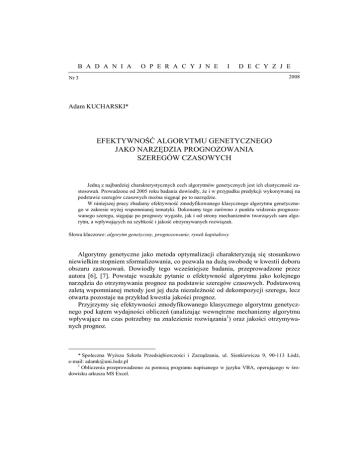 B A D A N I A O P E R A C Y J N E I D E C Y Z J E 2008 Nr 3 Adam KUCHARSKI* EFEKTYWNOŚĆ ALGORYTMU GENETYCZNEGO JAKO NARZĘDZIA PROGNOZOWANIA SZEREGÓW CZASOWYCH Jedną z najbardziej charakterystycznych cech algorytmów genetycznych jest ich elastyczność zastosowań. Prowadzone od 2005 roku badania dowiodły, że i w przypadku predykcji wykonywanej na podstawie szeregów czasowych można sięgnąć po to narzędzie. W niniejszej pracy zbadamy efektywność zmodyfikowanego klasycznego algorytmu genetycznego w zakresie wyżej wspomnianej tematyki. Dokonamy tego zarówno z punktu widzenia prognozowanego szeregu, sięgając po prognozy wygasłe, jak i od strony mechanizmów tworzących sam algorytm, a wpływających na szybkość i jakość otrzymywanych rozwiązań. Słowa kluczowe: algorytm genetyczny, prognozowanie, rynek kapitałowy Algorytmy genetyczne jako metoda optymalizacji charakteryzują się stosunkowo niewielkim stopniem sformalizowania, co pozwala na dużą swobodę w kwestii doboru obszaru zastosowań. Dowiodły tego wcześniejsze badania, przeprowadzone przez autora [6], [7]. Powstaje wszakże pytanie o efektywność algorytmu jako kolejnego narzędzia do otrzymywania prognoz na podstawie szeregów czasowych. Podstawową zaletą wspomnianej metody jest jej duża niezależność od dekompozycji szeregu, lecz otwarta pozostaje na przykład kwestia jakości prognoz. Przyjrzymy się efektywności zmodyfikowanego klasycznego algorytmu genetycznego pod kątem wydajności obliczeń (analizując wewnętrzne mechanizmy algorytmu wpływające na czas potrzebny na znalezienie rozwiązania1) oraz jakości otrzymywanych prognoz. * Społeczna Wyższa Szkoła Przedsiębiorczości i Zarządzania, ul. Sienkiewicza 9, 90-113 Łódź, e-mail: [email protected] 1 Obliczenia przeprowadzono za pomocą programu napisanego w języku VBA, operującego w środowisku arkusza MS Excel. 44 A. KUCHARSKI 1. Zastosowany algorytm genetyczny i jego modyfikacje Zastosowany algorytm podobny jest w swoim działaniu do metod naiwnych, używanych w prognozowaniu niestrukturalnym. Wspomniana grupa modeli bazuje na założeniu, iż czynniki determinujące zjawisko do tej pory, zachowają swój wpływ w najbliższej przyszłości na dotychczasowym poziomie i w niezmieniony sposób [1], [2]. Skutkuje to tym, że np. prognoza ex post na dany okres równa jest wartości szeregu z okresu bezpośrednio poprzedzającego (jak w przypadku metody naiwnej prostej) lub wcześniejszego (metoda naiwna z sezonowością). Prezentowany algorytm można traktować jako swoiste uogólnienie wspomnianego powyżej postępowania. Obie wymienione metody, będące inspiracją tworzonych chromosomów, podlegają silnym ograniczeniom, jeśli chodzi o dekompozycję szeregu czasowego. Zaleca się na przykład stosować je przy niewielkich wahaniach przypadkowych. Poza tym występuje wyraźne ograniczenie horyzontu czasowego danej tworzącej prognozę. Opisana w pracy metoda jest pod tym względem bardziej elastyczna, choć idea mechanizmu powstawania prognoz nie zmieniła się. Wśród danych z przeszłości poszukujemy wartości, która stanie się prognozą na bieżący okres. Wartość ta zostaje jednak uzmienniona i może zmieniać się w kolejnych prognozach. Nadal jednak predykcja ex ante dotyczy krótkiego horyzontu czasowego. Algorytm genetyczny od metody naiwnej różni maksymalny, dopuszczalny numer opóźnienia danej rzeczywistej, będącej prognozą dla aktualnego okresu, który oznaczymy jako tm. Nie jest on bowiem stały, lecz przyjmuje wartości z pewnego przedziału. Parametr ów ustala się przed rozpoczęciem obliczeń i do ich końca pozostaje niezmieniony. Przyjmuje wartości z przedziału <1, n – 2>, gdzie n oznacza liczbę posiadanych obserwacji, co powoduje, iż pierwsza prognoza ex post powstaje dla trzeciego okresu. Nie wymagamy jednak, aby dana prognoza sięgała w przeszłość na maksymalną możliwą głębokość. Zobrazujmy to następującym przykładem: Niech y(t) oznacza pewien hipotetyczny szereg, dla którego liczba obserwacji n = 5. Wartość tm przyjmijmy na poziomie równym 3. Prognozowana wartość równa się jednej z obserwacji pochodzących sprzed t – tm okresów, np. w okresie trzecim będzie to yt–1 lub yt–2. Możliwe szeregi prognoz to m.in.: 1. yt–1, yt–1, yt–2. 2. yt–1, yt–2, yt–2. Z uwagi na to, iż tworzonych w ten sposób potencjalnych szeregów prognoz przybywa lawinowo, należy użyć algorytmu genetycznego. Jego zadanie to znalezienie takiego zbioru opóźnionych wartości, który da jak najmniejszy błąd prognozy. Ostatnia dana rzeczywista nie staje się prognozą ex post. Wykorzystywana jest dopiero w chwili wyznaczania prognoz ex ante, które tworzy się następująco: Efektywność algorytmu genetycznego... 45 1. Wyznaczamy prognozę ex post na podstawie kryterium, które stanowi wybrana miara błędów prognoz ex post2. 2. Określamy wartość opóźnienia wskazującego, które dane rzeczywiste wezmą udział w tworzeniu prognoz ex ante. Do tego celu może posłużyć dominanta lub mediana wartości opóźnień wykorzystywanych podczas tworzenia prognoz ex post. Odnosząc się do przedstawionego przykładu, w pierwszym przypadku mediana wynosi 1, a w drugim 2 okresy. Dalsze postępowanie zależy od wyników dekompozycji szeregu czasowego. W razie wystąpienia stałego poziomu zmiennej prognozą ex ante może być wartość rzeczywista z ostatniego okresu lub któregoś z okresów wcześniejszych, wskazanych przez dominantę (względnie medianę) opóźnień. Ostatnia dana rzeczywista staje się ostatnią z prognoz ex ante. Dla szeregów, w których stwierdzono trend liniowy wartość, o której była mowa wcześniej korygujemy o przyrost między ostatnią obserwacją, a tą wskazaną przez wybraną miarę statystyczną. Należy oczywiście pamiętać o krótkookresowym charakterze takich prognoz. Algorytm genetyczny przeszedł modyfikacje stosowne do zaproponowane
