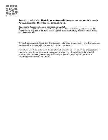 Jedzmy zdrowo! Krótki przewodnik po zdrowym odżywianiu Prowadzenie: Dominika Brzeżańska Nowohucka Akademia Seniora zaprasza na wykład: "Jedzmy zdrowo! Krótki przewodnik po zdrowym odżywianiu",który odbędzie się 17 października o godzinie 15.00 w Klubie Jędruś- Ośrodka Kultury Kraków – Nowa Huta, oś. Centrum A 6a. Wykład poprowadzi Dominika Brzeżańska – doradca żywieniowy, z wykształcenia pielęgniarka, propaguje zdrowy styl życia i żywienia. Tematyka wykładu dotyczyć będzie takich zagadnień jak: choroby dietozależne – cukrzyca typu II, osteoporoza, nowotwory, choroby układu krążenia oraz ich profilaktyka; indeks glikemiczny (IG) – czym jest IG, jego wykorzystanie w zapobieganiu chorób, test na IG. Powered by TCPDF (www.tcpdf.org)
