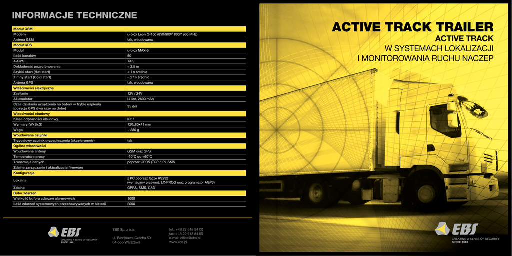 INFORMACJE TECHNICZNE Moduł GSM Modem u-blox Leon G-100 (850/900/1800/1900 MHz) Antena GSM tak, wbudowana Moduł GPS Moduł u-blox MAX-6 Ilość kanałów 50 A-GPS TAK Dokładność pozycjonowania < 2.5 m Szybki start (Hot start) < 1 s średnio Zimny start (Cold start) < 27 s średnio Antena GPS tak, wbudowana Właściwości elektryczne Zasilanie 12V / 24V Akumulator Li-Ion, 2600 mAh Czas działania urządzenia na baterii w trybie uśpienia (pozycja GPS dwa razy na dobę) 35 dni Własciwości obudowy Klasa odporności obudowy IP67 Wymiary (WxSxG) 120x80x41 mm Waga ~ 280 g Wbudowane czujniki Trzyosiowy czujnik przyspieszenia (akcelerometr) tak Ogólne właściwości Wbudowane anteny GSM oraz GPS Temperatura pracy -20°C do +60°C Transmisja danych poprzez GPRS (TCP / IP), SMS Zdalne zarządzanie i aktualizacja firmware Konfiguracja Lokalna z PC poprzez łącze RS232 (wymagany przewód: LX-PROG oraz programator AGP3) Zdalna GPRS, SMS, CSD Bufor zdarzeń Wielkość bufora zdarzeń alarmowych 1000 Ilość zdarzeń systemowych przechowywanych w historii 2000 EBS Sp. z o.o. ul. Bronisława Czecha 59 04-555 Warszawa tel.: +48 22 518 84 00 fax: +48 22 518 84 99 e-mail: [email protected] www.ebs.pl ACTIVE TRACK TRAILER ACTIVE TRACK W SYSTEMACH LOKALIZACJI I MONITOROWANIA RUCHU NACZEP ACTIVE TRACK TRAILER Wraz z rozwojem transportu i logistyki pojawiły się problemy, z którymi wbrew pozorom nie jest łatwo sobie poradzić. Firmy logistyczne obsługują coraz więcej zleceń, powiększają swoją flotę o kolejne naczepy, które jeżdżą po drogach całej Europy. Tutaj powstaje niebanalny, jak się okazuje, problem ich lokalizacji. Coraz więcej firm nie jest w stanie dokładnie określić, gdzie w danym momencie znajduje się ich sprzęt. Jest to spowodowane nie tylko zasięgiem ich działania, ale również tym, że obecnie monitorowane są tylko samochody, a naczepy są przeładowywane i odczepiane bez większej kontroli. Problem ten doskwiera bardzo wielu firmom, powoduje straty w postaci przestojów i koszty w postaci dodatkowych etatów i kursów. KORZYŚCI Efektywniejsze planowanie i nadzorowanie realizacji tras w oparciu o GPS i GSM Jedno naładowanie baterii starcza nawet na 1 miesiąc użytkowania, urządzenie może zostać zamontowane w niedostępnym miejscu Praca w warunkach chłodni poniżej 0 ˚C Rejestrowanie w czasie rzeczywistym prędkości pojazdu Monitorowanie poprzez webową aplikację Active View, dostarczaną wraz z urządzeniem OPIS ROZWIĄZANIA Nasze rozwiązanie umożliwia śledzenie przemieszczeń w czasie rzeczywistym w oparciu o koordynaty geograficzne. Dzięki usłudze A-GPS, określenie dokładnej lokalizacji w otoczeniu, gdzie sygnał GPS jest słaby, jest nie tylko możliwe, ale też bardziej precyzyjne. A-GPS wykorzystuje sieć GSM/GPRS do uzyskania informacji o położeniu satelitów, co umożliwia określenie pozycji nawet przy niedostatecznym sygnale GPS. Wytrzymała obudowa oraz wbudowany akcelerometr mają za zadanie ochronić i powiadomić o próbach zniszczenia i sabotażu. Ponadto, ATT wyposażony jest w akumulator, który w warunkach uśpienia pozwala na czuwanie aż przez 35 dni, zaś w warunkach rzeczywistego użytkowania – minimum 2 tygodnie. LOKALIZATOR GPS – GŁÓWNE FUNKCJONALNOŚCI: A-GPS Śledzenie w otoczeniu, gdzie sygnał GPS jest słaby. Wspomaganie GPS w niesprzyjających warunkach – przesyłanie poprzez sieci bezprzewodowe (Internet, GSM) niezbędne do określenia pozycji danych z satelitów. GeoFencing Planowanie trasy i monitorowanie jej faktycznego przebiegu w czasie rzeczywistym. Wysyłanie informacji o nieprawidłowościach w razie opuszczenia wyznaczonego obszaru / trasy. Alarm sabotażowy Wbudowany czujnik alarmujący o nadmiernych przeciążeniach wskazujących na próbę zniszczenia urządzenia lub niekontrolowanego przemieszczenia. Zabezpieczenie przed nieautoryzowanym otwarciem klapki lub próbą rozkręcenia. Aplikacja do monitorowania ruchu on-line Wygodna aplikacja internetowa umożliwiająca dostęp on-line z niemal każdego miejsca. Duża pojemność pamięci Do 2000 zdarzeń. Dostęp do historii odwiedzanych miejsc i zdarzeń alarmowych. Niezależne zasilanie Własny akumulator ładowany podczas jazdy wystarczający nawet na 35 dni. Konfigurowalna częstotliwość i zakres wysyłanych danych Możliwość rozbudowy o kolejne funkcjonalności GŁÓWNE CECHY URZĄDZENIA ACTIVE TRACK TRAILER: specjalna wersja oprogramowania z opcją usypiania/oszczędzania energii, akumulator o podwyższonych parametrach pracy, wbudowany zasilacz 12/24V, hermetyczna, przemysłowa obudowa IP67, zintegrowane anteny GSM i GPS, funkcja A-GPS wspomagająca pracę układu GPS, alarm sabotażowy w przypadku próby otwarcia urządzenia lub uderzeń, konfigurowalna częstotliwość i zakres wysyłanych danych, odbiornik radiowy do obsługi pilotów (opcjonalnie), wyjście dodatkowe (opcjonalnie).