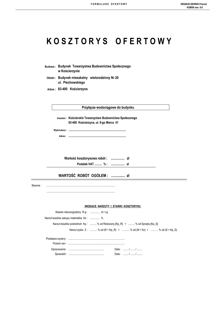 FORMULARZ OFERTOWY KOSZTORYS OFERTOWY Budowa : Budynek Towarzystwa Budownictwa Społecznego w Kościerzynie Obiekt : Budynek mieszkalny wielorodzinny Nr 20 ul. Piechowskiego Adres : 83-400 Kościerzyna Przyłącze wodociągowe do budynku Inwestor : Kościerskie Towarzystwo Budownictwa Społecznego 83-400 Kościerzyna, ul. 8-go Marca 41 Wykonawca : ............................................................................. Adres : ............................................................................. Wartość kosztorysowa robót : ................ zł Podatek VAT .......... % : .................. zł WARTOŚĆ ROBÓT OGÓŁEM : ............... zł Słownie : ........................................................................................................ ........................................................................................................ WIODĄCE NARZUTY I STAWKI KOSZTORYSU Stawka roboczogodziny R-g : ............... zł / r-g Narzut kosztów zakupu materiałów Kz : ............... % Narzut kosztów pośrednich Kp : .......... % od Robocizny [Kp_R] + .......... % od Sprzętu [Kp_S] Narzut zysku Z : ........... % od (R + Kp_R) + ........... % od (M + Kz) + ........... % od (S + Kp_S) Podstawa wyceny : ..................................................................................... Poziom cen : ..................................................................................... Opracowanie : ...................................................... Data : ........ / ....... / ........ Sprawdził : ...................................................... Data : ........ / ....... / ........ ORGBUD-SERWIS Poznań KOBRA wer. 9.0 FORMULARZ OFERTOWY ORGBUD-SERWIS Poznań KOBRA wer. 9.0 Przyłącze wodociągowe do budynku Budowa : Budynek Towarzystwa Budownictwa Społecznego w Kościerzynie Obiekt : Budynek mieszkalny wielorodzinny Nr 20 ul. Piechowskiego Adres : 83-400 Kościerzyna WIODĄCE NARZUTY I STAWKI KOSZTORYSU Stawka roboczogodziny R-g : ............... zł / r-g Narzut kosztów zakupu materiałów Kz : ............... % Narzut kosztów pośrednich Kp : ............... % od Robocizny [Kp_R] + ............... % od Sprzętu [Kp_S] Narzut zysku Z : ............... % od (R + Kp_R) + ............... % od (M+ Kz) + ............... % od (S + Kp_S) Poziom cen : ....................................................................... TABELA ELEMENTÓW SCALONYCH Lp. Opis pozycji tabeli Str: 1 Wartość [ zł ] A Przyłącze wodociągowe do budynku CPV 45300000-0 A.a Roboty ziemne CPV 45231300-8 .................. A.b Roboty montaŜowe CPV 45231300-8 .................. Razem : Przyłącze wodociągowe do budynku CPV 45300000-0 KOSZTORYSOWA WARTOŚĆ ROBÓT : .................. .................. FORMULARZ OFERTOWY ORGBUD-SERWIS Poznań KOBRA wer. 9.0 Przyłącze wodociągowe do budynku Budowa : Budynek Towarzystwa Budownictwa Społecznego w Kościerzynie Obiekt : Budynek mieszkalny wielorodzinny Nr 20 ul. Piechowskiego Adres : 83-400 Kościerzyna WIODĄCE NARZUTY I STAWKI KOSZTORYSU Stawka roboczogodziny R-g : ............... zł / r-g Narzut kosztów zakupu materiałów Kz : ............... % Narzut kosztów pośrednich Kp : ............... % od Robocizny [Kp_R] + ............... % od Sprzętu [Kp_S] Narzut zysku Z : ............... % od (R + Kp_R) + ............... % od (M+ Kz) + ............... % od (S + Kp_S) Poziom cen : ....................................................................... KOSZTORYS OFERTOWY Lp. Podstawa kalkulacji / Opis pozycji Ilość J.m. Str: 1 Cena jednostkowa Wartość [ zł ] A. Przyłącze wodociągowe do budynku CPV 45300000-0 A.a. Roboty ziemne CPV 45231300-8 1. KNR 201-0217-04-00 IZOiEPB ORGBUD W-wa 513,665 m3 ................ Wykopy oraz przekopy wykonywane na odkład koparkami podsiębiernymi o pojemności łyŜki 0,25 m3, w gruncie kategorii: III ................ 2. KNR 201-0229-02-00 513,665 m3 ................ Przemieszczenie gruntu kat. III uprzednio odspojonego na odległość do 10 m spycharkami gąsienicowymi o mocy: 55 kW (75 KM) ................ A.b. Roboty montaŜowe CPV 45231300-8 3. KNR 218-0109-01-00 20,000 m Rurociągi z rur PE/polietylenu niskociśnieniowego/ łączonych metodą zgrzewania, przy średnicy zewnętrznej rur: 63 mm ................ ................ 4. KNR 218-0109-03-00 IZOiEPB ORGBUD W-wa 113,500 m Rurociągi z rur PE/polietylenu niskociśnieniowego/ łączonych metodą zgrzewania, przy średnicy zewnętrznej rur: 110 mm ................ ................ 5. KNR 218-0909-05-00 1,000 szt ................ Ustawienie i uszczelnienie zasuw Ŝeliwnych klinowych owalnych kielichowych, z obudową i skrzynką uliczną, przy podłączaniu wewnętrznych instalacji do sieci wodociągowych - średnica zasuwy: 100 mm -WCINKA DO ISTNIEJĄCEJ SIECI WODOCIĄGOWEJ ................ 6. KNR 218-0909-05-00 IZOiEPB ORGBUD W-wa 2,000 szt ................ Ustawienie i uszczelnienie zasuw Ŝeliwnych klinowych owalnych kielichowych, z obudową i skrzynką uliczną, przy podłączaniu wewnętrznych instalacji do sieci wodociągowych - średnica zasuwy: 100 mm ................ 7. KNR 218-0112-03-02 1,000 szt Układanie kształtek Ŝeliwnych ciśnieniowych, kołnierzowych, przy średnicy nominalnej: 100 mm trójników ................ ................ 8. KNR 215-0109-01-00 IZOiEPB ORGBUD W-wa 1,000 kpl ................ Dodatek za wykonanie obustronnych podejść do wodomierzy śrubowych, o średnicy nominalnej: 50 mm ................ 9. KNR 215-0112-06-00 2,000 szt Zawory w instalacjach sieci wodociągowych, o średnicy: 50 mm - przelotowe Ŝeliwne ocynkowane ................ ................ 1,000 szt ................ ................ 11. KNR 218-0501-04-00 120,150 m2 PodłoŜa z materiałów sypkich pod kanały i obiekty - grubość podłoŜa: 25 cm ................ ................ 12. KNR 218-0802-01-20 1,000 próba Próba szczelności sieci wodociągowych z rur PE (długość próbnego odcinka rurociągu - 200 m), o ś