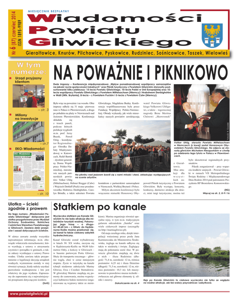W ty m n um e r ze : Urząd przyjazny klientom Miliony na inwestycje Dwie imprezy – Konferencja międzynarodowa „Wpływ ponadnarodowej współpracy samorządów na jakość życia społeczności lokalnych” oraz Piknik turystyczny z Powiatem Gliwickim stanowiły podsumowanie kilku jubileuszy: 15-lecia Powiatu Gliwickiego, 10-lecia Polski w Unii Europejskiej oraz 10lecia współpracy Powiatu Gliwickiego z Powiatem Mittelsachsen (Niemcy) i Hrabstwem Denbighshire w Walii (Wlk. Brytania), 8-lecia – z Powiatem Puckim i 5-lecia z Powiatem Calw (Niemcy). – str. 3 – str.7 EKO-Wiadomości – str. 10 Ulotka – ścieki zgodnie z prawem Do tego numeru „Wiadomości Powiatu Gliwickiego” dołączona jest ulotka przygotowana przez Wydział Ochrony Środowiska, Rolnictwa i Leśnictwa Starostwa Powiatowego w Gliwicach. Zawiera zbiór przepisów i zasad dotyczących ścieków. W ulotce zawarte zostały wszystkie najważniejsze informacje, m.in. obowiązki właściciela nieruchomości, które wynikają z ustawy o utrzymaniu czystości i porządku w gminach, a także zakazy wynikające z ustawy Prawo wodne. Ulotka zawiera także przypomnienie o legalizacji decyzją urządzeń wodnych, wymienione zostały w niej również sytuacje, kiedy należy uzyskać pozwolenie wodnoprawne i kto jest właściwy do jego wydania. Zapraszamy do zapoznania się z najważniejszymi przepisami dotyczącymi ścieków. (SoG) www.powiatgliwicki.pl wa tel Po wia tu Gli wic Gliwickiego, Magdalena Budny. KonfeByło więc na poważnie i na wesoło. Obie kiego Volkerowi Uhligorencja współfinansowana była przez imprezy odbyły się 31 maja –pierwsza wi, a także – tegorocznej Fundację Współpracy Polsko-Niemiecrano w Pałacu w Pławniowicach, a druga na gro dy Be ne Me ri tus kiej. Obrady wykazały, jak wiele mieszpo południu na plaży w Niewieszach nad Chó ro wi „Skow ro nek” kańcy naszych powiatów zawdzięczają Jeziorem Pławniowickim. Konferencja składała się z trzech paneli, podczas których prelekcje wygłosili m.in. prof. Jerzy Buzek, Paweł Ożóg – koordynaVolker Uhlig, starosta Powiatu Mittelsachsen tor Re gio nal ne w Niemczech (z lewej) został Honorowym Obygo Ośrodka Dewatelem Powiatu Gliwickiego. Na zdjęciu ze stabaty Międzynarorostą gliwickim Michałem Nieszporkiem w chwilę dowej w Katowipo odebraniu tego tytułu w Pałacu w Pławniowicach. cach, Rafał Bartek było skosztować regionalnych przy– dyrektor generalsmaków. z Gie rał ny Domu WspółPiknik zorganizował – przy wspartowic. pracy Polsko-Nieciu środków unijnych – Powiat GliwicMoc atramieckiej, starostoki w ramach VII Metropolitalnego kcji dla wie naszych partNa pikniku nad jeziorem bawili się z nami młodsi i starsi, oklaskując występujących Święta Rodziny i Międzynarodowego wszystnerskich powia- na scenie artystów. Dnia Rodzin 2014 pod patronatem Prekich zatów: Volker Uhlig zydenta RP Bronisława Komorowskiepewnił Piknik turystyczny z Powiatem kontaktom z partnerskimi samorządami (Mittelsachsen), Helmut Riegger (Calw) go. Gliwickim. Były występy, koncerty, w Niemczech, Wielkiej Brytanii i Polsce. i Wojciech Dettlaff (Puck) oraz przedstakonkursy, darmowe atrakcje dla dzieMiłym akcentem konferencji było wicielka Hrabstwa Denbighshire, Caro(RG) ci, mini targi turystyczne, można też wręczenie statuetki Honorowy Oby lyn Brindle, a także sekretarz Powiatu Więcej na str. 2, 8-9 i 16 Foto(2): R. Gozdek NA POWAŻNIE I PIKNIKOWO Gierałtowice, Knurów, Pilchowice, Pyskowice, Rudziniec, Sośnicowice, Toszek, Wielowieś Statkiem po kanale Wycieczka statkiem po Kanale Gliwickim to nie lada atrakcja dla miłośników turystyki wodnej. Pokonując jego trasę – o długości 40,60 km – z Gliwic do Kędzierzyna-Koźla można przekonać się, że kanał to także ciekawy zabytek hydrotechniczny. Kanał Gliwicki został wybudowany w latach 30. XX wieku, zaczyna się w Kędzierzynie-Koźlu na 98,00 kilometrze Odry, a kończy w Gliwicach – w basenie portowym Portu Gliwice. Służy do transportu rzecznego – głównie węgla, choć w coraz mniejszym stopniu. Życie w turystykę na kanale tchnęli niedawno założyciele Mariny Gliwice, Ewa i Czesław Sternalowie. W gliwickiej Marinie znajdują się pomosty do cumowania, można wypożyczyć kabinowe łodzie motorowe (organizowane są wyprawy także ze sterni- kiem). Marina organizuje również specjalne rejsy, w tym m.in. tradycyjnym galarem odrzańskim „Samba” oraz wiele ciekawych imprez (szczegóły na http://marinagliwice.pl). Od maja zeszłego roku, dzięki interpelacji wniesionej przez posła Jana Kaźmierczaka do Ministerstwa Środowiska, żegluga na kanale odbywa się także w niedzielę i święta. Żeglujący mają do pokonania sześć śluz. W powiecie gliwickim znajdują się dwie z nich – śluza Rudziniec (długość: 71,4 m, szerokość: 12 m, różnica poziomów: 6,25 m) i śluza Dzierżno (długość: 71,5 m, szerokość: 12 m, różnica poziomów: 10,3 m). Ich maszynownie to prawdziwe muzea techniki – zwłaszcza zaś główne elementy tj. silniki i zasuwy. Dokończenie na str. 4 Foto: R. Gozdek ISSN 1895-9989 Nr 6 (87) czerwiec 2014 Wiadomości Powiatu Gliwickiego MIESIĘCZNIK BEZPŁATNY Rejs po Kanale Gliwickim to ciekawa wycieczka nie tylko ze względu na wodne atrakcje, ale też walory przyrodnicze i zabytkowe. WIEŚCI Z SESJI Dobre partnerstwo NR 6 (87) CZERWIEC 2014 29 maja odbyła się 45. sesja Rady Powiatu Gliwickiego. Kolejna zaplanowana jest na 25 czerwca. Foto: S. Guzik Powiatowe szkoły i PPP w Pyskowicach Majowe posiedzenie Komisji Edukacji Rady Powiatu Gliwickiego – podobnie jak kwietniowe – miało charakter wyjazdowy. W kwietniu radni odwiedzili powiatowe placówki oświatowe w Knurowie, w maju zaś – w Pyskowicach. Posiedzenie rozpoczęło się w Zespole Szkół Specjalnych w Pyskowicach. Jego pracę przybliżyła radnym – oraz towarzyszącym im Sławomirowi Adamczykowi z Zarządu Powiatu Gliwickiego i Anetcie 