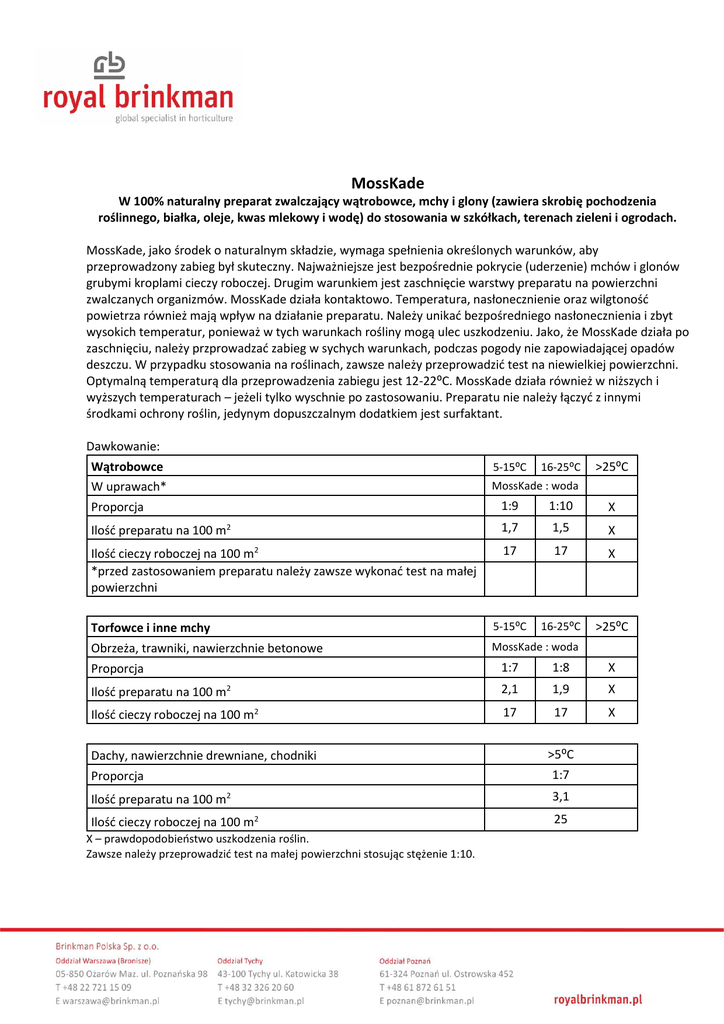 MossKade W 100% naturalny preparat zwalczający wątrobowce, mchy i glony (zawiera skrobię pochodzenia roślinnego, białka, oleje, kwas mlekowy i wodę) do stosowania w szkółkach, terenach zieleni i ogrodach. MossKade, jako środek o naturalnym składzie, wymaga spełnienia określonych warunków, aby przeprowadzony zabieg był skuteczny. Najważniejsze jest bezpośrednie pokrycie (uderzenie) mchów i glonów grubymi kroplami cieczy roboczej. Drugim warunkiem jest zaschnięcie warstwy preparatu na powierzchni zwalczanych organizmów. MossKade działa kontaktowo. Temperatura, nasłonecznienie oraz wilgtoność powietrza również mają wpływ na działanie preparatu. Należy unikać bezpośredniego nasłonecznienia i zbyt wysokich temperatur, ponieważ w tych warunkach rośliny mogą ulec uszkodzeniu. Jako, że MossKade działa po zaschnięciu, należy przprowadzać zabieg w sychych warunkach, podczas pogody nie zapowiadającej opadów deszczu. W przypadku stosowania na roślinach, zawsze należy przeprowadzić test na niewielkiej powierzchni. Optymalną temperaturą dla przeprowadzenia zabiegu jest 12-22⁰C. MossKade działa również w niższych i wyższych temperaturach – jeżeli tylko wyschnie po zastosowaniu. Preparatu nie należy łączyć z innymi środkami ochrony roślin, jedynym dopuszczalnym dodatkiem jest surfaktant. Dawkowanie: Wątrobowce 5-15⁰C W uprawach* MossKade : woda 16-25⁰C >25⁰C 1:9 1:10 X 1,7 1,5 X 17 17 X Torfowce i inne mchy 5-15⁰C 16-25⁰C >25⁰C Obrzeża, trawniki, nawierzchnie betonowe MossKade : woda Proporcja Ilość preparatu na 100 m 2 Ilość cieczy roboczej na 100 m2 *przed zastosowaniem preparatu należy zawsze wykonać test na małej powierzchni Proporcja 1:7 1:8 X Ilość preparatu na 100 m2 2,1 1,9 X Ilość cieczy roboczej na 100 m2 17 17 X Dachy, nawierzchnie drewniane, chodniki >5⁰C Proporcja 1:7 Ilość preparatu na 100 m2 3,1 Ilość cieczy roboczej na 100 m2 25 X – prawdopodobieństwo uszkodzenia roślin. Zawsze należy przeprowadzić test na małej powierzchni stosując stężenie 1:10. Używając MossKade podczas silnego nasłonecznienia lub w zbyt wysokich temperaturach, istnieje ryzyko uszkodzenia liści. W przypadku zwalczania mchów zaleca się dodatek surfaktantu do cieczy roboczej. W przypadku zwalczania wątrobowców dodatek sufaktantu nie jest zalecany. Do sporządzania roztworu należy używać czystej wody wodociągowej lub deszczowej. Najlepszą porą na wykonanie zabiegu jest wczesny poranek, kiedy występuje rosa. Należy upewnić się, że mchy zostały dokładnie pokryte cieczą roboczą. Nie należy mieszać preparatu z innymi środkami ochrony roślin, za wyjątkiem surfaktantów. Większa skuteczność jest widoczna przy stosowaniu po zauważeniu pierwszych wątrobowców/mchów (lepszy stopień pokrycia). W momencie pojawienia się następnych wątrobowców, zabieg należy wykonać ponownie. MossKade musi wyschnąć, aby efekt działania był widoczny. MossKade ma skład organiczny. Po wykonaniu zabiegu należy dokładnie wyczyścić opryskiwacz i dysze, aby uniknąć ich zatkania przez wyschnięty preparat. MossKade należy przechowywać w suchym, chłodnym miejscu (1-15⁰C) bez dostępu promieni słonecznych. Po otwarciu ma ograniczony termin przydatności do użytku. UWAGA: Najlepiej stosować dysze typu Teejet 8005 lub równoważne, dające grubą kroplę. Nie należy zamgławiać preparatem ani aplikować za pomocą konewki. Producent i dystrybutor nie ponoszą odpowiedzialności za wszelkie szkody powstałe w wyniku niewłaściwego zastosowania MossKade.
