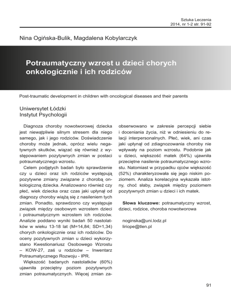 Sztuka Leczenia 2014, nr 1-2 str. 91-92 Nina Ogińska-Bulik, Magdalena Kobylarczyk Potraumatyczny wzrost u dzieci chorych onkologicznie i ich rodziców Post-traumatic development in children with oncological diseases and their parents Uniwersytet Łódzki Instytut Psychologii Diagnoza choroby nowotworowej dziecka jest niewątpliwie silnym stresem dla niego samego, jak i jego rodziców. Doświadczenie choroby może jednak, oprócz wielu negatywnych skutków, wiązać się również z występowaniem pozytywnych zmian w postaci potraumatycznego wzrostu. Celem podjętych badań było sprawdzenie czy u dzieci oraz ich rodziców występują pozytywne zmiany związane z chorobą onkologiczną dziecka. Analizowano również czy płeć, wiek dziecka oraz czas jaki upłynął od diagnozy choroby wiążą się z nasileniem tych zmian. Ponadto, sprawdzono czy występuje związek między osobowym wzrostem dzieci i potraumatycznym wzrostem ich rodziców. Analizie poddano wyniki badań 50 nastolatków w wieku 13-18 lat (M=14,84; SD=1,34) chorych onkologicznie oraz ich rodziców. Do oceny pozytywnych zmian u dzieci wykorzystano Kwestionariusz Osobowego Wzrostu – KOW-27, zaś u rodziców – Inwentarz Potraumatycznego Rozwoju - IPR. Większość badanych nastolatków (60%) ujawniła przeciętny poziom pozytywnych zmian potraumatycznych. Więcej zmian za- obserwowano w zakresie percepcji siebie i doceniania życia, niż w odniesieniu do relacji interpersonalnych. Płeć, wiek, ani czas jaki upłynął od zdiagnozowania choroby nie wpływały na poziom wzrostu. Podobnie jak u dzieci, większość matek (64%) ujawniła przeciętne nasilenie potraumatycznego wzrostu. Natomiast w przypadku ojców większość (52%) charakteryzowała się jego niskim poziomem. Analiza korelacyjna wykazała istotny, choć słaby, związek między poziomem pozytywnych zmian u dzieci i ich matek. Słowa kluczowe: potraumatyczny wzrost, dzieci, rodzice, choroba nowotworowa [email protected] [email protected] 91
