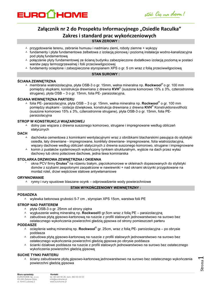 Załącznik nr 2 do Prospektu Informacyjnego „Osiedle Raculka” Zakres i standard prac wykończeniowych STAN ZEROWY : przygotowanie terenu, zebranie humusu i nadmiaru ziemi, roboty ziemne + wykopy fundamenty i płyta fundamentowa żelbetowa z izolacją pionową i poziomą instalacja wodno-kanalizacyjna pod płytą fundamentową połączenie płyty fundamentowej ze ścianą budynku zabezpieczone dodatkowo izolacją poziomą w postaci warstw papy termozgrzewalnej i folii przeciwwilgociowej fundamenty ocieplone i zabezpieczone styropianem XPS o gr. 5 cm wraz z folią przeciwwilgociową STAN SUROWY : ŚCIANA ZEWNĘTRZNA ® membrana wiatroizolacyjna, płyta OSB-3 o gr. 15mm, wełna mineralna np. Rockwool o gr. 100 mm ® pomiędzy słupkami, konstrukcja drewniana z drewna KVH (suszone komorowo 15% ± 3%, czterostronnie strugane), płyta OSB – 3 o gr. 15mm, folia PE- paraizolacyjna, ŚCIANA WEWNĘTRZNA PARTERU ® folia PE- paraizolacyjna, płyta OSB – 3 o gr. 15mm, wełna mineralna np. Rockwool o gr. 100 mm ® pomiędzy słupkami - izolacja dźwiękowa, konstrukcja drewniana z drewna KVH Konstruktionsvollholz (suszone komorowo 15% ± 3%, czterostronnie strugane), płyta OSB-3 o gr. 15mm, folia PEparaizolacyjna STROP W KONSTRUKCJI WIĄZAROWEJ dolny pas wiązara z drewna suszonego komorowo, strugane i impregnowane według obliczeń statycznych DACH dachówka cementowa z kominkami wentylacyjnymi wraz z obróbkami blacharskimi pasująca do stylistyki osiedla, łaty drewniane - impregnowane, kontrłaty drewniane- impregnowane, folia wiatroizolacyjna, więzary dachowe według obliczeń statycznych z drewna suszonego komorowo, strugane i impregnowane komin z pustaków systemowych wykończony tynkiem strukturalnym, wyjście na dach przez wyłaz dachowy lub okno połaciowe dachowe, jedna ława kominiarska STOLARKA DRZWIOWA ZEWNĘTRZNA I OKIENNA ® okna PCV firmy Drutex na rdzeniu białym, pięciokomorowe w okleinach dopasowanych do stylistyki domów z szybami zespolonymi zaopatrzone w nawiewniki + nad oknami skrzynki przygotowane na montaż rolet, drzwi wejściowe stalowe antywłamaniowe ORYNNOWANIE rynny i rury spustowe blaszane ocynk – odprowadzenie wody powierzchniowe STAN WYKOŃCZENIOWY WEWNĘTRZNY : POSADZKA wylewka betonowa grubości 5-7 cm , styropian XPS 15cm, warstwa folii PE Biuro sprzedaży EUROHOME Sp. z o.o. 65-245 Zielona Góra, ul. Armii Ludowej 2 Kontakt tel. 68 320 90 26, kom. 883 03 03 03 [email protected] www.eurohome.pl Strona SUCHE TYNKI PARTERU ściany zabudowane płytą gipsowo-kartonową jednowarstwowo na surowo bez ostatecznego wykończenia powierzchni gładzią gipsowa 1 STROP NAD PARTEREM płyta OSB-3 o gr. 25mm od strony piętra wygłuszenie wełną mineralną np. Rockwool® gr.5cm wraz z folią PE – paraizolacyjną zabudowa płytą gipsowo-kartonową na ruszcie z profili stalowych jednowarstwowo na surowo bez ostatecznego wykończenia powierzchni gładzią gipsowa od strony pomieszczeń parteru PODDASZE ® ocieplenie wełną mineralną np. Rockwool gr. 25cm, wraz z folią PE- paroizolacyjna – po obrysie poddasza zabudowa płytą gipsowo-kartonową na ruszcie z profili stalowych jednowarstwowo na surowo bez ostatecznego wykończenia powierzchni gładzią gipsowa po obrysie poddasza ścianki działowe poddasza na ruszcie z profili stalowych jednowarstwowo na surowo bez ostatecznego wykończenia powierzchni gładzią gipsową INSTALACJA WEWNĘTRZNA - INSTALACJA SANITARNA instalacja tworzywowa ciepłej i zimnej wody doprowadzona do pomieszczenia bez rozprowadzenia pod przybory z licznikiem na przyłączeniu do budynku doprowadzenie kanalizacji sanitarnej PCV do pomieszczeń sanitarnych i kuchni bez rozprowadzenia pod przybory wentylacja grawitacyjna w pomieszczeniach wymaganych warunkami technicznymi - INSTALACJA GRZEWCZA ogrzewanie gazowe, kocioł dwufunkcyjny do 21KW z zamknięta komorą spalania, przewód powietrznospalinowy wyprowadzony przez ścianę zewnętrzną, sterowanie za pomocą regulatora pokojowego do ogrzewania pomieszczeń na parterze i piętrze zamontowane są stalowe grzejniki płytowe z zaworami i głowicami termostatecznymi , liczbę i wielkość określa się na podstawie zapotrzebowania na ciepło - INSTALACJA ELEKTRYCZNA (bez osprzętu) instalacja oświetleniowa instalacja gniazd wtykowych instalacja wyrównawcza instalacja TV instalacja internetowa bez instalacji odgromowej budynku STAN WYKOŃCZENIOWY ZEWNĘTRZNY : INSTALACJA ZEWNĘTRZNA przyłącze wodno-kanalizacyjne, elektryczne oraz gazowe OCIEPLENIE ZEWNĘTRZNE BUDYNKU system elewacji zewnętrznej tynk strukturalny siloksanowy, barwiony w masie na styropianie 12cm, cokół 5cm, bez opaski wokół budynku do indywidualnego wykończenia parapety zewnętrzne z blachy stalowej malowane proszkowo fragmenty okapu i ścianki kolankowej z podbitki drewnianej malowanej ZAGOSPODAROWANIE TERENU : wejście do budynku i taras płyta betonowa surowa zatarta na ostro do indywidualnego wykończenia podjazdy i ścieżki z kostki betonowej na podbudowie piaskowej wspólna droga wewnętrzna jako ciąg pieszo-jezdny z kostki betonowej na podbudowie gruzu betonowego stanowisko na śmietnik zewnętrzny ogrodzenie poszczególnych działek bez furtek z siatki ślimakowej na słupkach okrągłych powlekanych teren działki uprzątnięty z pozostałości budowlanych i ukształtowany jest wstępnie w ramach gruntu rodzimego ( bez dowozu ziemi roślinnej) – do ostatecznego wykończenia przez nabywcę z dopuszczeniem możliwej budowy schodów, murków oporowych z ukształtowaniem indywidualnym skarp i powierzchni z zastrzeżeniem, że wody opadowe z danej działki muszą być zagospodarowane w ramach jej powierzchni i nie mogą powodować zalewania sąsiednich działek Materiały, osprzęt, wyposażenie, itp., których producenta wskazano w opisie mogą być zastąpione materiałami, osprzętem, wyposażeniem, itp. o analogicznej klasie, ale innego producenta. * Opcja Rolety elektryczne - cena 3.500zł netto - w w