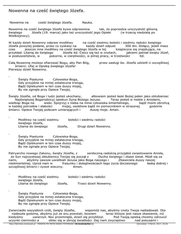 Nowenna na cześć świętego Józefa. Nowenna na cześć świętego Józefa. Nauka. Nowenna na cześć świętego Józefa bywa odprawiona tak, że poprzedza uroczystość główną świętego Józefa (19. marca) jako też uroczystość jego Opieki (w trzecią niedzielę po Wielkiejnocy). W każdy dzień Nowenny odpraw modlitwy na cześć siedmiu boleści i siedmiu radości świętego Józefa powyżej podane, przez co zyskasz na każdy dzień odpust 300 dni. Dołącz, jeżeli masz czas jeszcze inne modlitwy na cześć świętego Józefa w tej książeczce się znajdujące, na przykład. Litanię do świętego Józefa itd. Ćwicz się też w cnotach, jakiemi jaśniał święty Józef, w posłuszeństwie, w pokorne, w cierpliwości, w pilnej pracy, w trzeźwości itd. Całą Nowennę możesz ofiarować Bogu, aby Pan Bóg, śmierci. Ufaj w Opiekę świętego Józefa! Pierwszy dzień Nowenny. . przez zasługi św. Józefa udzielił ci szczęśliwej Święty Piastunie Człowieka-Boga, Gdy przyjdzie na mniej ostateczna trwoga, Bądź Opiekunem w ten czas duszy mojej, By nie zginęła przy Opiece Twojej. Święty Józefie, od Boga i ludzi jesteś ukochany, albowiem jesteś łaski Bożej pełen jako oblubieniec Najświętszej Bogarodzicyj opiekun Syna Bożego Jezusa. Teraz jesteś w niebie z Aniołami, wielbiąc Boga na wieki. Spojrzyj z nieba na mnie człowieka śmiertelnego, bądź moim obrońcą w każdej potrzebie i słabości mojej, osobliwie bądź mi pomocnikiem w strasznej godzinie śmierci. Opiece Twojej polecam umierających i duszę moje. Amen. . . Modlitwy na cześć siedmiu boleści i siedmiu radości świętego Józefa, Litania do świętego Józefa, Drugi dzień Nowenny. Święty Piastunie Człowieka-Boga, Gdy przyjdzie na mniej ostateczna trwoga, Bądź Opiekunem w ten czas duszy mojej, By nie zginęła przy Opiece Twojej. Patryarcho nowego Zakonu, święty Józefie, z serdeczną radością przyjęłeś zwiastowanie Anioła, że Syn najczystszej oblubienicy Twojej się począł z Ducha świętego i zbawi świat. Módl się za nami, abyśmy zawsze uwielbiali Jezusa jako Boga naszego i Zbawiciela duszy naszej nieśmiertelnej. Uproś nam w frasunku i dolegliwościach tego życia doczesnego łaskę dobrej i szczęśliwej śmierci i żywot wieczny. Amen. . . Modlitwy na cześć siedmiu boleści i siedmiu radości świętego Józefa, Litania do świętego Józefa, Trzeci dzień Nowenny. Święty Piastunie Człowieka-Boga, Gdy przyjdzie na mniej ostateczna trwoga, Bądź Opiekunem w ten czas duszy mojej, By nie zginęła przy Opiece Twojej. Zwierciadło wszystkich cnót, święty Józefie, wspomóż nas, abyśmy cnoty Twoje naśladowali. Oto nadeszła godzina, abyśmy już ze snu powstali, bowiem teraz bliższe jest nasze zbawienie, niż kiedyśmy uwierzyli. Noc przeminęła, dzień się przybliżył. Pod Twoją opieką chcemy odrzucić uczynki ciemności a oblec się w zbroję światłości. Daj nam zwycięstwo nad pokusami i http://fatimska.wloclawek.pl - PARAFIA PW MATKI BOŻEJ FATIMSKIEJ WE Powered WŁOCŁAWKU by Mambo Generated: 3 March, 2017, 18:26 szatanem w życiu i w godzinie śmierci. . . Amen. Modlitwy na cześć siedmiu boleści i siedmiu radości świętego Józefa, Litania do świętego Józefa, Czwarty dzień Nowenny. Święty Piastunie Człowieka-Boga, Gdy przyjdzie na mniej ostateczna trwoga, Bądź Opiekunem w ten czas duszy mojej, By nie zginęła przy Opiece Twojej. Święty Józefie, Tyś zawsze wypełniał Zakon Pański. Przykazania Boskie były drogą, którą chodziłeś przez wszystkie dni życia Twojego. Dopomóż nam, abyśmy także zachowali przykazania Boskie i kościelne. Pod Twoją opieką niechaj uczciwie chodzimy: nie w biesiadach i w pijaństwach, nie w łożach i niewstydliwościach, nie w swarach i zazdrości, lecz niechaj się obleczemy, jak nas Apostoł upomina, w Pana Jezusa Chrystusa. Proś za nas, abyśmy najprzód szukali Królestwa Bożego i sprawiedliwości Jego i tak szczęśliwie dokonali życia naszego. Amen. . . Modlitwy na cześć siedmiu boleści i siedmiu radości świętego Józefa, Litania do świętego Józefa, Piąty dzień Nowenny. Święty Piastunie Człowieka-Boga, Gdy przyjdzie na mniej ostateczna trwoga, Bądź Opiekunem w ten czas duszy mojej, By nie zginęła przy Opiece Twojej. Święty Józefie, Pan Bóg Ci objawił tajemnice Wcielenia Syna Bożego i zaprowadził Cię do Betlejem, gdzieś pokłon poddał nowonarodzonemu Zbawicielowi. Tyś zasłużył, widzieć oblicze Jezusa Chrystusa i piastować go. Uproś nam, kochany nasz Patronie, to szczęście, abyśmy na twarz Boga mogli patrzeć w niebie. A dopóki tu jesteśmy na tym padole płaczu, nie opuszczaj nas, osobliwie nie opuszczaj nas w godzinie śmierci. Amen. . . Modlitwy na cześć siedmiu boleści i siedmiu radości świętego Józefa, Litania do świętego Józefa, Szósty dzień Nowenny. Święty Piastunie Człowieka-Boga, Gdy przyjdzie na mniej ostateczna trwoga, Bądź Opiekunem w ten czas duszy mojej, By nie zginęła przy Opiece Twojej. Błogosławiony Józefie, którego przedwieczny Syn Boży obrał jako ojca i żywiciela swego! Pan Bóg Cię uczynił zacnym przed oczyma królów i dał Ci rozkazanie przed ludem swoim: albowiem który jest Król nad królami i pan nad panami uniżył się i stał się Tobie poddanym i posłusznym. Módl się za nami święty Józefie, abyśmy byli cichego i pokornego serca, posłuszni i poddani Bogu i kościołowi. Niechajże pod opieką Twoją wszystkie boleści i utrapienia nasze staną się słodkiemi i niechaj śmierć, której się tak bardzo lękamy, stanie się nam bramą do nieba. Amen. . Modlitwy na cześć siedmiu boleści i siedmiu radości świętego Józefa, Litania do świętego Józefa, Siódmy dzień Nowenny. http://fatimska.wloclawek.pl - PARAFIA PW MATKI BOŻEJ FATIMSKIEJ WE Powered WŁOCŁAWKU by Mambo Generated: 3 March, 2017, 18:26 . Święty Piastunie Człowieka-Boga, Gdy przyjdzie na mniej ostateczna tr