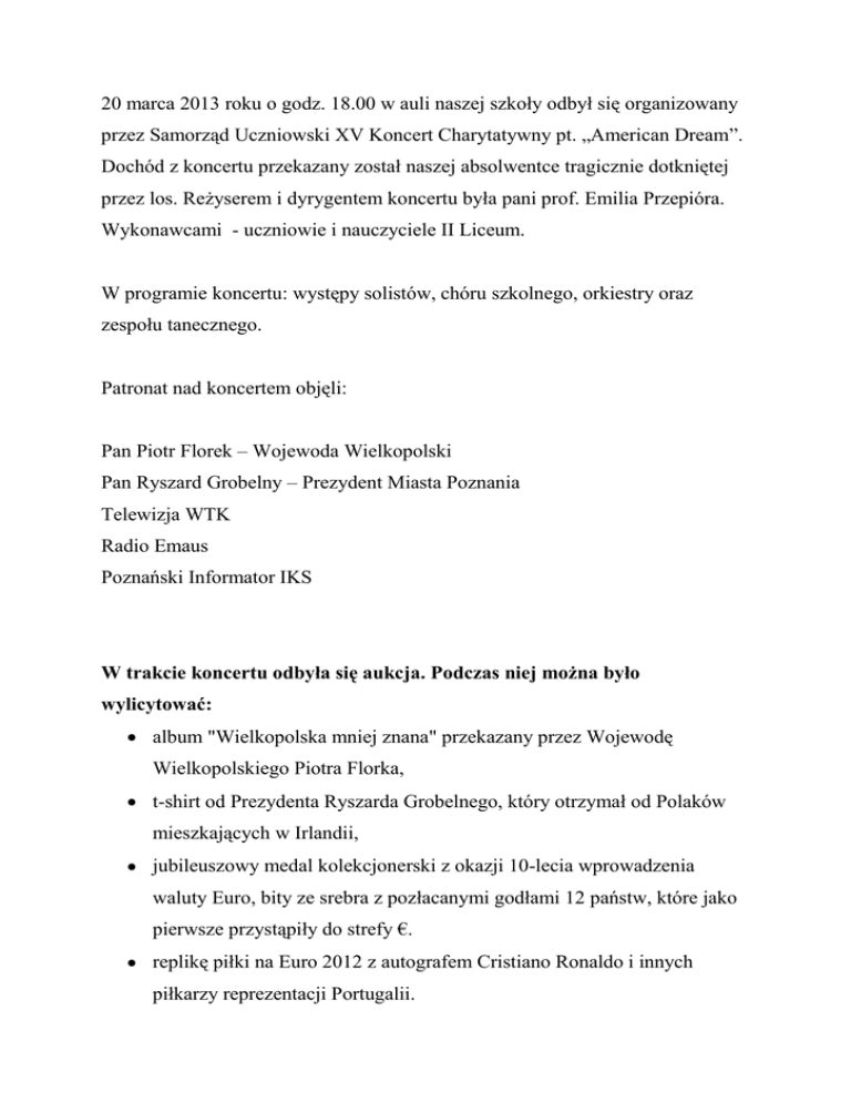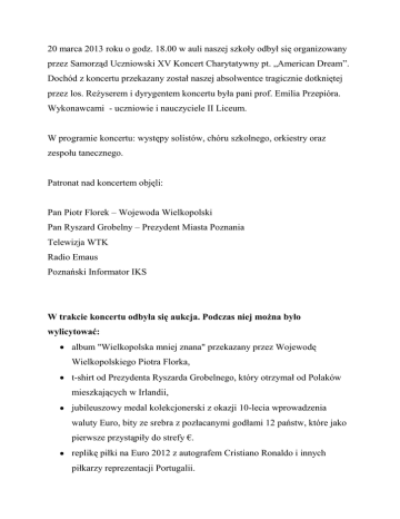 20 marca 2013 roku o godz. 18.00 w auli naszej szkoły odbył się organizowany przez Samorząd Uczniowski XV Koncert Charytatywny pt. „American Dream”. Dochód z koncertu przekazany został naszej absolwentce tragicznie dotkniętej przez los. Reżyserem i dyrygentem koncertu była pani prof. Emilia Przepióra. Wykonawcami - uczniowie i nauczyciele II Liceum. W programie koncertu: występy solistów, chóru szkolnego, orkiestry oraz zespołu tanecznego. Patronat nad koncertem objęli: Pan Piotr Florek – Wojewoda Wielkopolski Pan Ryszard Grobelny – Prezydent Miasta Poznania Telewizja WTK Radio Emaus Poznański Informator IKS W trakcie koncertu odbyła się aukcja. Podczas niej można było wylicytować: album "Wielkopolska mniej znana" przekazany przez Wojewodę Wielkopolskiego Piotra Florka, t-shirt od Prezydenta Ryszarda Grobelnego, który otrzymał od Polaków mieszkających w Irlandii, jubileuszowy medal kolekcjonerski z okazji 10-lecia wprowadzenia waluty Euro, bity ze srebra z pozłacanymi godłami 12 państw, które jako pierwsze przystąpiły do strefy €. replikę piłki na Euro 2012 z autografem Cristiano Ronaldo i innych piłkarzy reprezentacji Portugalii. obrazy, grafiki i świecznik wykonany przez uczniów i absolwentów II LO. W trakcie XV Koncertu Charytatywnego udało się zebrać 9 810 zł, z czego 5 633 zł z samych licytacji. Więcej informacji na temat koncertu na stronie dzielnicy Łazarz: http://www.lazarz.pl/?id=2&nr=5022