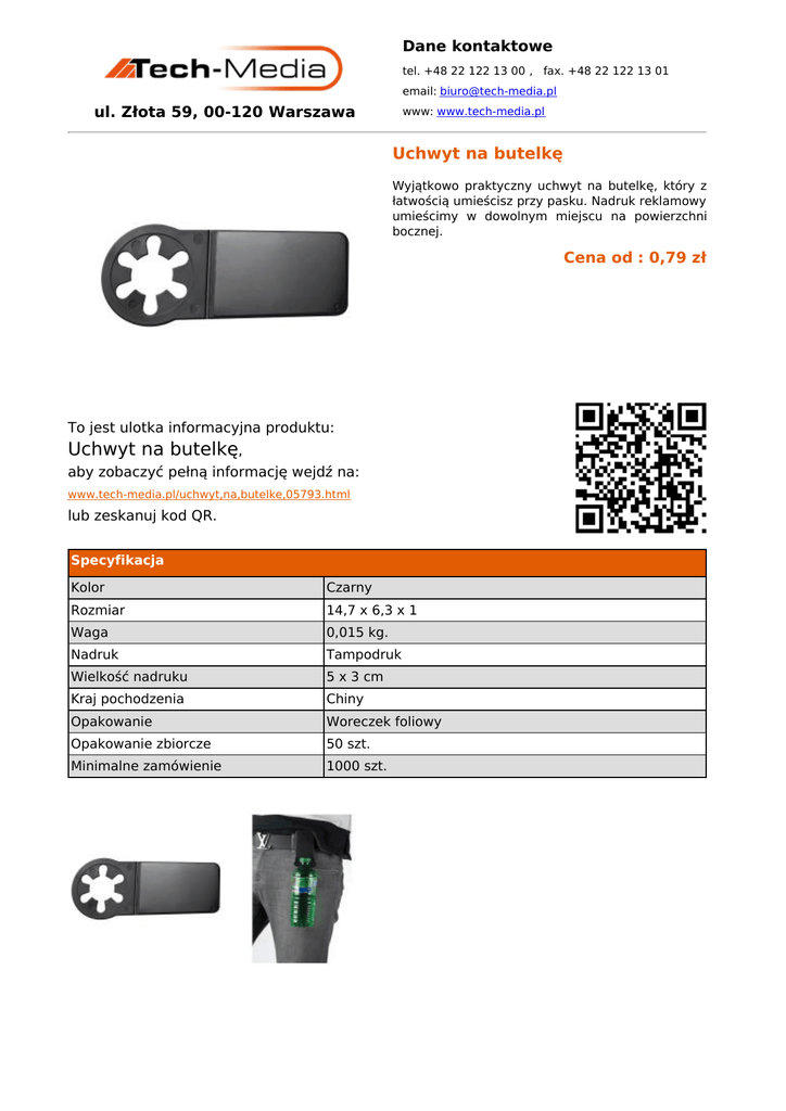 Dane kontaktowe tel. +48 22 122 13 00 , fax. +48 22 122 13 01 email: [email protected] ul. Złota 59, 00-120 Warszawa www: www.tech-media.pl Uchwyt na butelkę Wyjątkowo praktyczny uchwyt na butelkę, który z łatwością umieścisz przy pasku. Nadruk reklamowy umieścimy w dowolnym miejscu na powierzchni bocznej. Cena od : 0,79 zł To jest ulotka informacyjna produktu: Uchwyt na butelkę, aby zobaczyć pełną informację wejdź na: www.tech-media.pl/uchwyt,na,butelke,05793.html lub zeskanuj kod QR. Specyfikacja Kolor Czarny Rozmiar 14,7 x 6,3 x 1 Waga 0,015 kg. Nadruk Tampodruk Wielkość nadruku 5 x 3 cm Kraj pochodzenia Chiny Opakowanie Woreczek foliowy Opakowanie zbiorcze 50 szt. Minimalne zamówienie 1000 szt.