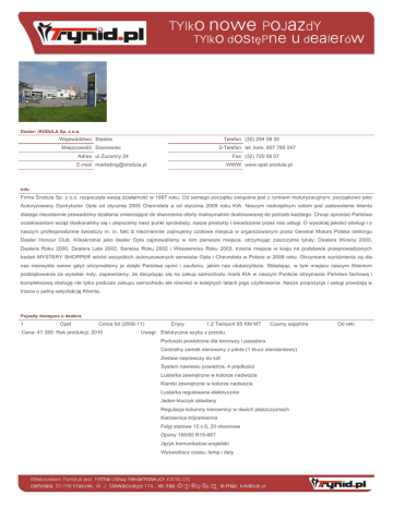 Dealer: ¦RODULA Sp. z o.o. Województwo Slaskie Telefon (32) 294 08 30 Miejscowość Sosnowiec 2-Telefon tel. kom. 607 785 547 Adres ul.Zuzanny 24 Fax (32) 720 58 07 E-mail [email protected] WWW www.opel.srodula.pl Info Firma Środula Sp. z o.o. rozpoczęła swoją działalność w 1997 roku. Od samego początku związana jest z rynkiem motoryzacyjnym, początkowo jako Autoryzowany Dystrybutor Opla od stycznia 2005 Chevroleta a od stycznia 2009 roku KIA. Naszym nadrzędnym celem jest zadowolenie klienta dlatego nieustannie prowadzimy działania zmierzające do stworzenia oferty maksymalnie dostosowanej do potrzeb każdego. Chcąc sprostać Państwa oczekiwaniom wciąż doskonalimy się i ulepszamy nasz punkt sprzedaży, nasze produkty i świadczone przez nas usługi. O wysokiej jakości obsługi i o naszym profesjonalizmie świadczy m. in. fakt iż niezmiennie zajmujemy czołowe miejsca w organizowanym przez General Motors Polska rankingu Dealer Honour Club. Kilkakrotnie jako dealer Opla zajmowaliśmy w nim pierwsze miejsca, otrzymując zaszczytne tytuły: Dealera Wiosny 2000, Dealera Roku 2000, Dealera Lata 2002, Serwisu Roku 2002 i Wiceserwisu Roku 2003. trzecie miejsce w kraju na podstawie przeprowadzonych badań MYSTERY SHOPPER wśród wszystkich autoryzowanych serwisów Opla i Chevroleta w Polsce w 2008 roku. Otrzymane wyróżnienia są dla nas niezwykle cenne gdyż otrzymaliśmy je dzięki Państwa opinii i zaufaniu, jakim nas obdarzyliście. Składając, w tym miejscu naszym Klientom podziękowania za wysokie noty, zapewniamy, że decydując się na zakup samochodu marki KIA w naszym Punkcie otrzymacie Państwo fachową i kompleksową obsługę nie tylko podczas zakupu samochodu ale również w kolejnych latach jego użytkowania. Nasze propozycje i usługi powstają w trosce o pełną satysfakcję Klienta. Pojazdy dostępne u dealera 1 Opel Corsa 5d (2006-11) Cena: 41 350 Rok produkcji: 2010 Enjoy 1.2 Twinport 85 KM MT Czarny sapphire Uwagi: Elektryczne szyby z przodu Poduszki powietrzne dla kierowcy i pasażera Centralny zamek sterowany z pilota (1 klucz standardowy) Zestaw naprawczy do kół System nawiewu powietrza, 4 prędkości Lusterka zewnętrzne w kolorze nadwozia Klamki zewnętrzne w kolorze nadwozia Lusterka regulowane elektrycznie Jeden kluczyk składany Regulacja kolumny kierownicy w dwóch płaszczyznach Kierownica trójramienna Felgi stalowe 15 x 6, 20 otworowe Opony 185/65 R15-88T Język komunikatow-angielski Wyświetlacz czasu, temp i daty Od reki 4 głośniki Konsola centralna w kolorze "Matt Chrome" Regulacja wysokości fotela kierowcy Dzielona tylna kanapa 60/40 Wyposażenie dodatkowe Pakiet Enjoy Plus Dwie lampy przeciwmgielne z przodu RadioCD 30, MP3 Klimatyzacja manualna Pełnowymiarowe koło zapasowe (stalowe) Środkowy zagłówek tylny, pełny, tkanina 2 Opel Corsa 5d (2006-11) Cena: 39 250 Rok produkcji: 2010 Enjoy 1.2 Twinport 85 KM MT Szary technical Uwagi: Poduszki powietrzne dla kierowcy i pasażera Regulacja wysokości fotela kierowcy System nawiewu powietrza, 4 prędkości Lusterka regulowane elektrycznie Zestaw naprawczy do kół ABS, hamulce tarczowe z przodu Kierownica trójramienna Felgi stalowe 14 x 5.5, 18 otworowe Opony 185/70 R 14-88T Regulacja kolumny kierownicy w dwóch płaszczyznach Język komunikatów-angielski Wyświetlacz czasu, temp i daty 4 głośniki Lusterka zewnętrzne w kolorze nadwozia Tapicerka Punch/Elba, czarna Dodatkowe wyposażenie: Pakiet Upgrade Klimatyzacja manualna Radio CD 30 Pełnowymiarowe koło zapasowe (stalowe), Cena cennik: 49 250 zł Od reki Rabat: 10 000 zł Cena promocyjna: 39 250 zł 3 Opel Corsa 5d (2006-11) Cena: 43 050 Rok produkcji: 2010 Enjoy 1.4 Twinport 100 KM MT Czarny sapphire Od reki Uwagi: Elektryczne szyby z przodu Poduszki powietrzne dla kierowcy i pasażera Centralny zamek sterowany z pilota (1 klucz standardowy) Zestaw naprawczy do kół System nawiewu powietrza, 4 predkości Lusterka zewnętrzne w kolorze nadwozia Klamki zewnętrzne w kolorze nadwozia Lusterka regulowane elektrycznie Jeden kluczyk składany Regulacja kolumny kierownicy w dwóch płaszczyznach Kierownica trójramienna Felgi stalowe 15 x 6, 20 otworowe Opony 185/65 R15-88T Język komunikatow-angielski Wyświetlacz czasu, temp i daty 4 głośniki Konsola centralna w kolorze "Matt Chrome" Tapicerka "Cable/Elba", czerwona Regulacja wysokości fotela kierowcy Dzielona tylna kanapa 60/40 Konsola środkowa w kolorze czarnym - "lakier fortepianowy" Wyposażenie dodatkowe Pakiet Enjoy Plus Dwie lampy przeciwmgielne z przodu Radio CD 30, MP3 Klimatyzacja manualna Pełnowymiarowe koło zapasowe (stalowe) Środkowy zaglówek tylny, pełny, tkanina Cena cennikowa: 53 050 zł Rabat: 10 000 zł Cena promocyjna: 43 050 zł 4 Opel Corsa 5d (2006-11) Cena: 39 410 Rok produkcji: 2010 Essentia 1.2 Twinport 70 KM MT Uwagi: Poduszki powietrzne dla kierowcy i pasażera Regulacja wysokości fotela kierowcy System nawiewu powietrza, 4 prędkości Lusterka regulowane elektrycznie Srebrny silverlake Od reki Zestaw naprawczy do kół ABS, hamulce tarczowe z przodu Kierownica trójramienna Felgi stalowe 14 x 5.5, 18 otworowe Opony 185/70 R 14-88T Regulacja kolumny kierownicy w dwóch płaszczyznach Język komunikatów-angielski Wyświetlacz czasu, temp i daty 4 głośniki Lusterka zewnętrzne w kolorze nadwozia Klimatyzacja manualna Radio CD 30 Tapicerka Punch/Elba, czarna Wyposażenie dodatkowe: Pakiet Elektryczny Elektryczne szyby z przodu Centralny zamek sterowany z pilota (1 klucz standardowy) Jeden kluczyk składany Pełnowymiarowe koło zapasowe (stalowe), Cena cennik: 44 910 zł Rabat: 5 500 zł Cena promocyjna: 39 410 zł 5 Cena: 78 900 Opel Astra IV (2009- ) Cosmo 1.4 Turbo Ecotec 140 KM MT Czerwony power Demo Uwagi: CENA 78900,00 PLN, MOŻLIWA ZAMIANA NA INNY POJAZD DO 10 LAT LUB ZAKUP NA RATY