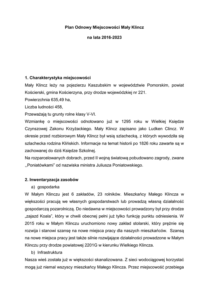 Plan Odnowy Miejscowości Mały Klincz na lata 2016-2023 1. Charakterystyka miejscowości Mały Klincz leży na pojezierzu Kaszubskim w województwie Pomorskim, powiat Kościerski, gmina Kościerzyna, przy drodze wojewódzkiej nr 221. Powierzchnia 635,49 ha, Liczba ludności 458, Przeważają tu grunty rolne klasy V-VI. Wzmiankę o miejscowości odnotowano już w 1295 roku w Wielkiej Księdze Czynszowej Zakonu Krzyżackiego. Mały Klincz zapisano jako Ludken Clincz. W okresie przed rozbiorowym Mały Klincz był wsią szlachecką, z których wywodziła się szlachecka rodzina Klińskich. Informacje na temat historii po 1826 roku zawarte są w zachowanej do dziś Księdze Szkolnej. Na rozparcelowanych dobrach, przed II wojną światową pobudowano zagrody, zwane ,,Poniatówkami” od nazwiska ministra Juliusza Poniatowskiego. 2. Inwentaryzacja zasobów a) gospodarka W Małym Klinczu jest 6 zakładów, 23 rolników. Mieszkańcy Małego Klincza w większości pracują we własnych gospodarstwach lub prowadzą własną działalność gospodarczą pozarolniczą. Do niedawna w miejscowości prowadzony był przy drodze „zajazd Koala”, który w chwili obecnej pełni już tylko funkcję punktu odniesienia. W 2015 roku w Małym Klinczu uruchomiono nowy zakład stolarski, który prężnie się rozwija i stanowi szansę na nowe miejsca pracy dla naszych mieszkańców. Szansą na nowe miejsca pracy jest także silnie rozwijające działalności prowadzone w Małym Klinczu przy drodze powiatowej 2201G w kierunku Wielkiego Klincza. b) Infrastruktura Nasza wieś została już w większości skanalizowana. Z sieci wodociągowej korzystać mogą już niemal wszyscy mieszkańcy Małego Klincza. Przez miejscowość przebiega droga wojewódzka nr 221 (Kościerzyna – Gdańsk) oraz powiatowa nr 2201G. Pomimo dogodnego układu drogowego stan dróg jest fatalny i w wielu miejscach zagraża zdrowiu i życiu naszych mieszkańców (brak równej nawierzchni asfaltowej i brak chodników przy drodze wojewódzkiej i powiatowej. W miejscowości nie ma sieci gazowej ani ciepłowniczej, a wszystkie gospodarstwa domowe ogrzewane są z indywidualnych kotłowni najczęściej zasilanych węglem i drzewem. c) Kultura i społeczeństwo W 2011 roku został oddany do uzytku blok socjalny, w którym zamieszkuje 15 rodzin, będących w trudnej sytuacji materialnej. Nasza wieś się rozbudowuje, powstaje nowe osiedle pod lasem, jest także boisko sportowe, z którego korzysta przede wszystkim klub sportowy Santana. Prężnie działa także Koło Gospodyń Wiejskich, którego przewodniczącą jest Grażyna Kurszewska. W Małym Klinczu nie ma Kościoła, a mieszkańcy są parafianami w części Parafii Świętej Rodziny w Wielkim Klinczu oraz Parafii Świętej Trójcy w Kościerzynie. Mieszkańcy utożsamiają się na co dzień z kulturą i tradycjami kaszubskimi. 3. Analiza mocnych i słabych stron sołectwa Mały Klincz Mocne Strony Położenie geograficzne – bliskość ośrodka powiatowego, jakim jest miasto Kościerzyna, Istniejące tereny przeznaczone pod inwestycje i mieszkalnictwo, Silny kapitał ludzki – spójność wsi, aktywność Koła Gospodyń Wiejskich, Dobra infrastruktura - istniejące sieci kanalizacyjne i wodociągowe, Rozbudowujące się zakłady – stolarskie, transport, Dobre usytuowanie dla budynków mieszkalnych, Dobra komunikacja publiczna, Słabe strony Rozproszenie zabudowy na terenie sołectwa, Słabe uprzemysłowienie, Mało miejsc pracy, Słaba jakość dróg – niski stan bezpieczeństwa na drogach, Brak dowozów dzieci do szkoły, Zbyt mała i nieogrzewana sala wiejska ze słabym wyposażeniem, Brak ciągów rowerowych i chodników przy drodze wojewódzkiej i powiatowej, Brak miejsca na festyny i integrację mieszkańców na terenie sołectwa, Brak zaplecza sanitarnego, socjalnego na boisku, Brak sklepu – usług, 4. Przedsięwzięcia planowane do realizacji w ramach Planu Odnowy Miejscowości w latach 2016-2023 Budowa i wyposażenie nowej sali wiejskiej na miejscu dzisiaj istniejącej na działce przekazanej na ten cel przez panią Krystynę Kubiznę. Przewidywany koszt to około 300 tysięcy złotych. Zadanie może zostać sfinansowane między innymi ze środków pomocowych PROW na lata 2014-2020. Przebudowa drogi powiatowej nr 2201G na odcinku Mały Klincz – Wielki Klincz. Przewidywany koszt to ponad 4.000.000 zł. Zadanie może zostać zrealizowane przez Powiat Kościerski i sfinansowane ze środków pomocowych np. PROW na lata 2014-2020. budowa ścieżki rowerowej do Wielkiego Klincza przy drodze powiatowej nr 2201G Mały Klincz – Nowa Kiszewa. Przewidywane koszt to około 600.000 zł. przebudowa nawierzchni na drodze wojewódzkiej nr 221 z przebudową skrzyżowania w Małym Klinczu z drogą powiatową nr 2201G. Zadanie to jest w planach Zarządu Dróg Wojewódzkich, tj Samorządu Województwa Pomorskiego. budowa ścieżki rowerowej do miasta Kościerzyny przez Nowy Klincz przy drodze wojewódzkiej zapewniającej dojazd i dojście dzieci do szkoły podstawowej w Nowym Klinczu. Zadanie to jest w planach Zarządu Dróg Wojewódzkich, tj Samorządu Województwa Pomorskiego. rozbudowa sieci kanalizacji ściekowej w kierunku do Puca oraz do pozostałych nieruchomości położonych na terenie Sołectwa Mały Klincz. Zadanie to jest projektowane w ramach projektu „Kościerskie Strefy Aktywności Gospodarczej – przygotowanie dokumentacji techniczno-kosztorysowej. Realizacja zadania może zostać wykonana przez Gminę Kościerzyna w ramach środków Norweskiego Mechanizmu Finansowego lub z programów pomocowych Unii Europejskiej. podłączenie wodociągu do zabudowań w kierunku miejscowości Zielenin oraz do innych zamieszkałych zabudowań nie podłączonych obecnie do wodociągu na terenie sołectwa, położenie nawierzchni asfaltowej na drodze w kierunku Puca oraz na „osiedlu” w Małym Klinczu, położenie nawierzchni asfaltowej od dawnego zajazdu Koala do Państwa Łangowskich, r