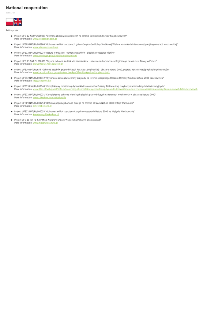 National cooperation 2015-12-16 Polish project: Project LIFE 12 NAT/PL/000081 "Ochrona zbiorowisk nieleśnych na terenie Beskidzkich Parków Krajobrazowych" More information: www.lifebeskidy.com.pl Project LIFE09 NAT/PL/000264 "Ochrona siedlisk kluczowych gatunków ptaków Doliny Środkowej Wisły w warunkach intensywnej presji aglomeracji warszawskiej" More information: www.wislawarszawska.pl Project LIFE12 NAT/PL/000034 "Natura w mozaice - ochrona gatunków i siedlisk w obszarze Pieniny" More information: www.pieninypn.pl/pl/931/0/o-projekcie.html Project LIFE 13 NAT PL 000009 "Czynna ochrona siedlisk włosieniczników i udrożnienie korytarza ekologicznego zlewni rzeki Drawy w Polsce" More information: drawalifeplus.rdos.szczecin.pl Project LIFE10 NAT/PL/655 "Ochrona zasobów przyrodniczych Puszczy Kampinoskiej - obszaru Natura 2000, poprzez renaturyzację wykupionych gruntów" More information: www.kampinoski-pn.gov.pl/info-active-kpn/59-activekpn-krotki-opis-projektu Project LIFE12 NAT/PL/000012 "Wykonanie zabiegów ochrony przyrody na terenie specjalnego Obszaru Ochrony Siedlisk Natura 2000 Szachownica" More information: lifeszachownica.pl Project LIFE13 ENV/PL/000048 "Kompleksowy monitoring dynamiki drzewostanów Puszczy Białowieskiej z wykorzystaniem danych teledetekcyjnych" More information: www.ibles.pl/web/guest/-/life-forbiosensing-pl-kompleksowy-monitoring-dynamiki-drzewostanow-puszczy-bialowieskiej-z-wykorzystaniem-danych-teledetekcyjnych Project LIFE12 NAT/PL/000031 "Kompleksowa ochrona nieleśnych siedlisk przyrodniczych na terenach wojskowych w obszarze Natura 2000" More information: www.rzikrakow.internetdsl.pl/life Project LIFE09 NAT/PL/000253 "Ochrona populacji bociana białego na terenie obszaru Natura 2000 Ostoja Warmińska" More information: ochronabociana.pl Project LIFE12 NAT/PL/000053 "Ochrona siedlisk kserotermicznych w obszarach Natura 2000 na Wyżynie Miechowskiej" More information: kserotermy-life-krakow.pl Project LIFE 11 INF PL 478 "Misja Natura" Fundacji Wspierania Inicjatyw Ekologicznych More information: www.misjanatura.fwie.pl