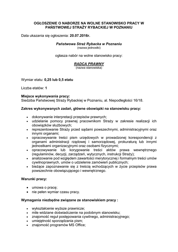 OGŁOSZENIE O NABORZE NA WOLNE STANOWISKO PRACY W PAŃSTWOWEJ STRAŻY RYBACKIEJ W POZNANIU Data ukazania się ogłoszenia: 20.07.2016r. Państwowa Straż Rybacka w Poznaniu (nazwa jednostki) ogłasza nabór na wolne stanowisko pracy: RADCA PRAWNY (nazwa stanowiska) Wymiar etatu: 0,25 lub 0,5 etatu Liczba etatów: 1 Miejsce wykonywania pracy: Siedziba Państwowej Straży Rybackiej w Poznaniu, al. Niepodległości 16/18. Zakres wykonywanych zadań, główne obowiązki na stanowisku pracy: dokonywanie interpretacji przepisów prawnych; udzielanie pomocy prawnej pracownikom Straży w zakresie realizacji ich obowiązków służbowych; reprezentowanie Straży przed sądami powszechnymi, administracyjnymi oraz innymi organami; opracowywanie treści pism urzędowych w prowadzonej korespondencji z organami administracji rządowej i samorządowej, prokuraturą lub innymi jednostkami organizacyjnymi oraz osobami fizycznymi; opracowywanie lub korygowanie treści aktów prawa wewnętrznego (regulaminów, decyzji, zarządzeń, wytycznych, instrukcji Straży); analizowanie pod względem zawartości merytorycznej i formalnym treści umów cywilnoprawnych, umów o udzielenie zamówień publicznych; bieżące zapoznawanie się z treścią wchodzących w życie przepisów prawa powszechnie obowiązującego i wewnętrznego. Warunki pracy: umowa o pracę; nie pełen wymiar czasu pracy. Wymagania niezbędne związane ze stanowiskiem pracy : wykształcenie wyższe prawnicze; mile widziane doświadczenie na podobnym stanowisku; znajomość reguł postępowania cywilnego, administracyjnego; umiejętność sporządzania pism; znajomość programów MS Office; dokładność, rzetelność i wnikliwość, terminowość, komunikatywność; umiejętność pracy w zespole, dobra organizacja pracy własnej; umiejętność analitycznego myślenia i praktycznego podejścia rozwiązywania problemów; zaangażowanie i dyspozycyjność. do Wymagane dokumenty i oświadczenia : kwestionariusz osobowy dla osoby ubiegającej się o zatrudnienie; list motywacyjny lub podanie o pracę; życiorys lub CV z opisem przebiegu pracy zawodowej; kserokopie świadectw pracy, obejmujące rok, w którym składane są dokumenty aplikacyjne; kserokopie dokumentów potwierdzających wykształcenie; inne dokumenty potwierdzające posiadane kwalifikacje, umiejętności i doświadczenie zawodowe; podpisane oświadczenie lub zaświadczenie o niekaralności; podpisane oświadczenie o posiadaniu pełnej zdolności do czynność prawnych oraz korzystaniu z pełni praw publicznych; podpisane oświadczenie o wyrażeniu zgody na przetwarzanie danych osobowych do celów rekrutacji. Termin i miejsce składania dokumentów : Dokumenty prosimy składać w terminie do dnia 19 sierpnia 2016 roku w siedzibie Państwowej Straży Rybackiej w Poznaniu osobiście lub drogą pocztową na n/w adres – decyduje data wpływu. Państwowa Straż Rybacka w Poznaniu Al. Niepodległości 16/18 61-713 Poznań Budynek C Wielkopolskiego Urzędu Wojewódzkiego, pokój nr 323 Inne informacje: Oferty, które nie spełniają wymagań formalnych są odrzucane przez Komisję Rekrutacyjną. Kandydaci, których oferty spełniają wymogi formalne zostaną powiadomieni indywidualnie o terminie rozmów kwalifikacyjnych (telefonicznie lub drogą elektroniczną). Dokumenty aplikacyjne kandydata, który zostanie wyłoniony w procesie rekrutacji zostaną dołączone do jego akt osobowych. Dokumenty aplikacyjne osób, które brały udział w naborze można odebrać w terminie 3 miesięcy od dnia zakończenia procedury naboru, po tym terminie Komisja zastrzega sobie prawo do zniszczenia dokumentów.