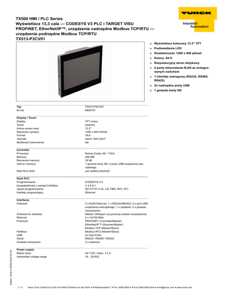 TX500 HMI / PLC Series Wyświetlacz 13,3 cala — CODESYS V3 PLC i TARGET VISU PROFINET, EtherNet/IP™, urządzenie nadrzędne Modbus TCP/RTU — urządzenie podrzędne Modbus TCP/RTU TX513-P3CV01 ■ Wyświetlacz kolorowy 13.3" TFT ■ Podświetlenie LED ■ Rozdzielczość 1280 x 800 pikseli ■ Kolory: 64 K ■ Rezystancyjny ekran dotykowy ■ 2 porty ethernetowe RJ45 ze zintegrowanym switchem ■ 1 interfejs szeregowy (RS232, RS485, RS422) ■ 2x nadrzędne porty USB ■ 1 gniazdo karty SD Typ Nr kat. TX513-P3CV01 6828107 Display / Touch Display Touch Active screen area Resolution (pixels) Format Jasność Możliwość ściemnienia TFT colour resistive 13,3" 1280 x 800 WXGA 16:9 stand. 300 Cd/m² tak Controller Processor Memory Remanent memory Add-on memory Real time clock Ramię Cortex A8, 1 GHz 256 MB 32 kB 1 gniazdo karty SD, 2 porty USB urządzenia nadrzędnego yes (battery-backed) Dane PLC Programowanie kompatybilność z wersją CoDeSys Języki programowania Interfejs programujący CODESYS V.3 V 3.5.8.1 IEC 61131-3 (IL, LD, FBD, SFC, ST) Ethernet Interfaces Onboard Fieldbus USB Serial Gniazdo rozszerzeń 2 x RJ45 Ethernet, 1 x RS232/485/422, 2 x port USB urządzenia nadrzędnego, 1 x zasilanie, 2 x gniazdo rozszerzenia Master CANopen (za pomocą modułu rozszerzenia) 2 x 10/100 Mbit PROFINET (Controller/Master) EtherNet/IP™ (Scanner/Master) Modbus TCP (Master/Slave) Modbus RTU (Master/Slave) 2x Host Ports RS232 / RS485 / RS422 2 x wtykowe Power supply Rated value Admissible voltage range 24 V DC, maks. 1,2 A 10…32VDC Edition • 2016-11-09T22:30:27+01:00 Onboard for selection Ethernet Protocols 1/4 Hans Turck GmbH & Co.KG ñ D-45472 Mülheim an der Ruhr ñ Witzlebenstraße 7 ñ Tel. 0208 4952-0 ñ Fax 0208 4952-264 ñ [email protected] ñ www.turck.com TX500 HMI / PLC Series Wyświetlacz 13,3 cala — CODESYS V3 PLC i TARGET VISU PROFINET, EtherNet/IP™, urządzenie nadrzędne Modbus TCP/RTU — urządzenie podrzędne Modbus TCP/RTU TX513-P3CV01 General data Operating ambient conditions Ex approval Klasa ochrony 0…50 °C, wilgotność względna 5…85 %, nieskondensowana -20…70 °C, wilgotność względna 5…85 %, nieskondensowana CE RoHS cULus Haz. Loc. Class I, Division 2, Groups A,B,C and D Z przodu IP66, z tyłu IP20 Dimensions Front (W x H x D) Cut-out (W x H) Głębokość montażu Waga 336x267x60mm 326x256mm 56 + 4 mm approx. 2.8 kg Storage ambient conditions Edition • 2016-11-09T22:30:27+01:00 Atesty 2/4 Hans Turck GmbH & Co.KG ñ D-45472 Mülheim an der Ruhr ñ Witzlebenstraße 7 ñ Tel. 0208 4952-0 ñ Fax 0208 4952-264 ñ [email protected] ñ www.turck.com TX500 HMI / PLC Series Wyświetlacz 13,3 cala — CODESYS V3 PLC i TARGET VISU PROFINET, EtherNet/IP™, urządzenie nadrzędne Modbus TCP/RTU — urządzenie podrzędne Modbus TCP/RTU TX513-P3CV01 Connection and pin assignment Napięcie zasilania Konfiguracja pinów Złącze zasilające dostarczane jest z każdym urządzeniem. Może też być zamówione osobno w firmie Turck. Oznaczenie: TX-Mount-xx Interfejsy USB Porty Ethernet Konfiguracja pinów Konfiguracja pinów Porty Ethernet są wzajemnie połączone poprzez wewnętrzny switch. Przewody Ethernet (przykłady): Złącze męskie RJ45 – złącze męskie RJ45: RJ45SRJ45S-4414-2M (nr katalogowy: 6441423) Złącze męskie RJ45 – złącze męskie M12, 4-piny, kodowanie D: RSSD-RJ45S-4414-2M (nr katalogowy: 6441413) Złącze męskie RJ45 – złącze męskie M8, 4-piny: PSGS4MRJ45S-4414-2M (nr katalogowy: 6933005) Złącze męskie RJ45 – złącze aparatowe, żeńskie, M12, 4-piny, kodowanie D: RJ45-FKSDD-4414-2M (nr katalogowy: 6935282) Interfejs szeregowy Konfiguracja pinów w trybie RS232 Interfejs szeregowy może pracować jako RS232, RS485 lub RS422. Znajdujący się obok schemat podłączenia przedstawia konfigurację pinów. Uwaga: W trybie RS485, piny 3 i 4, jak również 7 i 8 muszą być zewnętrzenie połączone! Konfiguracja pinów w trybie RS485 Edition • 2016-11-09T22:30:27+01:00 Konfiguracja pinów w trybie RS422 3/4 Hans Turck GmbH & Co.KG ñ D-45472 Mülheim an der Ruhr ñ Witzlebenstraße 7 ñ Tel. 0208 4952-0 ñ Fax 0208 4952-264 ñ [email protected] ñ www.turck.com TX500 HMI / PLC Series Wyświetlacz 13,3 cala — CODESYS V3 PLC i TARGET VISU PROFINET, EtherNet/IP™, urządzenie nadrzędne Modbus TCP/RTU — urządzenie podrzędne Modbus TCP/RTU TX513-P3CV01 Port na moduł dołączany Gniazdo karty SD Edition • 2016-11-09T22:30:27+01:00 Karta SD (przykład): SD CARD 2 GB (nr katalogowy: 6828025) 4/4 Hans Turck GmbH & Co.KG ñ D-45472 Mülheim an der Ruhr ñ Witzlebenstraße 7 ñ Tel. 0208 4952-0 ñ Fax 0208 4952-264 ñ [email protected] ñ www.turck.com