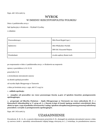 Sygn. akt I ACa 906/13 WYROK W IMIENIU RZECZYPOSPOLITEJ POLSKIEJ Dnia 17 października 2013 r. Sąd Apelacyjny w Krakowie – Wydział I Cywilny w składzie: Przewodniczący: SSA Paweł Rygiel (spr.) Sędziowie: SSA Władysław Pawlak SSO del. Krzysztof Hejosz Protokolant: st.sekr.sądowy Beata Lech po rozpoznaniu w dniu 17 października 2013 r. w Krakowie na rozprawie sprawy z powództwa A. B. i E. B. przeciwko G. B. o stwierdzenie nieważności umowy na skutek apelacji powodów od wyroku Sądu Okręgowego w Tarnowie z dnia 30 kwietnia 2013 r. sygn. akt I C 1145/12 1. oddala apelację; 2. zasądza od powodów na rzecz pozwanego kwotę 5.400 zł tytułem kosztów postępowania apelacyjnego; 3. przyznaje od Skarbu Państwa – Sądu Okręgowego w Tarnowie na rzecz adwokata M. C. z Kancelarii Adwokackiej w T. przy ul. (...) kwotę 6.642 zł (sześć tysięcy sześćset czterdzieści dwa złote) w tym 1.242 zł podatku od towarów i usług, tytułem nieopłaconej pomocy prawnej udzielonej powodom z urzędu w postępowaniu apelacyjnym. Sygn. akt I ACa 906/13 UZASADNIENIE Powodowie, E. B. i A. B., w pozwie skierowanym przeciwko G. B., domagali się ustalenia nieważności umowy z dnia 13 czerwca 2006 r. sprzedaży nieruchomości objętej księgą wieczystą nr (...) twierdząc, że przedmiotowa umowa miała charakter pozorny, gdyż w rzeczywistości umowa służyła wyłącznie zabezpieczeniu kredytu hipotecznego zaciągniętego przez pozwanego dla powodów. Pozwany wniósł o oddalenie powództwa. Zaskarżonym wyrokiem Sąd Okręgowy powództwo oddalił i zasądził od powodów na rzecz pozwanego koszty procesu. Podstawą wyrokowania były następujące ustalenia faktyczne. E. B. i A. B., w ramach prowadzonej działalności gospodarczej, planowali w 2006 r. wybudowanie i prowadzenie kolejnego sklepu. Z uwagi na zaciągnięte zobowiązania nie posiadali zdolności kredytowej, nie dysponowali również środkami finansowymi potrzebnymi na dokończenie inwestycji. W związku z tym udali się do firmy (...), która zajmowała się doradztwem finansowym. Za pośrednictwem tej firmy nawiązali kontakt z pozwanym, który zaoferował im swą pomoc. W dniu 13 czerwca 2006 r. strony zawarły umowę sprzedaży, na mocy której powodowie przenieśli na rzecz pozwanego własność nieruchomości objętej księgą wieczystą nr (...) za kwotę 431.000 zł. Powodowie pokwitowali odbiór kwoty 50.000 zł, kwotę 207.009,54 zł pozwany przelał na rzecz Banku (...) SA celem spłaty kredytu obciążającego powodów, a kwotę 173.990,46 zł przelał na rachunek bankowy powodów. Środki na zakup przedmiotowej nieruchomości pozwany uzyskał zaciągając w dniu 13 czerwca 2006 r. w Banku (...) SA kredyt hipoteczny „W.” na kwotę 381.000 zł. Spłata kredytu została rozłożona na 30 lat, a kredyt został zabezpieczony hipotekami na nieruchomości będącej przedmiotem umowy. W tym samym dniu strony zawarły umowę najmu na okres 30 miesięcy, która upoważniała powodów do dalszego zamieszkiwania na powyższej nieruchomości. Miesięczny czynsz najmu został ustalony na kwotę odpowiadającą racie kredytu obciążającego pozwanego. W dniu 16 czerwca 2006 r. strony zawarły w formie aktu notarialnego przedwstępną umowę sprzedaży spornej nieruchomości, w której pozwany zobowiązał się do przeniesienia na rzecz powodów lub ich zstępnych prawa własności nieruchomości w terminie do 12 stycznia 2009 r. za taką samą kwotę, za jaką nabył nieruchomość pomniejszoną o spłacone do tej pory raty kapitałowe kredytu zaciągniętego na podstawie umowy z 13 czerwca 2006 r. Nabycie nieruchomości przez powodów zostało ponadto ograniczone warunkiem, że wszelkie ich zobowiązania wobec pozwanego zostaną uprzednio spłacone. W tym samym akcie notarialnym pozwany ustanowił na rzecz powodów prawo pierwokupu nieruchomości na okres 30 miesięcy i zobowiązał się do zapłaty kary umownej w kwocie 500.000 zł w przypadku sprzedaży nieruchomości bez uprzedniego powiadomienia powodów o takim zamiarze. Po przelaniu przez pozwanego ceny nabycia na rachunek powodów, powodowie zwrócili mu poniesione koszty związane z zawarciem umów, a także przekazali mu wynagrodzenie w kwocie 38.000 zł. Po zawarciu powyższych umów powodowie nadal zamieszkiwali na opisanej wyżej nieruchomości. Dokonali też pewnych inwestycji, takich jak wymiana pieca, nasadzenia w ogrodzie. W 2007 roku pozwany podwyższył kwotę kredytu o 100.000 zł i z kwoty tej przekazał powodom 90.000 zł. W dniu 1 marca 2007 r. powodowie zawarli z pozwanym kolejną umowę najmu na okres 22 miesięcy i zobowiązali się do uiszczania czynszu najmu w kwocie 2130 zł miesięcznie. Następną umowę na okres 3 miesięcy zawarli w dniu 1 października 2010 r., a wysokość czynszu najmu nadal wynosiła 2130 zł. Kolejna umowa najmu została podpisana 1 stycznia 2011 r. na okres 2 miesięcy, a czynsz pozostał na dotychczasowej wysokości. W terminie określonym w umowie przedwstępnej powodowie nie byli w stanie odkupić nieruchomości, gdyż zrealizowana przez nich inwestycja nie przyniosła spodziewanych dochodów. Gdy syn powodów uzyskał pełnoletniość czynił starania w celu uzyskania kredytu i odkupienia nieruchomości od pozwanego. Pozwany udzielał mu pomocy w uzyskaniu kredytu, jednak ostatecznie okazało się to niemożliwe z uwagi na brak zdolności kredytowej P. B.. Powodowie zaprzestali regulowania należności na rzecz pozwanego, co spowodowało że pozwany zdecydował się wystąpić do Sądu Rejonowego w Tarnowie z żądaniem eksmisji powodów. W tym stanie rzeczy Sąd Okręgowy ocenił zgłoszone w pozwie roszczenie jako bezzasadne. Po odnotowaniu treści art. 83 § 1 kc oraz zawarciu wywodów teoretycznych obejmujących wykładnię przedmiotowego przepisu uznał, że sporna umowa nie była dotknięta wadą oświadczenia woli określaną mianem pozorności. Jakkolwiek bowiem strony skonstruowały stosunek prawny o sk