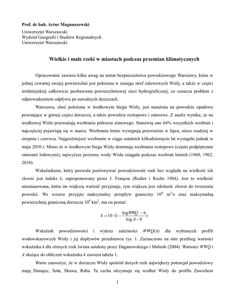 Prof. dr hab. Artur Magnuszewski Uniwersytet Warszawski Wydział Geografii i Studiów Regionalnych Uniwersytet Warszawski Wielkie i małe rzeki w miastach podczas przemian klimatycznych Opracowanie zawiera kilka uwag na temat bezpieczeństwa powodziowego Warszawy, która w jednej czwartej swojej powierzchni jest położona w zasięgu stref zalewowych Wisły, a także w części śródmiejskiej całkowicie pozbawiona powierzchniowej sieci hydrograficznej, co oznacza problem z odprowadzeniem odpływu po nawalnych deszczach. Warszawa, choć położona w środkowym biegu Wisły, jest narażona na powodzie opadowe powstające w górnej części dorzecza, a także powodzie roztopowe i zatorowe. Z analiz wynika, że na środkowej Wiśle przeważają wezbrania półrocza zimowego. Stanowią one 64% wszystkich wezbrań i najczęściej pojawiają się w marcu. Wezbrania letnie występują przeważnie w lipcu, nieco rzadziej w sierpniu i czerwcu. Najgroźniejsze wezbranie w ciągu ostatnich kilkudziesięciu lat wystąpiło jednak w maju 2010 r. Mimo że w środkowym biegu Wisły dominują wezbrania roztopowe (często podpiętrzane zatorami lodowymi), najwyższe poziomy wody Wisła osiągała podczas wezbrań letnich (1960, 1962, 2010). Wskaźnikiem, który pozwala porównywać powodziowość rzek bez względu na wielkość ich zlewni jest indeks k, zaproponowany przez J. Françou (Rodier i Roche 1984). Jest to wielkość niemianowana, która im większą wartość przyjmuje, tym większa jest zdolność zlewni do tworzenia powodzi. We wzorze przyjęto maksymalny przepływ graniczny 10 6 m3/s oraz maksymalną powierzchnię graniczną dorzecza 108 km2, ma on postać: k Wskaźnik powodziowości i log WWQ 6 ) log A 8 10 (1 wykres zależności WWQ(A) dla wybranych profili wodowskazowych Wisły i jej dopływów przedstawia rys. 1. Zaznaczono na nim przebieg wartości wskaźnika k dla różnych rzek świata ustalony przez Daganowskiego i Malinik (2004). Wartości WWQ i A służące do obliczeń wskaźnika k zawiera tabela 1. Warto zauważyć, że w dorzeczu Wisły spośród dużych rzek największy potencjał powodziowy mają Dunajec, Soła, Skawa, Raba. Ta cecha utrzymuje się wzdłuż Wisły do profilu Zawichost 1 zamykającego górną część dorzecza. Wyraźna jest odmienność nizinnych dopływów, które charakteryzują się małym wskaźnikiem powodziowości. Szczególnie niski wskaźnik powodziowości wykazują rzeki pojezierne, gdzie dużą rolę odgrywa retencja jeziorna. Tabela 1. Wartości wskaźnika powodziowości k Wisły i jej głównych dopływów obliczone na podstawie Atlas posterunków … (1996), Grela i in (1999), Dorzecze Wisły… (2011); o – wezbranie opadowe, r – roztopowe. Rzeka Wisła Wisła Wisła Wisła Wisła Profil Skoczów Szczucin Sandomierz Zawichost Warszawa A 297 23900 31846 50732 84857 Wisła Kępa Polska 168422 Wisła Włocławek 172389 Wisła Tczew 194376 Narew Zambski Kościelne 27782 Bug Wyszków 39119 Pilica Białobrzegi 8664 WWQ 648 5780 5270 6160 5860 5820/ 5490 6080 7840 / 9550 1250 / 1460 1430 / 2400 471 Rok 1958 2010 2010 2010 2010 Typ o o o o o 1979/2010 r/o 1979 1962 / 1924 1958 / 1979 1958 / 1979 k 4,23 3,82 3,48 3,29 2,73 1,94/1,85 r 1,98 r 2,23 / 2,55 o / r 1,84 / 2,03 o / r 1,65 / 2,31 o 1,81 Na rys. 1 pokazano także wskaźniki powodziowości obliczone na podstawie przepływów maksymalnych wezbrań roztopowych (Narew i Bug). Na podstawie danych z polskich rzek, Fal (2004) ustaliła równania zależności przepływu maksymalnego w funkcji powierzchni zlewni. Ich graficzną postać przedstawiono na rys. 1. Porównując te funkcje z funkcjami dla rzek świata, Fal (2004) obliczyła, że małe polskie zlewnie o powierzchni 10-100 km2 generują przepływy wezbraniowe 10,8-12,2 razy mniejsze niż podobnej wielkości zlewnie na świecie. Odpowiednio dorzecza o powierzchni 100 000-190 000 km2 są 8,6-9,5 razy mniej wydajne w generowaniu wezbrań niż podobne dorzecza na świecie. 2 Rys. 1. Wielkość przepływów maksymalnych w funkcji powierzchni zlewni Wisły i jej wybranych dopływów na skali wskaźnika powodziowości k wg J. Françou oraz funkcje WWQ(A): 1 – rzek świata wg World Catalogue…(2003) i 2 – rzek Polski, wg: Fal (2004), Magnuszewski (2013). Przebieg funkcji WWQ(A) obliczonych dla warunków światowych i polskich wskazuje, że powodziowość rzek w Polsce jest znacznie mniejsza. Szczególnie jest to widoczne w zakresie małych zlewni. Światowe rekordy wskaźnika powodziowości dotyczą małych zlewni górskich położonych w strefie wilgotnego klimatu gorącego, a więc skrajnie odbiegającego od warunków umiarkowanego klimatu przejściowego w Polsce. Istnieje fizyczne ograniczenie potencjału powodziowego każdej rzeki, które wynika z maksymalnej ilości opadu, jaki może wystąpić nad powierzchnią zlewni, a także efektywności transformacji opadu w odpływ. W zlewniach górskich potencjał powodziowy jest szczególnie duży ze względu na efekt orograficzny wymuszający duże sumy opadu, a także duże nachylenia stoków w zlewni sprzyjające szybkiej koncentracji odpływu. Górna obwiednia punktów na wykresie WWQ(A) może służyć do szacowania maksymalnego wiarygodnego wezbrania QMWW (Bartnik i Jokiel 2008, Fal 2004). Można przyjąć założenie, że 3 równanie obwiedni pozwala oszacować górne ograniczenie przedziału zmienności przepływów maksymalnych. Znane z literatury metody obliczania QMWW wykorzystują analizę transportu wilgoci atmosferycznej i jej transformację w odpływ za pomocą modelu opad-odpływ (Ozga-Zielińska i in. 2003). Ograniczeniem tych metod jest niepewność szacowania parametrów strumienia wilgoci w atmosferze, zwłaszcza dotyczy to historycznych powodzi, które wymagają rekonstrukcji sytuacji synoptycznej. Wartości wskaźnika powodziowości k wyznaczają przedział, w którym zawierają się największe wydajności zlewni w generowaniu odpływu. Ta właściwość może być wykorzystan