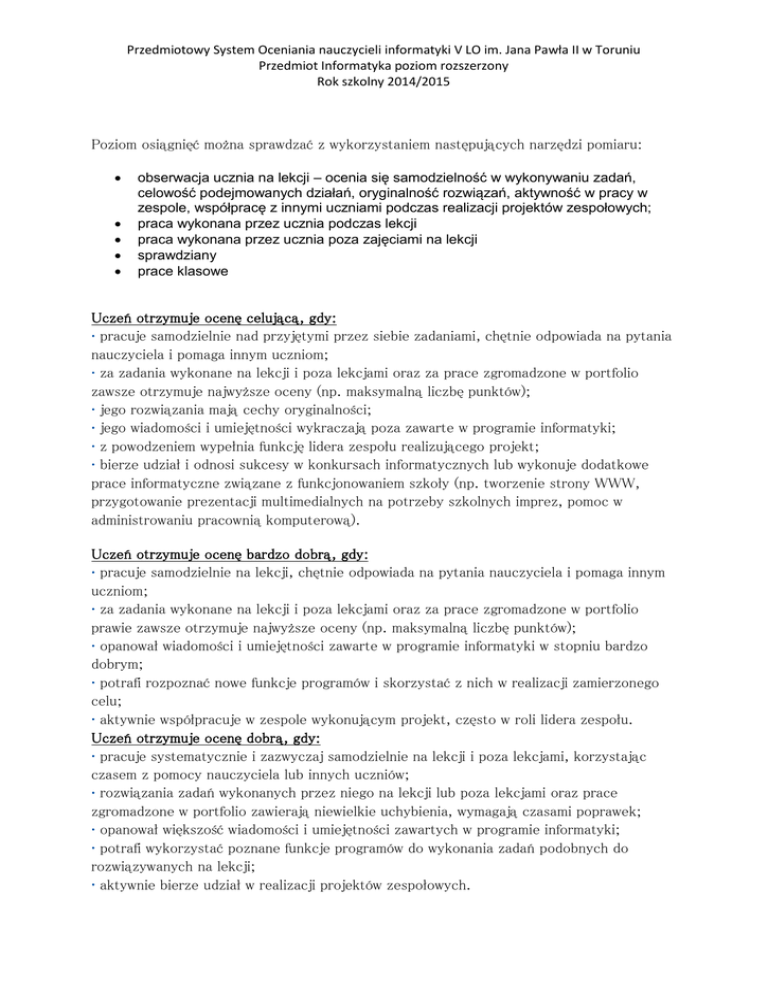 Przedmiotowy System Oceniania nauczycieli informatyki V LO im. Jana Pawła II w Toruniu Przedmiot Informatyka poziom rozszerzony Rok szkolny 2014/2015 Poziom osiągnięć można sprawdzać z wykorzystaniem następujących narzędzi pomiaru: obserwacja ucznia na lekcji – ocenia się samodzielność w wykonywaniu zadań, celowość podejmowanych działań, oryginalność rozwiązań, aktywność w pracy w zespole, współpracę z innymi uczniami podczas realizacji projektów zespołowych; praca wykonana przez ucznia podczas lekcji praca wykonana przez ucznia poza zajęciami na lekcji sprawdziany prace klasowe Uczeń otrzymuje ocenę celującą, gdy: • pracuje samodzielnie nad przyjętymi przez siebie zadaniami, chętnie odpowiada na pytania nauczyciela i pomaga innym uczniom; • za zadania wykonane na lekcji i poza lekcjami oraz za prace zgromadzone w portfolio zawsze otrzymuje najwyższe oceny (np. maksymalną liczbę punktów); • jego rozwiązania mają cechy oryginalności; • jego wiadomości i umiejętności wykraczają poza zawarte w programie informatyki; • z powodzeniem wypełnia funkcję lidera zespołu realizującego projekt; • bierze udział i odnosi sukcesy w konkursach informatycznych lub wykonuje dodatkowe prace informatyczne związane z funkcjonowaniem szkoły (np. tworzenie strony WWW, przygotowanie prezentacji multimedialnych na potrzeby szkolnych imprez, pomoc w administrowaniu pracownią komputerową). Uczeń otrzymuje ocenę bardzo dobrą, gdy: • pracuje samodzielnie na lekcji, chętnie odpowiada na pytania nauczyciela i pomaga innym uczniom; • za zadania wykonane na lekcji i poza lekcjami oraz za prace zgromadzone w portfolio prawie zawsze otrzymuje najwyższe oceny (np. maksymalną liczbę punktów); • opanował wiadomości i umiejętności zawarte w programie informatyki w stopniu bardzo dobrym; • potrafi rozpoznać nowe funkcje programów i skorzystać z nich w realizacji zamierzonego celu; • aktywnie współpracuje w zespole wykonującym projekt, często w roli lidera zespołu. Uczeń otrzymuje ocenę dobrą, gdy: • pracuje systematycznie i zazwyczaj samodzielnie na lekcji i poza lekcjami, korzystając czasem z pomocy nauczyciela lub innych uczniów; • rozwiązania zadań wykonanych przez niego na lekcji lub poza lekcjami oraz prace zgromadzone w portfolio zawierają niewielkie uchybienia, wymagają czasami poprawek; • opanował większość wiadomości i umiejętności zawartych w programie informatyki; • potrafi wykorzystać poznane funkcje programów do wykonania zadań podobnych do rozwiązywanych na lekcji; • aktywnie bierze udział w realizacji projektów zespołowych. Przedmiotowy System Oceniania nauczycieli informatyki V LO im. Jana Pawła II w Toruniu Przedmiot Informatyka poziom rozszerzony Rok szkolny 2014/2015 Uczeń otrzymuje ocenę dostateczną, gdy: • pracuje nie zawsze systematycznie na lekcji, często wymaga pomocy nauczyciela lub innych uczniów; • często popełnia błędy w rozwiązaniach zadań wykonywanych samodzielnie na lekcji i poza lekcjami oraz w pracach zgromadzonych w portfolio, nie kończy wykonania zadań lub je opuszcza; • opanował większość wiadomości i umiejętności zawartych w programie informatyki w stopniu dostatecznym; • potrafi powtórzyć sposób rozwiązania zadań omawianych na lekcji zajęć; • wykonuje poprawnie swoje zadania w zespole, często jednak z pomocą innych uczniów. Uczeń otrzymuje ocenę dopuszczającą, gdy: • pracuje niesystematycznie na lekcji, wymaga stałej pomocy nauczyciela lub innych uczniów; • nie angażuje się w pracę poza zajęciami; • często popełnia błędy w rozwiązaniach zadań wykonywanych samodzielnie na lekcji oraz w pracach zgromadzonych w portfolio, nie kończy wykonania zadań lub je opuszcza; • opanował część wiadomości i umiejętności zawartych w programie informatyki w stopniu dostatecznym; • potrafi powtórzyć sposób rozwiązania zadań omawianych na lekcji; • jest mało aktywny w realizacji projektów zespołowych. Uczeń otrzymuje ocenę niedostateczną, gdy: • nie opanował większości wiadomości i umiejętności wymaganych podstawą programową informatyki na poziomie podstawowym; • nie pracuje na lekcji lub nie kończy wykonywanych zadań; • nie angażuje się w pracę poza zajęciami; • nie angażuje się we współpracę z innymi uczniami; • nie podejmuje wysiłku i nie stara się nadrobić zaległości.”* Metoda oceniania Zespół przyjmuje do stosowania sformalizowany system oceniania oparty na wykorzystaniu średniej ważonej, przyjęty przez Radę Pedagogiczną Szkoły, a mianowicie; 1. Każda kategoria ocen otrzymuje stosowną wagę w zakresie od 1 do 6 2. Wszyscy członkowie zespołu wykorzystują występujące w systemie Librus standardowe kategorie ocen, indywidualnie przypisując im wagi statystyczne 3. Poszczególni członkowie zespołu mogą tworzyć własne kategorie ocen, zawsze z uwzględnieniem pt. 1 4. Ocena semestralna (końcowa) ucznia jest nie niższa niż wynikająca ze średniej wg. zasady: Średnia 0-1,99 2,00-2,69 2,70-3,69 Ocena Niedostateczna Dopuszczająca Dostateczna Przedmiotowy System Oceniania nauczycieli informatyki V LO im. Jana Pawła II w Toruniu Przedmiot Informatyka poziom rozszerzony Rok szkolny 2014/2015 3,70-4,69 4,70-5,29 5,30-6,0 Dobra Bardzo dobra Celująca 5. Ocena semestralna wystawiana jest na podstawie średniej z semestru, ocena roczna – średniej z roku. 6. Średnie liczone są automatycznie przez system LIBRUS z dokładnością do dwu miejsc po przecinku, zgodnie z obowiązującymi w matematyce zasadami i wzorami. 7. Oceny, w szczególności semestralna i roczna wystawiane są z uwzględnieniem zasad zawartych w części „Kryteria ocen”