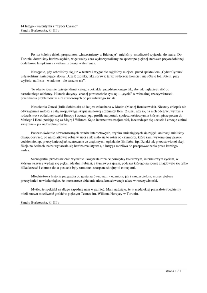 14 lutego - walentynki z "Cyber Cyrano" Sandra Borkowska, kl. III b Po raz kolejny dzięki programowi „Inwestujemy w Edukację” mieliśmy możliwość wyjazdu do teatru. Do Torunia dotarliśmy bardzo szybko, więc wolny czas wykorzystaliśmy na spacer po pięknej starówce przyozdobionej dodatkowo lampkami i kwiatami z okazji walentynek. Następnie, gdy zebraliśmy się już w teatrze i wygodnie zajęliśmy miejsca, przed spektaklem „Cyber Cyrano” usłyszeliśmy następujące słowa: „Cześć ziomki, taka sprawa: teraz wyłączcie komcie i nie róbcie fot. Potem, przy wyjściu, na Insta - wiadomo - ale teraz to nie”. To zdanie idealnie opisuje klimat całego spektaklu, przedstawionego tak, aby jak najlepiej trafić do nastoletniego odbiorcy. Historia dotyczy znanej powszechnie sytuacji - ,,życia” w wirtualnej rzeczywistości i przenikania problemów w nim stworzonych do prawdziwego świata. Nastoletnia Zsuzsi (Julia Sobiesiak) od lat jest zakochana w Matim (Maciej Roniszewski). Niestety chłopak nie odwzajemnia miłości i całą swoją uwagę skupia na nowej uczennicy Heni. Zsuzsi, aby się na nich odegrać, wymyśla rodzeństwo z oddalonej części Europy i tworzy jego profile na portalu społecznościowym, z których pisze potem do Matiego i Heni, podając się za Mojrę i Wiktora. Są to internetowe znajomości, lecz rodzące się uczucia i emocje z nimi związane – jak najbardziej realne. Podczas świetnie odwzorowanych czatów internetowych, szybko zmieniających się zdjęć i animacji mieliśmy okazję dostrzec, co nastolatkowie robią w sieci i jak mało się to różni od czynności, które sami wykonujemy prawie codziennie, np. przesyłanie zdjęć, czatowanie ze znajomymi, oglądanie filmików, itp. Dzięki tak przedstawionej akcji fikcja na deskach teatru wydawała się bardzo realistyczna, a intryga możliwa do przeprowadzenia przez każdego widza. Scenografia przedstawienia wyraźnie ukazywała różnice pomiędzy kolorowym, internetowym życiem, w którym wszyscy wydają się piękni, idealni i lubiani, a tym zwyczajnym, podczas którego na scenie znajdowało się tylko kilka krzeseł i ciemne tło, a postacie były samotne i szarpane skrajnymi emocjami. Młodzieżowa historia przypadła do gustu zarówno nam - uczniom, jak i nauczycielom, niosąc głębsze przesyłanie i uświadamiając, że internetowe działania niosą konsekwencje także w rzeczywistości. Myślę, że spektakl na długo zapadnie nam w pamięć. Mam nadzieję, że w niedalekiej przyszłości będziemy mieli znowu możliwość gościć w pięknym Teatrze im. Wiliama Horzycy w Toruniu. Sandra Borkowska, kl. III b strona 1 / 1