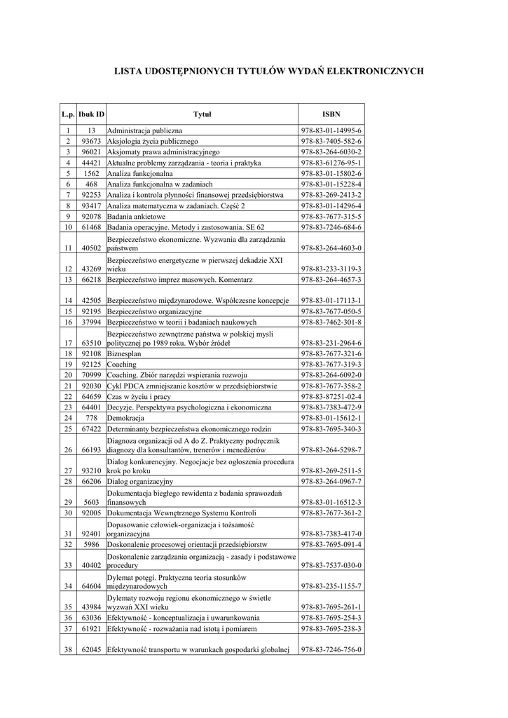 LISTA UDOSTĘPNIONYCH TYTUŁÓW WYDAŃ ELEKTRONICZNYCH L.p. Ibuk ID Tytuł ISBN 1 2 3 4 5 6 7 8 9 10 13 93673 96021 44421 1562 468 92253 93417 92078 61468 Administracja publiczna Aksjologia życia publicznego Aksjomaty prawa administracyjnego Aktualne problemy zarządzania - teoria i praktyka Analiza funkcjonalna Analiza funkcjonalna w zadaniach Analiza i kontrola płynności finansowej przedsiębiorstwa Analiza matematyczna w zadaniach. Część 2 Badania ankietowe Badania operacyjne. Metody i zastosowania. SE 62 978-83-01-14995-6 978-83-7405-582-6 978-83-264-6030-2 978-83-61276-95-1 978-83-01-15802-6 978-83-01-15228-4 978-83-269-2413-2 978-83-01-14296-4 978-83-7677-315-5 978-83-7246-684-6 11 Bezpieczeństwo ekonomiczne. Wyzwania dla zarządzania 40502 państwem 978-83-264-4603-0 12 13 Bezpieczeństwo energetyczne w pierwszej dekadzie XXI 43269 wieku 66218 Bezpieczeństwo imprez masowych. Komentarz 978-83-233-3119-3 978-83-264-4657-3 14 15 16 42505 Bezpieczeństwo międzynarodowe. Współczesne koncepcje 92195 Bezpieczeństwo organizacyjne 37994 Bezpieczeństwo w teorii i badaniach naukowych 978-83-01-17113-1 978-83-7677-050-5 978-83-7462-301-8 17 18 19 20 21 22 23 24 25 63510 92108 92125 70999 92030 64659 64401 778 67422 26 Diagnoza organizacji od A do Z. Praktyczny podręcznik 66193 diagnozy dla konsultantów, trenerów i menedżerów 27 28 Dialog konkurencyjny. Negocjacje bez ogłoszenia procedura 93210 krok po kroku 978-83-269-2511-5 66206 Dialog organizacyjny 978-83-264-0967-7 29 30 Dokumentacja biegłego rewidenta z badania sprawozdań 5603 finansowych 92005 Dokumentacja Wewnętrznego Systemu Kontroli 978-83-01-16512-3 978-83-7677-361-2 31 32 Dopasowanie człowiek-organizacja i tożsamość 92401 organizacyjna 5986 Doskonalenie procesowej orientacji przedsiębiorstw 978-83-7383-417-0 978-83-7695-091-4 33 Doskonalenie zarządzania organizacją - zasady i podstawowe 40402 procedury 978-83-7537-030-0 34 Dylemat potęgi. Praktyczna teoria stosunków 64604 międzynarodowych 978-83-235-1155-7 35 36 37 Dylematy rozwoju regionu ekonomicznego w świetle 43984 wyzwań XXI wieku 63036 Efektywność - konceptualizacja i uwarunkowania 61921 Efektywność - rozważania nad istotą i pomiarem 978-83-7695-261-1 978-83-7695-254-3 978-83-7695-238-3 38 62045 Efektywność transportu w warunkach gospodarki globalnej 978-83-7246-756-0 Bezpieczeństwo zewnętrzne państwa w polskiej mysli politycznej po 1989 roku. Wybór źródeł Biznesplan Coaching Coaching. Zbiór narzędzi wspierania rozwoju Cykl PDCA zmniejszanie kosztów w przedsiębiorstwie Czas w życiu i pracy Decyzje. Perspektywa psychologiczna i ekonomiczna Demokracja Determinanty bezpieczeństwa ekonomicznego rodzin 978-83-231-2964-6 978-83-7677-321-6 978-83-7677-319-3 978-83-264-6092-0 978-83-7677-358-2 978-83-87251-02-4 978-83-7383-472-9 978-83-01-15612-1 978-83-7695-340-3 978-83-264-5298-7 39 40 41 42 43 44 45 46 47 36783 66994 66251 38618 38619 66289 89683 61335 61384 Efektywność zarządzania zasobami ludzkimi Ekonometria. Podstawy teorii i praktyki Ekonomia eksperymentalna Ekonomia, t. 1 Ekonomia, t. 2 Elementarny kurs prawa cywilnego E-logistyka Estetyczne aspekty japońskiej przestrzeni miejskiej Estetyka wirtualności 978-83-7525-546-1 978-83-87251-13-0 978-83-264-5176-8 978-83-7695-109-6 978-83-7695-113-3 978-83-264-5083-9 978-83-208-2123-9 978-83-242-1501-0 978-83-242-1413-6 48 49 50 51 52 62843 64779 35869 42506 42635 Etapy ewolucji i kierunki integracji metod rachunkowości zarządczej Etyka i profesjonalizm w zawodzie nauczyciela Europeistyka. Leksykon Europeistyka. Podręcznik akademicki t. 2 Europeistyka. Podręcznik akademicki t.1 978-83-7525-065-7 978-83-7525-456-3 978-83-01-16572-7 978-83-01-16929-9 978-83-01-16928-2 53 54 Europejska Polityka Sąsiedztwa. Unia Europejska i jej 69059 sąsiedzi - wzajemne relacje i wyzwania 70473 Finanse i rachunkowość 55 56 57 58 59 60 61 62 63 64 65 70947 92106 2085 91281 92143 92573 71001 95875 66277 92406 26619 Finanse publiczne i prawo finansowe. Zagadnienia egzaminacyjne i seminaryjne Fuzje i przejęcia spółek Fuzje, przejęcia... Globalizacja a rozwój Harmonogramowanie produkcji w systemie kanban Historia myśli ekonomicznej Historia myśli socjologiczno-ekonomicznej Historia polskiej myśli politycznej Historia ustroju i prawa polskiego (1772-1918) Imigracja a globalizacja Innowacyjne zarządzanie organizacjami 978-83-264-5297-0 978-83-269-2454-5 978-83-233-2476-8 978-83-7383-553-5 978-83-269-2067-7 978-83-208-2125-3 978-83-264-5309-0 978-83-264-5194-2 978-83-264-5153-9 978-83-7383-599-3 978-83-233-3139-1 66 67 91949 Innowacyjność w rozwoju lokalnym i regionalnym. PN 285 45470 Instrumenty zarządzania kosztami i dokonaniami 978-83-7695-341-0 978-83-7695-245-1 68 69 70 71 72 73 37991 66448 61525 92051 92015 92086 Instytucje bezpieczeństwa wewnętrznego w Polsce. Zarys dziejów (od X wieku do współczesności) Instytucje gospodarki rynkowej Interdyscyplinarność w naukach o zarządzaniu ISO 27001 - zapewnij bezpieczeństwo informacji Jak przygotować i przekazać siwz Jak ubiegać się o fundusze unijne? 978-83-7462-297-4 978-83-264-4707-5 978-83-7246-669-3 978-83-7677-192-2 978-83-269-2261-9 978-83-269-2466-8 74 75 Jak unikać błędów w specyfikacji - poradnik dla 92225 zamawiających 92154 Jakość podstawą sukcesu nowoczesnego przedsiębiorstwa 978-83-269-2266-4 978-83-269-2075-2 76 77 78 79 80 37989 70732 2579 45242 44454 Jednostka kontrterrorystyczna - element działań bojowych w systemie bezpieczeństwa antyterrorystycznego Kapitał ludzki. Ujęcie teoretyczne Katastrofy i zagrożenia we współczesnym świecie Kim jesteś politologu? Klasa kreatywna w Polsce 978-83-7462-278-3 978-83-7252-604-5 978-83-01-15654-1 978-83-233-3158-2 978-83-63962-04-3 81 82 83 84 92551 66782 66567 2091 Klastry biznesowe w rozwoju konkurencyjności i innowacyjności regionów Klasyczne i nowoczesne struktury organizacji Kodeks wykroczeń. Komentarz Kompendium wiedzy o logistyce 978-83-