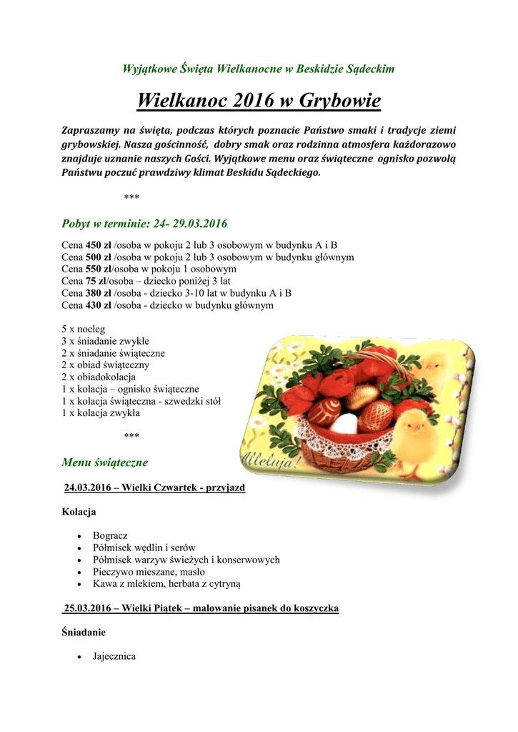 Wyjątkowe Święta Wielkanocne w Beskidzie Sądeckim Wielkanoc 2016 w Grybowie Zapraszamy na święta, podczas których poznacie Państwo smaki i tradycje ziemi grybowskiej. Nasza gościnność, dobry smak oraz rodzinna atmosfera każdorazowo znajduje uznanie naszych Gości. Wyjątkowe menu oraz świąteczne ognisko pozwolą Państwu poczuć prawdziwy klimat Beskidu Sądeckiego. *** Pobyt w terminie: 24- 29.03.2016 Cena 450 zł /osoba w pokoju 2 lub 3 osobowym w budynku A i B Cena 500 zł /osoba w pokoju 2 lub 3 osobowym w budynku głównym Cena 550 zł/osoba w pokoju 1 osobowym Cena 75 zł/osoba – dziecko poniżej 3 lat Cena 380 zł /osoba - dziecko 3-10 lat w budynku A i B Cena 430 zł /osoba - dziecko w budynku głównym 5 x nocleg 3 x śniadanie zwykłe 2 x śniadanie świąteczne 2 x obiad świąteczny 2 x obiadokolacja 1 x kolacja – ognisko świąteczne 1 x kolacja świąteczna - szwedzki stół 1 x kolacja zwykła *** Menu świąteczne 24.03.2016 – Wielki Czwartek - przyjazd Kolacja Bogracz Półmisek wędlin i serów Półmisek warzyw świeżych i konserwowych Pieczywo mieszane, masło Kawa z mlekiem, herbata z cytryną 25.03.2016 – Wielki Piątek – malowanie pisanek do koszyczka Śniadanie Jajecznica Sos tatarski Półmisek serów i twarogów Półmisek warzyw świeżych i konserwowych Pieczywo mieszane, masło Kawa z mlekiem, herbata z cytryną, kakao Dżemy, miód i mleko, płatki śniadaniowe Obiadokolacja Krupnik z warzywami Ziemniaki z koperkiem, frytki Ryba smażona Surówka z kiszonej kapusty Kompot owocowy 26.03.2016 – Wielka Sobota – dla chętnych wspólne wyjście do kościoła na święcenie pokarmów Śniadanie Tuńczyk pod pierzynką Śledzie w oliwie Jajko faszerowane pastą z łososia Półmisek wędlin i serów Półmisek warzyw świeżych i konserwowych Pieczywo mieszane, masło Kawa z mlekiem, herbata z cytryną, kakao Dżemy, miód i mleko, płatki śniadaniowe Obiadokolacja Zupa pomidorowa z lanymi kluseczkami Ziemniaki z koperkiem Frykas drobiowy z duszoną papryką Surówka z kapustą pekińską Kompot owocowy 27.03.2016 – Wielkanoc – „Alleluja – Biją dzwony” Śniadanie Święconka na serwatce – tradycyjna świąteczna potrawa regionalna Tymbaliki z szynki z twarożkiem chrzanowym w subtelnej galarecie Półmisek wędlin i serów Jajka w sosie chrzanowym Ćwikła z chrzanem – tradycyjny regionalny dodatek do święconego pokarmu Półmisek świeżych i konserwowych warzyw Pieczywo mieszane, masło Dodatki: ketchup, musztarda, chrzan Kawa z mlekiem, herbata z cytryną, kakao Dżemy, miód i mleko, płatki śniadaniowe Babka wielkanocna Obiad Rosół domowy z makaronem i pierożkami mięsnymi Roladki wieprzowe nadziane kapustą kiszoną w białym winie zduszoną Filet drobiowy soute z pieczarkami i serem Kluski śląskie Ćwiartki ziemniaczane zapiekane Duet surówek: czerwona kapusta & surówka z selera Kompot owocowy Ciasto - Pyszotka Kolacja Kwaśnica po góralsku z wędzonką Grillowany karczek prosto z rożna Kiełbaski pieczone własnoręcznie nad ogniskiem Krupniok na gorąco Umundurowane ziemniaki opiekane w folii Zapiekanka warzywna Kiszone ogórki Domowy smalec z cebulką Pieczywo mieszane Dodatki: ketchup, musztarda Herbata z cytryną 28.03.2016 – Poniedziałek Wielkanocny Śniadanie Żurek z białą kiełbasą Sałatka jarzynowa Galaretki drobiowe Półmisek wędlin i serów Półmisek warzyw świeżych i konserwowych Sałatka z selera konserwowego, ananasa i szynki Pieczywo mieszane, masło Dodatki: ketchup, musztarda Kawa z mlekiem, herbata z cytryną, kakao Dżemy, miód i mleko, płatki śniadaniowe Babka wielkanocna Obiad Zupa krem z porów z grzankami Pieczeń z szynki w sosie pieczarkowym Eskalopka drobiowa z ananasem i żurawiną Ziemniaki z koperkiem Duet surówek: surówka z kapustą pekińską & surówka z marchewki Kompot owocowy Ciasto - Sernik wiedeński Kolacja Gołąbki w sosie grzybowym Półmisek wędlin i serów Półmisek warzyw świeżych i konserwowych Pieczywo mieszane, masło Kawa z mlekiem, herbata z cytryną 29.03.2016 – Wtorek - wyjazd Śniadanie Kiełbaski wiedeńskie na ciepło Półmisek wędlin i serów Półmisek warzyw świeżych i konserwowych Pieczywo mieszane, masło Kawa z mlekiem, herbata z cytryną, kakao Dżemy, miód i mleko, płatki śniadaniowe Do Państwa dyspozycji pozostają: Tenis stołowy, plac zabaw dla dzieci, zewnętrzna siłownia, kort tenisowy, boisko do koszykówki i siatkówki, kije do nordic walking, kącik zabaw dla dzieci, sauna, parking na terenie ośrodka. Dodatkowe informacje: Dopłata do apartamentu – wg cennika Dzieci do 3 lat – 15 zł za dobę bez świadczeń Chęć przyjazdu ze zwierzętami należy zgłaszać przy rezerwacji – opłata wg cennika Niewykorzystanie któregokolwiek elementu wchodzącego w skład pakietu nie powoduje zmniejszenia jego wartości Pakiet rozpoczyna się od kolacji i kończy śniadaniem W przypadku braku dostatecznej liczby chętnych (mniej niż 25 osób) zastrzegamy sobie prawo odstąpienia od organizowania pobytu Informacja w Ośrodku Szkoleniowo – Wypoczynkowym w Grybowie Tel (18) 445-03-04, 445-03-05, e-mail ([email protected]). Zapisy bezpośrednio w ośrodku w Grybowie. Przedpłaty w wysokości 40% kosztów do dnia 18.03.2016 r przelewem na konto w Pekao SA 23 1240 4748 1111 0000 4870 5523 adres: Politechnika Warszawska Ośrodek Szkoleniowo – Wypoczynkowy 33-330 Grybów ul. Chłodna 16.