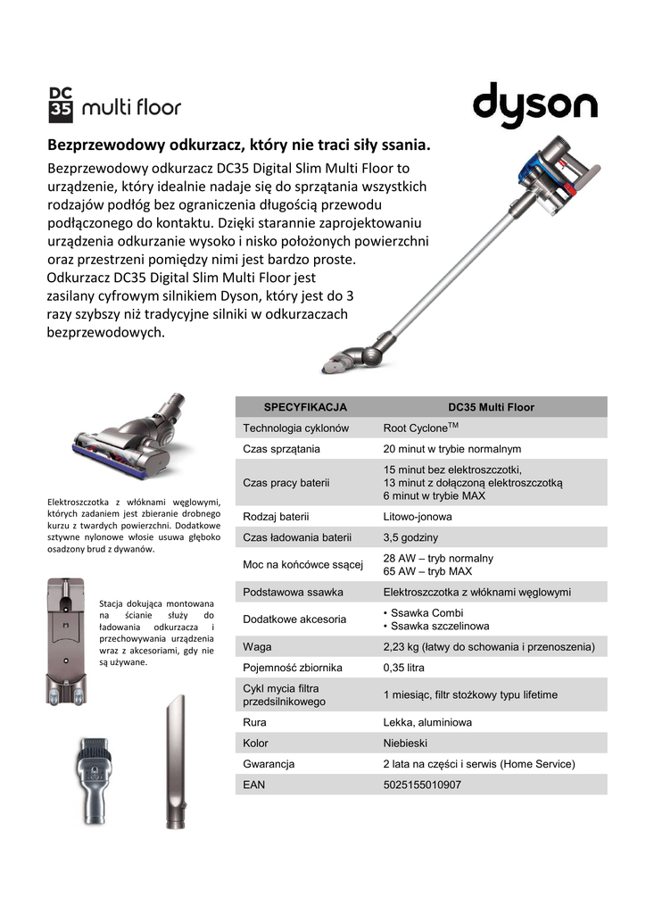 Bezprzewodowy odkurzacz, który nie traci siły ssania. Bezprzewodowy odkurzacz DC35 Digital Slim Multi Floor to urządzenie, który idealnie nadaje się do sprzątania wszystkich rodzajów podłóg bez ograniczenia długością przewodu podłączonego do kontaktu. Dzięki starannie zaprojektowaniu urządzenia odkurzanie wysoko i nisko położonych powierzchni oraz przestrzeni pomiędzy nimi jest bardzo proste. Odkurzacz DC35 Digital Slim Multi Floor jest zasilany cyfrowym silnikiem Dyson, który jest do 3 razy szybszy niż tradycyjne silniki w odkurzaczach bezprzewodowych. SPECYFIKACJA Elektroszczotka z włóknami węglowymi, których zadaniem jest zbieranie drobnego kurzu z twardych powierzchni. Dodatkowe sztywne nylonowe włosie usuwa głęboko osadzony brud z dywanów. Stacja dokująca montowana na ścianie służy do ładowania odkurzacza i przechowywania urządzenia wraz z akcesoriami, gdy nie są używane. DC35 Multi Floor Technologia cyklonów Root CycloneTM Czas sprzątania 20 minut w trybie normalnym Czas pracy baterii 15 minut bez elektroszczotki, 13 minut z dołączoną elektroszczotką 6 minut w trybie MAX Rodzaj baterii Litowo-jonowa Czas ładowania baterii 3,5 godziny Moc na końcówce ssącej 28 AW – tryb normalny 65 AW – tryb MAX Podstawowa ssawka Elektroszczotka z włóknami węglowymi Dodatkowe akcesoria • Ssawka Combi • Ssawka szczelinowa Waga 2,23 kg (łatwy do schowania i przenoszenia) Pojemność zbiornika 0,35 litra Cykl mycia filtra przedsilnikowego 1 miesiąc, filtr stożkowy typu lifetime Rura Lekka, aluminiowa Kolor Niebieski Gwarancja 2 lata na części i serwis (Home Service) EAN 5025155010907