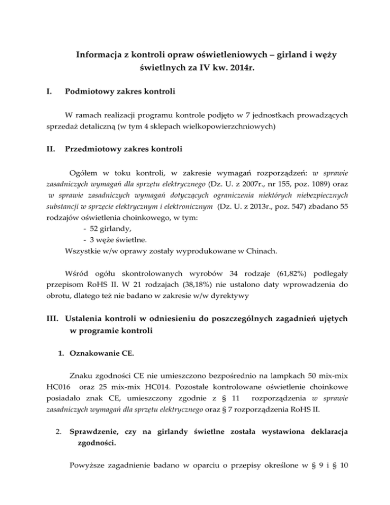 Informacja z kontroli opraw oświetleniowych – girland i węży świetlnych za IV kw. 2014r. I. Podmiotowy zakres kontroli W ramach realizacji programu kontrole podjęto w 7 jednostkach prowadzących sprzedaż detaliczną (w tym 4 sklepach wielkopowierzchniowych) II. Przedmiotowy zakres kontroli Ogółem w toku kontroli, w zakresie wymagań rozporządzeń: w sprawie zasadniczych wymagań dla sprzętu elektrycznego (Dz. U. z 2007r., nr 155, poz. 1089) oraz w sprawie zasadniczych wymagań dotyczących ograniczenia niektórych niebezpiecznych substancji w sprzęcie elektrycznym i elektronicznym (Dz. U. z 2013r., poz. 547) zbadano 55 rodzajów oświetlenia choinkowego, w tym: - 52 girlandy, - 3 węże świetlne. Wszystkie w/w oprawy zostały wyprodukowane w Chinach. Wśród ogółu skontrolowanych wyrobów 34 rodzaje (61,82%) podlegały przepisom RoHS II. W 21 rodzajach (38,18%) nie ustalono daty wprowadzenia do obrotu, dlatego też nie badano w zakresie w/w dyrektywy III. Ustalenia kontroli w odniesieniu do poszczególnych zagadnień ujętych w programie kontroli 1. Oznakowanie CE. Znaku zgodności CE nie umieszczono bezpośrednio na lampkach 50 mix-mix HC016 oraz 25 mix-mix HC014. Pozostałe kontrolowane oświetlenie choinkowe posiadało znak CE, umieszczony zgodnie z § 11 rozporządzenia w sprawie zasadniczych wymagań dla sprzętu elektrycznego oraz § 7 rozporządzenia RoHS II. 2. Sprawdzenie, czy na girlandy świetlne została wystawiona deklaracja zgodności. Powyższe zagadnienie badano w oparciu o przepisy określone w § 9 i § 10 rozporządzenia w sprawie zasadniczych wymagań dla sprzętu elektrycznego oraz § 6 ust. 3 rozporządzenia RoHS II. Deklaracji zgodności żądano w przypadku kontroli przeprowadzanych u pierwszych dystrybutorów lub, gdy podczas oceny wyrobów występowały wątpliwości dot. spełniania zasadniczych lub innych wymagań. Otrzymano deklaracje zgodności wystawione dla 31 modeli opraw oświetleniowych. W deklaracji zgodności lampek choinkowych 50 mix-mix HC016 oraz 25 mixmix HC014 wystawionej przez importera przywołano nieaktualne normy zharmonizowane i dyrektywę 73/23/EEC. Dodatkowo dokument nie zawierał oświadczenia o zgodności ww. oświetlenia choinkowego z dyrektywą 2011/65/UE. Podmiot wprowadzający nie okazał upoważnienia do wystawienia deklaracji. Deklaracji zgodności dot. pozostałych niezgodnych z wymaganiami wyrobów nie uzyskano z powodu braku możliwości ustalenia podmiotów wprowadzających je do obrotu. Próby ustalenia łańcucha sprzedaży okazały się nieskuteczne z uwagi na brak reakcji na kierowane wystąpienia (dot. lampek choinkowych CL-021M, CL-011, CL-111 oraz 100 LED z dodatkowym gniazdem art. No 9511M, 200 LED z dodatkowym gniazdem art. No 9511M, 20 LED art. No 9501M, węża świetlnego 10m, wężyka 200G, sopli świetlnych 100 żarówek 100G, i 200 żarówek 200G) 3. Informacja o producencie. Zgodnie z § 5 ust. rozporządzenia w sprawie zasadniczych wymagań dla sprzętu elektrycznego sprawdzono, czy na wyrobach umieszczona została nazwa producenta, znak firmowy lub znak towarowy. Ponadto w przypadku wyrobów podlegających przepisom dyrektyw RoHS II badano, czy zgodnie z § 8 rozporządzenia w sprawie zasadniczych wymagań dotyczących ograniczenia niektórych niebezpiecznych substancji w sprzęcie elektrycznym i elektronicznym girlandy oznakowane zostały nazwą typu, numerem partii, oraz adresem i nazwą lub znakiem handlowym producenta i importera. Kontrole przeprowadzone u jednego z przedsiębiorców wykazała, że lampki choinkowe CL-021M, CL-011, CL-111, lampki 50 mix-mix HC016, 25 mix-mix HC014, lampki choinkowe 100 LED z dodatkowym gniazdem, art. No 9511M, lampki choinkowe 200 LED z dodatkowym gniazdem, art. No 9511M, lampki choinkowe 20 LED, art. No 9501M, lampki choinkowe dekoracyjne sople świetlne 100 żarówek 100G, lampki choinkowe dekoracyjne sople świetlne 200 żarówek 200G, wąż świetlny 10m trzykolorowy, oświetlenie świąteczne wężyk 200G nie spełniały wymagań określonych w § 5 ust. 2 ww. rozporządzenia Ministra Gospodarki z dn. 21.08.2007 r. z uwagi na brak na wyrobie (zawieszce) nazwy producenta lub znaku towarowego. s. 2 z 7 Dodatkowo oprawy HC016 i HC014, podlegające przepisom dyrektywy RoHS, ze względu na brak oznaczenia nazwą typu, numerem partii, adresem i nazwą lub znakiem handlowym producenta nie spełniały wymagań § 8 pkt 1 i 2 rozporządzenia w sprawie zasadniczych wymagań dotyczących ograniczenia niektórych niebezpiecznych substancji w sprzęcie elektrycznym i elektronicznym Do pozostałych kontrolowanych girland świetlnych uwag w tym zakresie nie wniesiono. 4. Informacje warunkujące bezpieczne użytkowanie Zgodnie z zamieszczono § 5 ust. 1 rozporządzenia MG sprawdzono czy na wyrobach podstawowe informacje warunkujące bezpieczne użytkowanie. Niezgodności w ww. zakresie stwierdzono w 17 modelach oświetlenia choinkowego. Podczas kontroli do badań organoleptycznych pobrano m.in. lampki choinkowe 100 LED z dodatkowym gniazdem, art. No 9511M, 200 LED z dodatkowym gniazdem, art. No 9511M, 20 LED, art. No 9501M, wąż świetlny 10m trzykolorowy, wężyk 200G. Ocena organoleptyczna wykazała brak zamieszczenia na lampkach 100 LED, 200 LED, 20 LED ostrzeżenia o treści Wyłącznie do użytku w pomieszczeniach oraz brak informacji o tym, że zastosowane w girlandach diody nie są wymienialne (dot. 100 LED , 200 LED i wężyka 200G) - wymaganie pkt. 2.6.1c) i g) normy PN-EN60598-2-20:2010. Na wężu świetlnym 10m nie zamieszczono symbolu II kl. ochronności, co wymagane jest pkt. 20.6.2. ww. normy. Kontrola w jednej z placówek wielko powierzchniowych wykazała, iż w obrocie handlowym występuje świecznik z 7 lampkami, który ze względu na brak ostrzeżeń o treści: Nie należy usuwać ani wkładać żarówek, gdy girlanda jest zasilana, Należy upewnić się, że we wszystkich oprawkach lampowych umieszczone są żarówki, Na wymianę stosować jedynie 